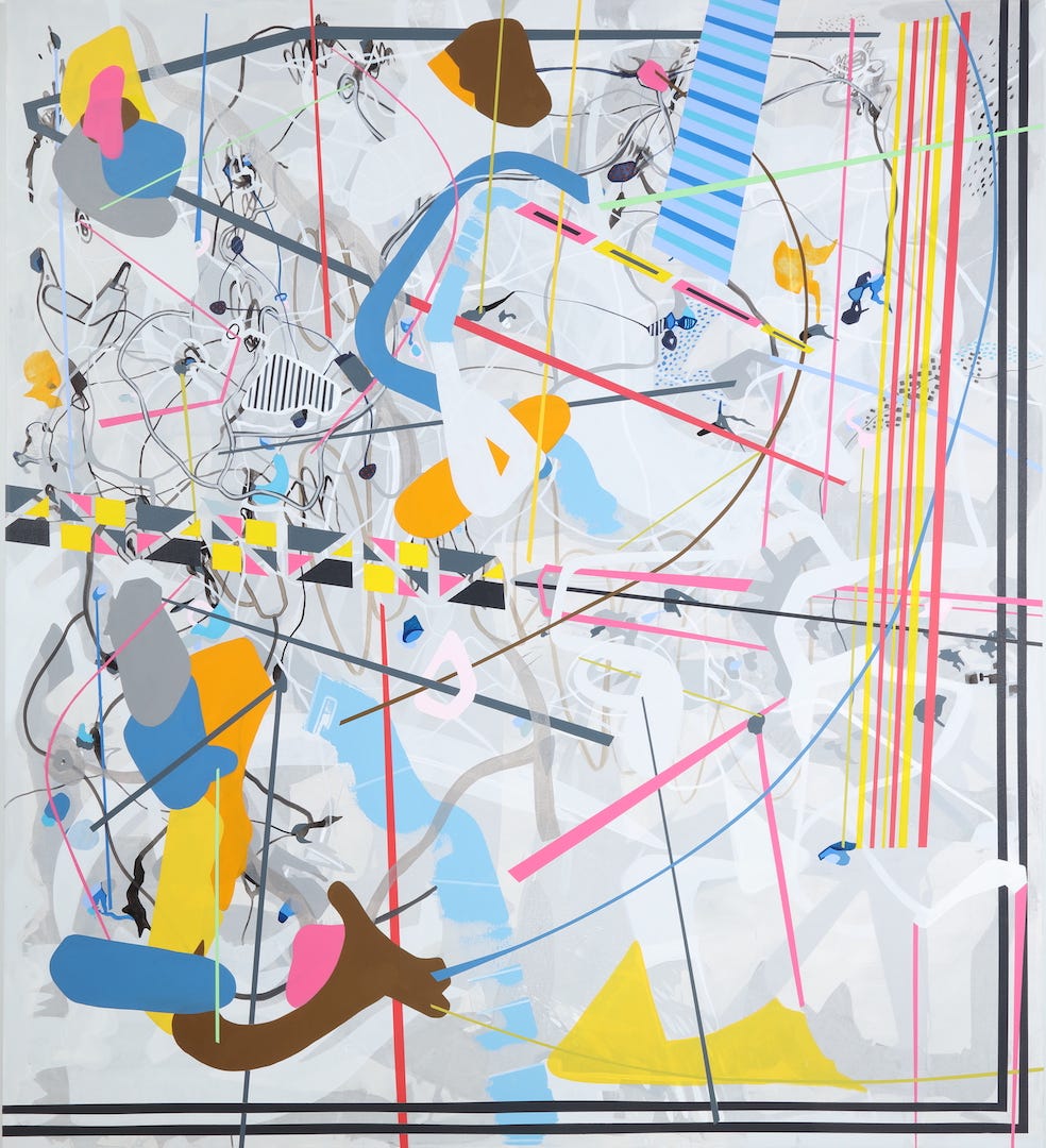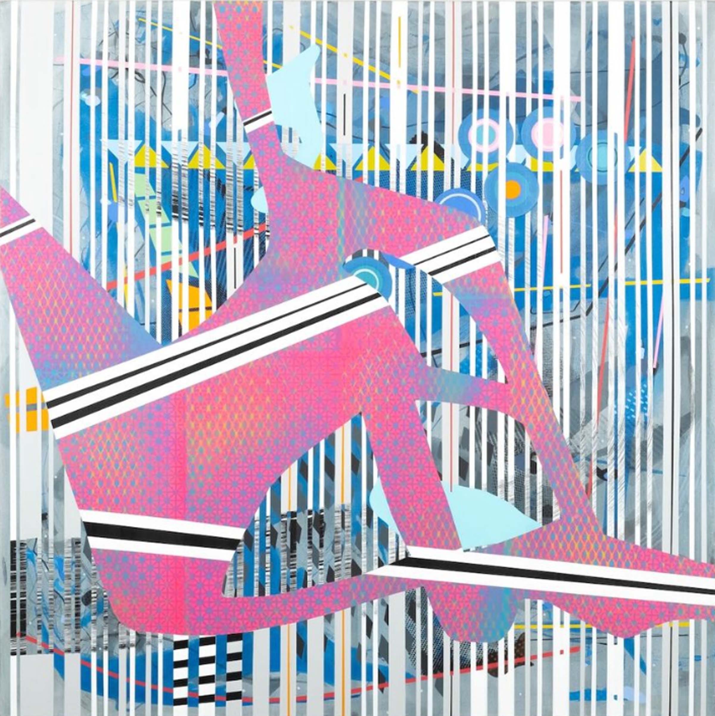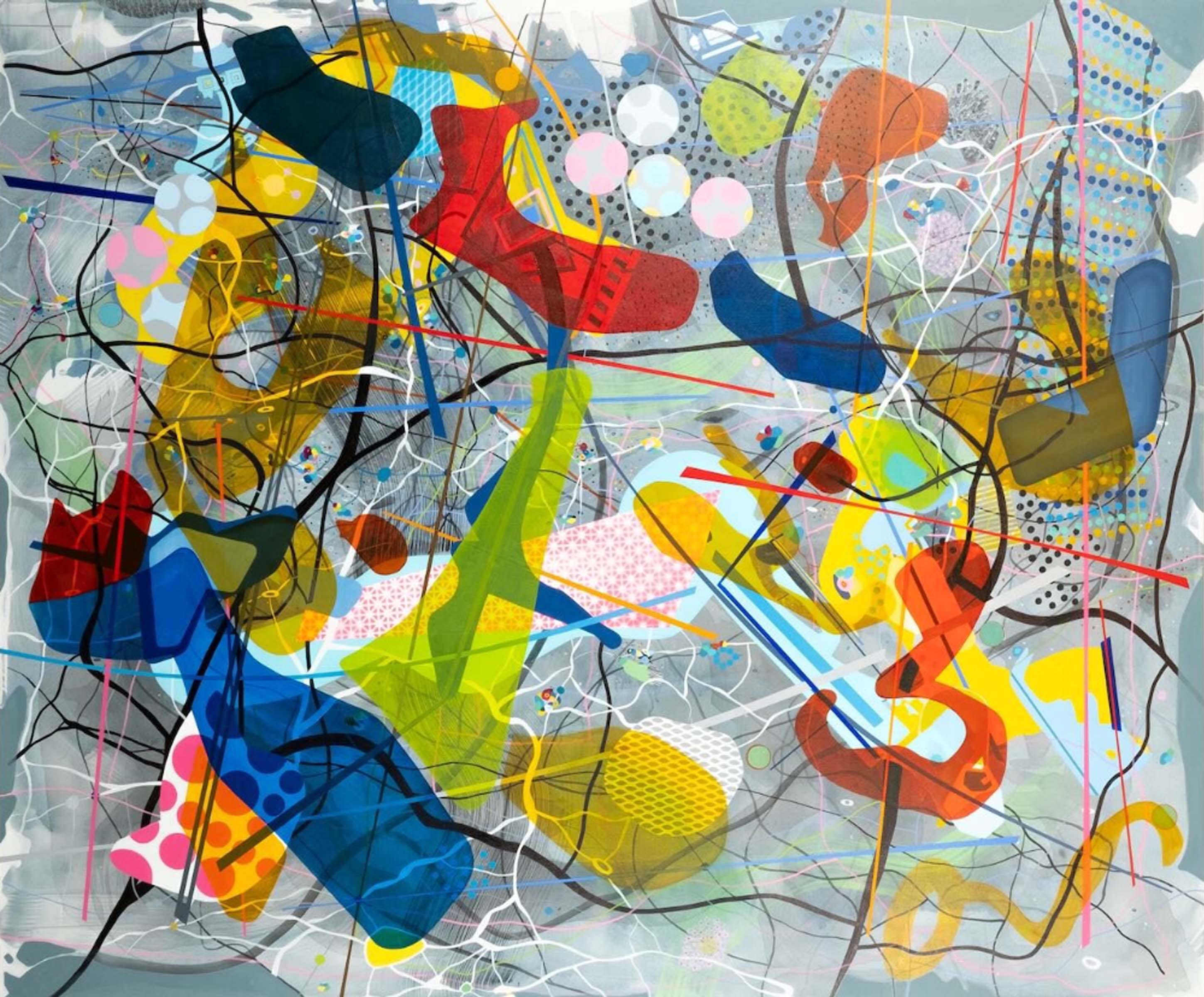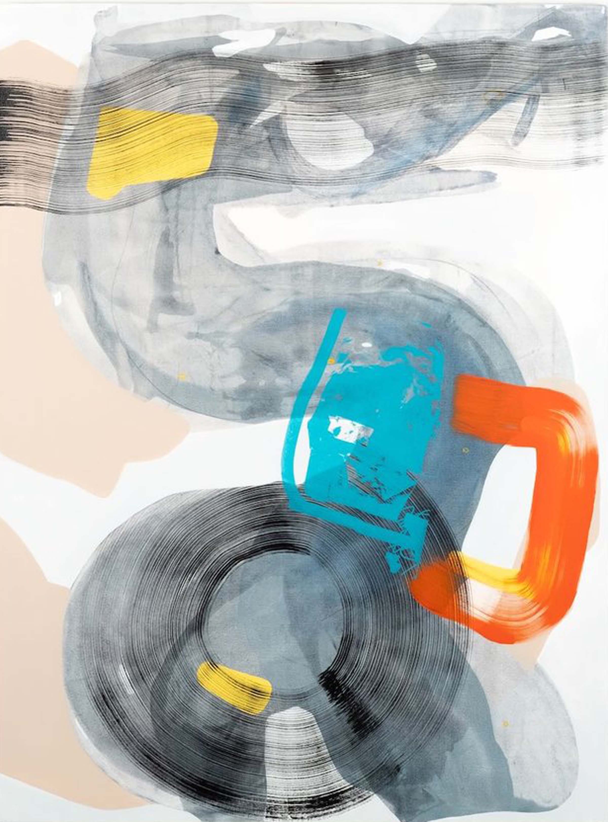 Shower Singer (pictured above), a 48-inch square mixed media work on canvas, features a pink figure on a blue and gray vertically patterned ground. Neither human nor animal, the abstract pink form contorts within the square frame, but avoids the abstracted water lines streaming down the canvas. Absent of identifying details, a shower experience still transmits. Run Out Groove (pictured below), a 48 x 36 inch mixed media work on canvas, joins layers of water and oil-based media to create an interplay of viscosity and movement. A large S-shaped veil of ink wash curling into a donut shape at the bottom of the canvas establishes a slightly shifting foundation for yellow, orange and blue stationary fragments. On closer viewing, concentric ridges within the donut shape appear to mimic vinyl album grooves referenced in the work’s title. But rather than presenting an abstracted picture of a record, Joe crafts a painterly homage to the grainy fidelity of analog sound.