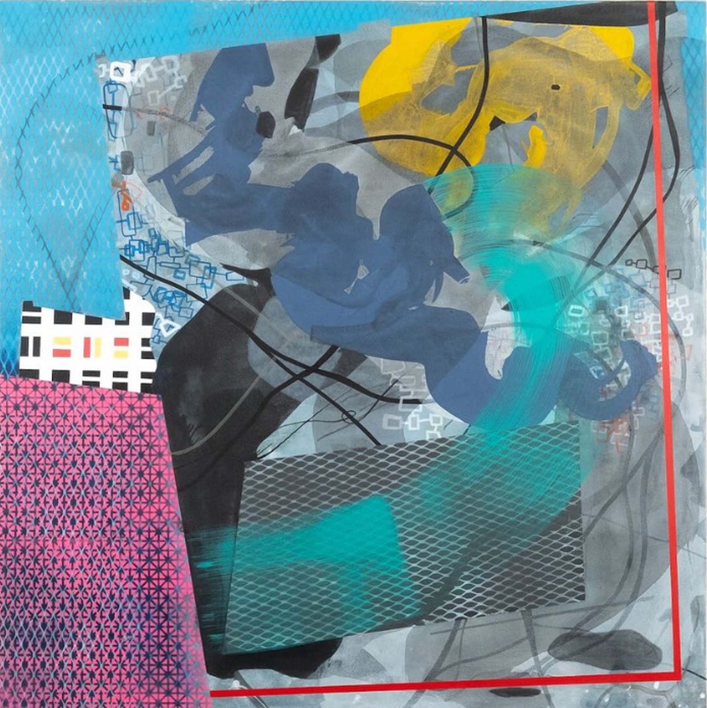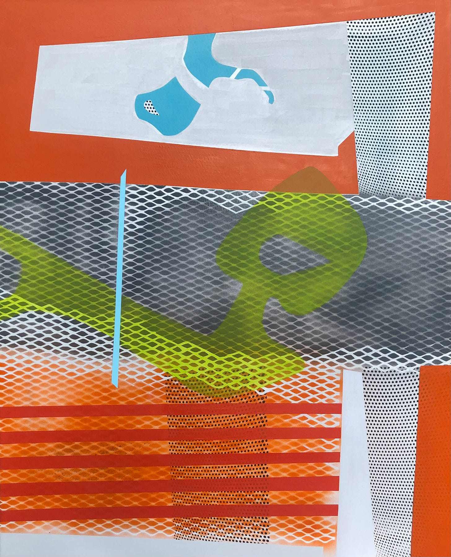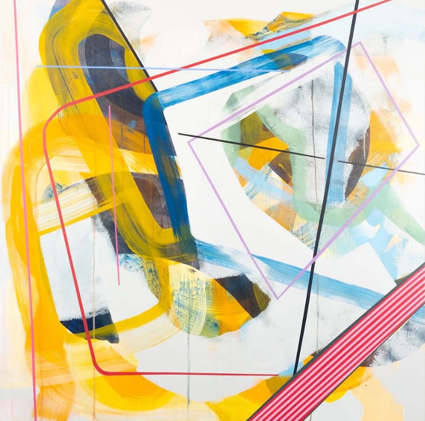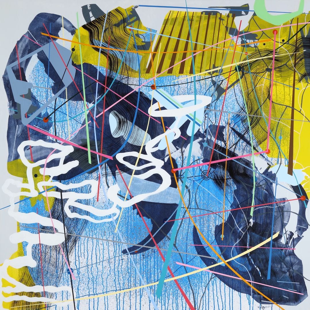 Shower Singer (pictured above), a 48-inch square mixed media work on canvas, features a pink figure on a blue and gray vertically patterned ground. Neither human nor animal, the abstract pink form contorts within the square frame, but avoids the abstracted water lines streaming down the canvas. Absent of identifying details, a shower experience still transmits. Run Out Groove (pictured below), a 48 x 36 inch mixed media work on canvas, joins layers of water and oil-based media to create an interplay of viscosity and movement. A large S-shaped veil of ink wash curling into a donut shape at the bottom of the canvas establishes a slightly shifting foundation for yellow, orange and blue stationary fragments. On closer viewing, concentric ridges within the donut shape appear to mimic vinyl album grooves referenced in the work’s title. But rather than presenting an abstracted picture of a record, Joe crafts a painterly homage to the grainy fidelity of analog sound.