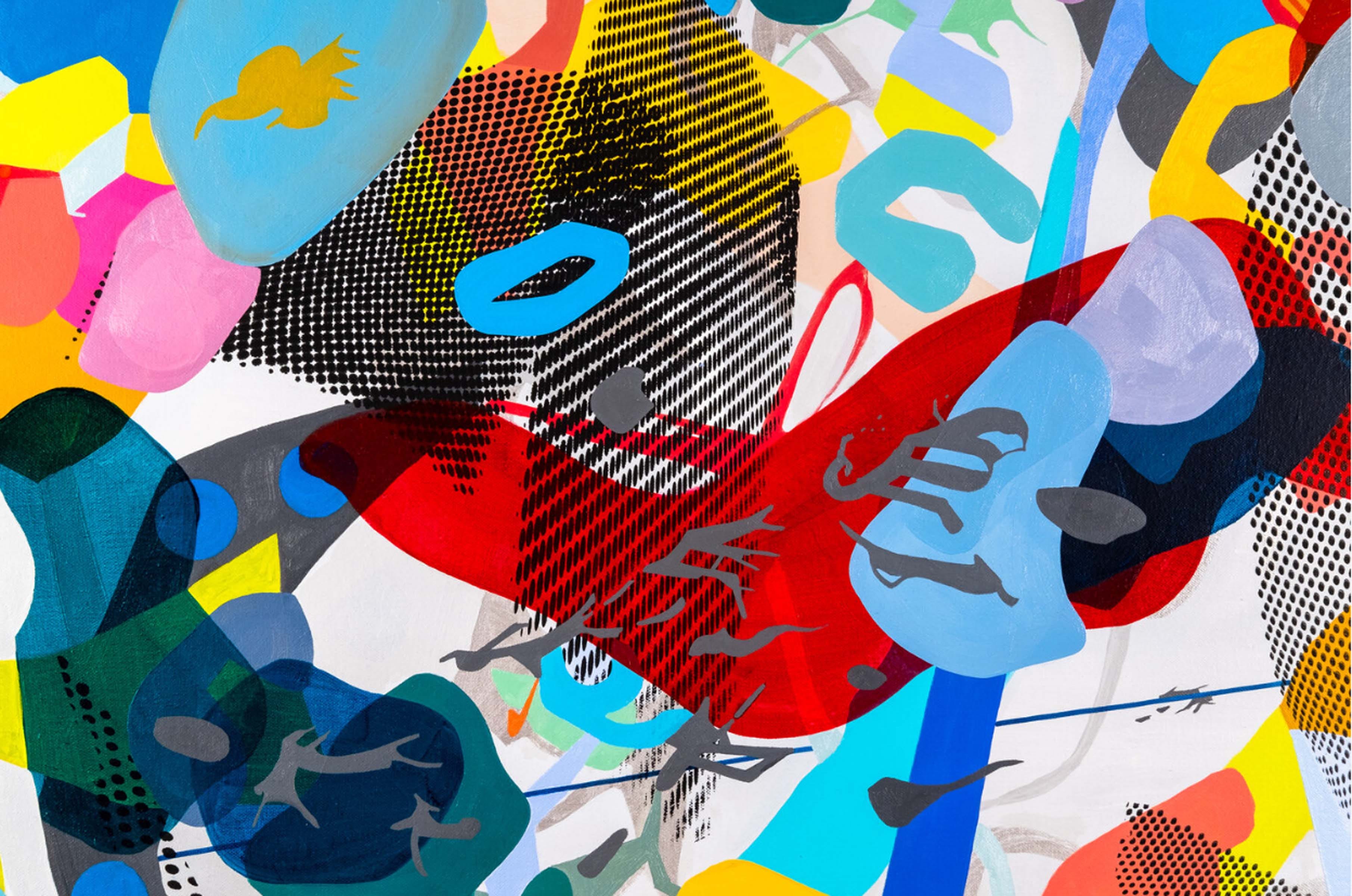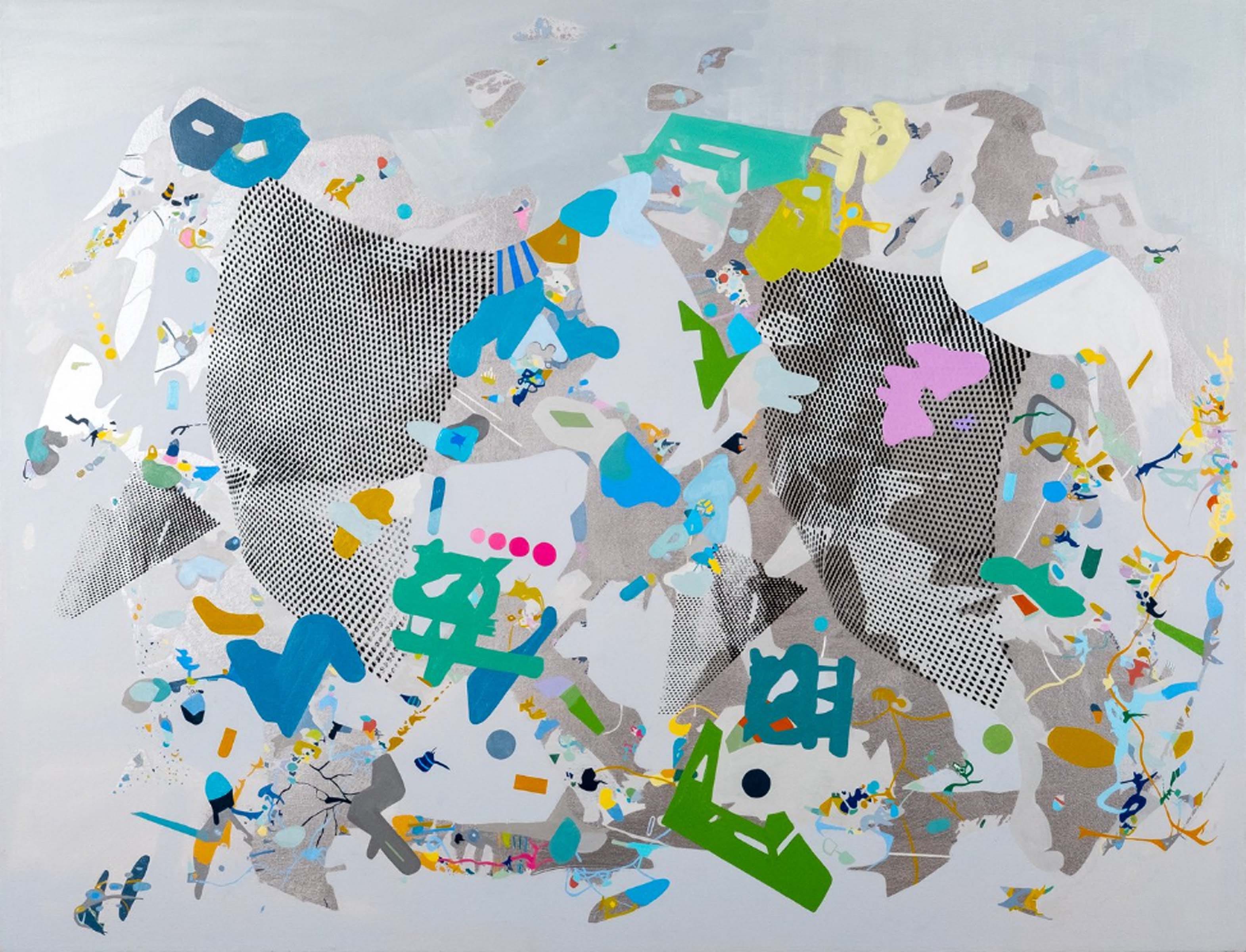 Joe’s mylar based collages forgo some of the hue saturation infusing his paintings, in trade for inky washes and angular panes of semi-transparent color. Slick surfaces with pooling swaths of black ink frequently run counter to more intentionally constructed contours. Figurative forms begin to emerge from gray ink clouds as if coalescing from smoke. Objects are suggested, but never fully revealed. Larger fields of negative space in these pieces correspondingly produce floating detachment of disparate elements, holding them together in suspended gestalt.