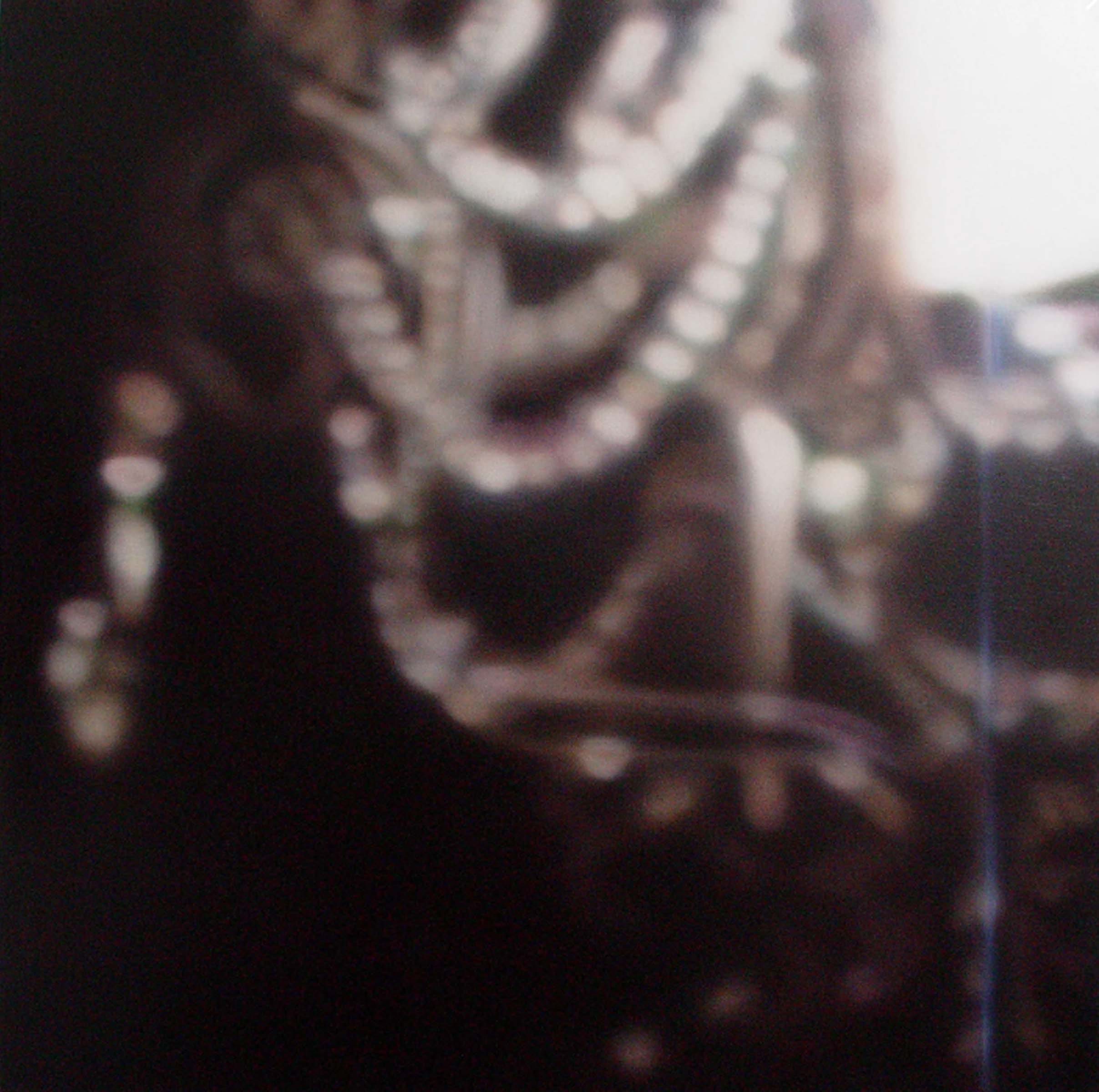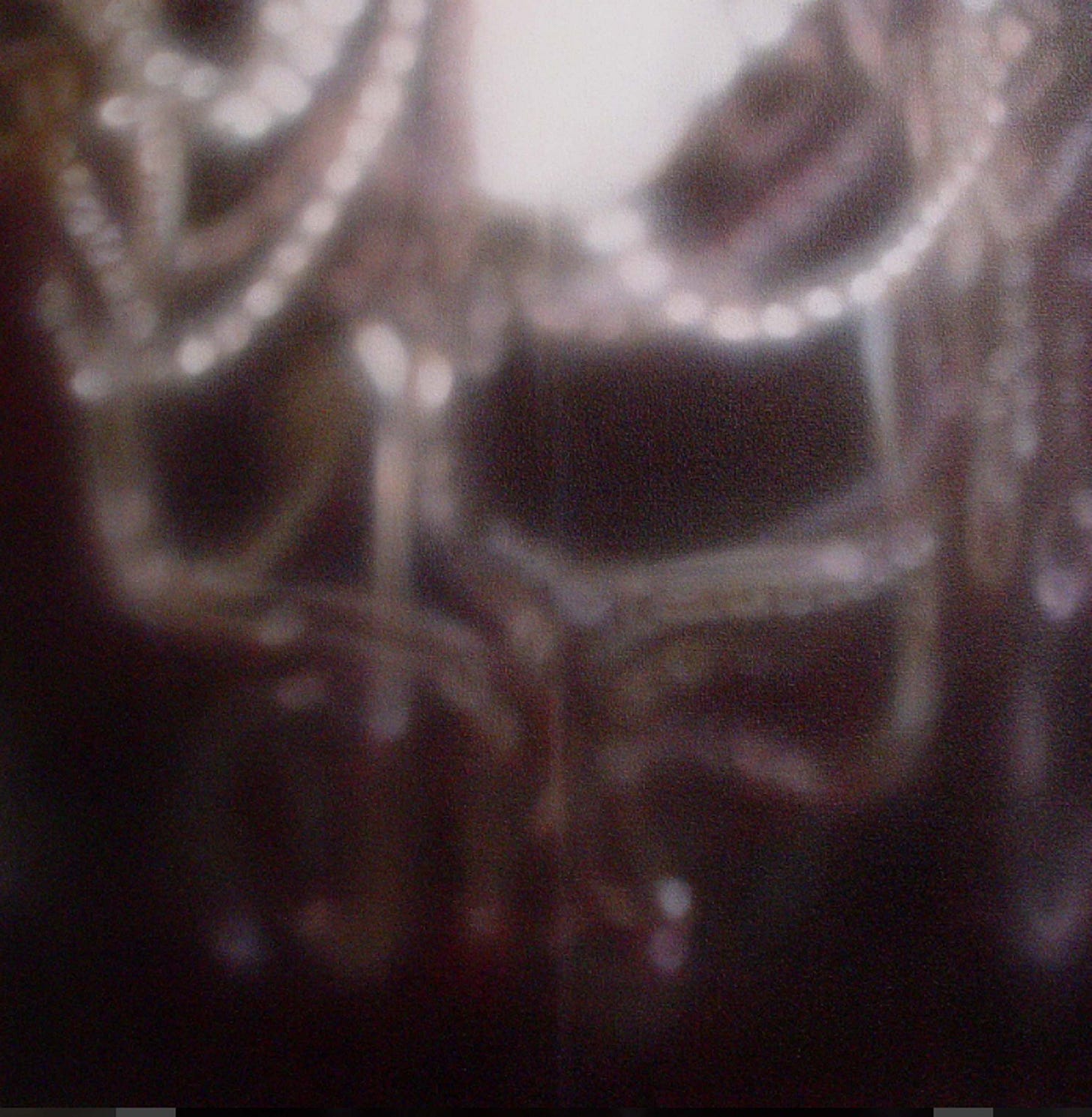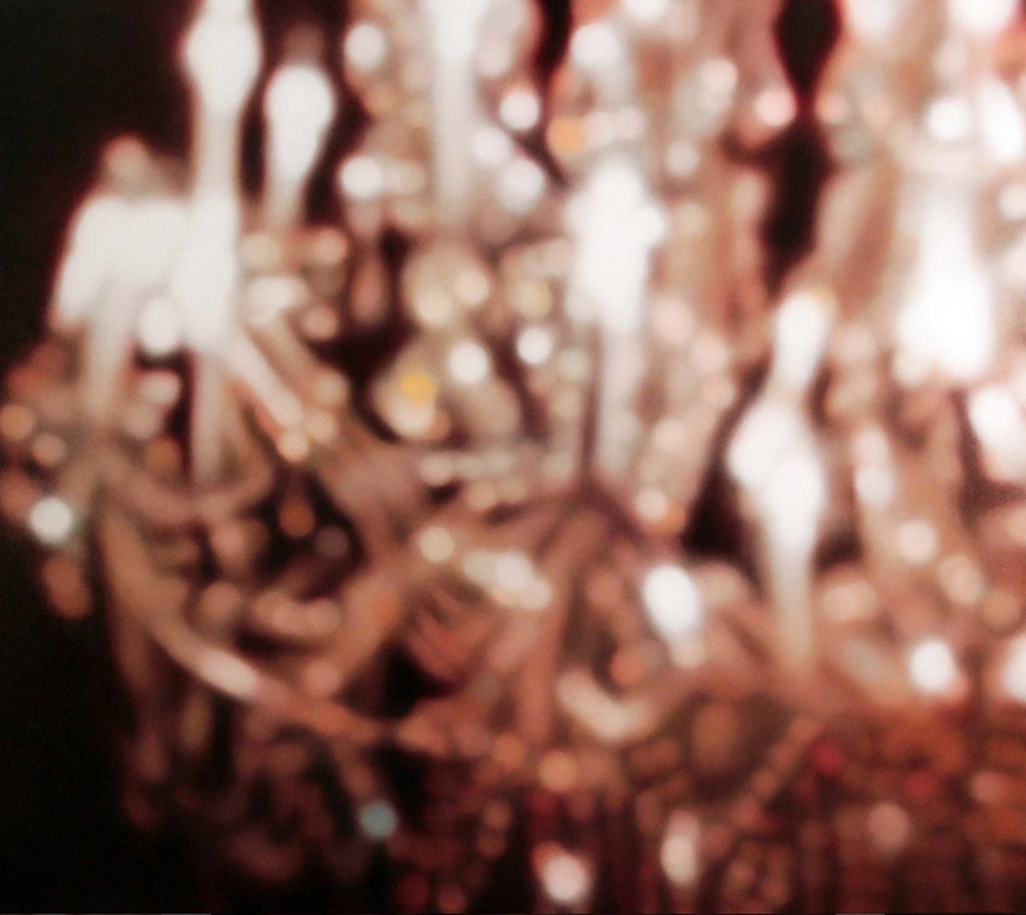 Chandelier 25 (pictured above) depicts rapid distortions in perspective and depth of field of a chandelier bathed in darkness rather than illuminating a space. As if the chandelier were decorative rather than functional, the fixture barely puts out any light, probably because the blurred distortions bring out the darkness rather than focus an intensity on luminosity. We are taken back by the striking appearance of what would otherwise be a familiar object by the distortions of light and penetrating shadow.
