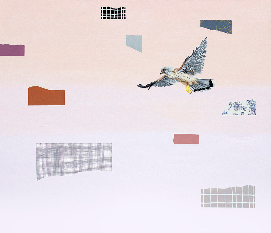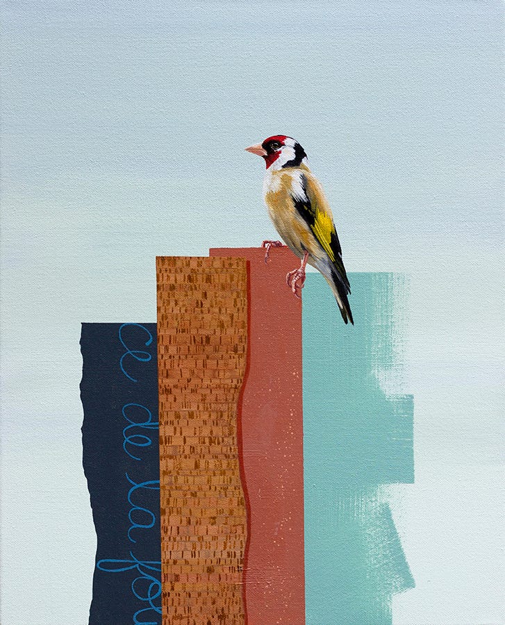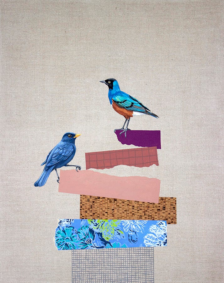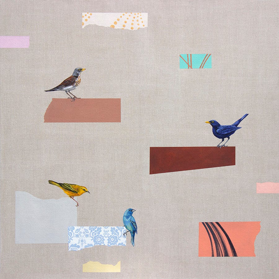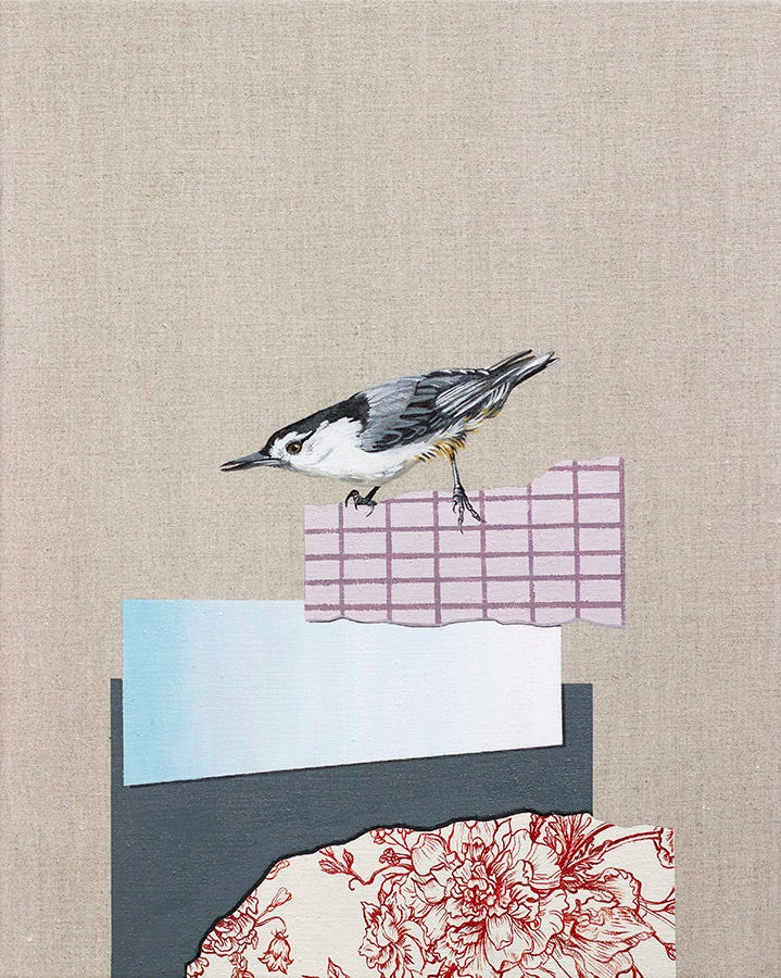 Lauren Matsumoto creates poetic art which represents aesthetics around nature, not in direct depiction but in interaction with human-inspired formations. These subtle, quiet, and pleasant works portray birds gently invading our indirect unconceived notions of space. Her works are a study in the playfulness and elegance of the natural word in the representations of birds with intricate coats of feathers which reflect design relationships with the composed collages. The art also remains a study in behavior in interaction with unfamiliar surroundings in the representation of flat surfaces. These works reflect an artist captivated by philosophical approaches to space and what such relationships with volume means for us.