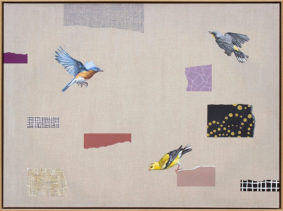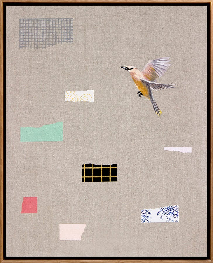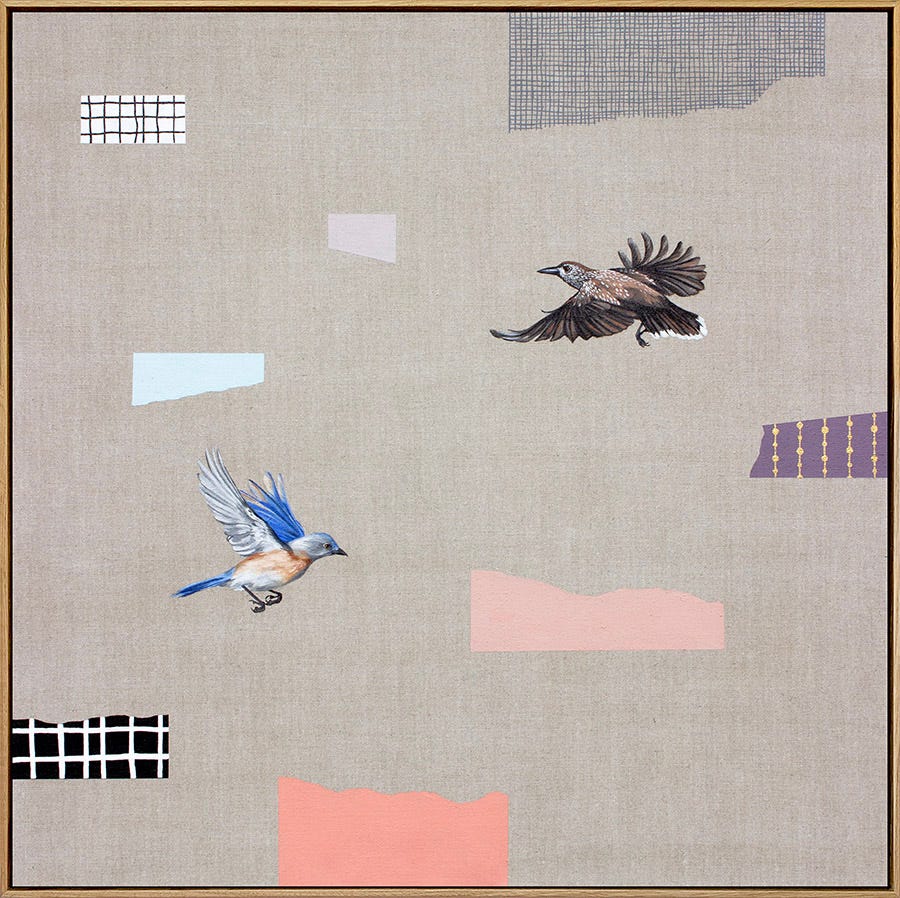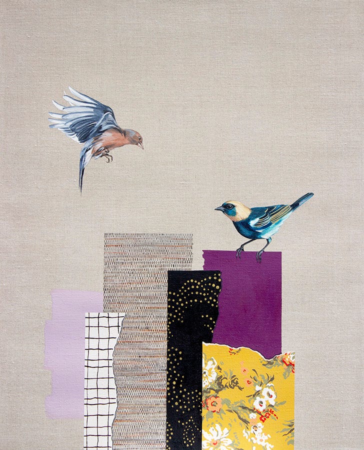 The paintings are representations of birds in mid-flight or perched upon rectangular designs. Depictions of animals in art often come across as kitsch as they elicit feelings of cuteness and cliche fluffy affection; however Lauren uses elements of negative space, painterly realism, flat modern / contemporary design, and a monotone or linen surface to create a fine art interpretation of creatures. The vast negative space contains collages of magazine clippings of designs or small rectangles of painted delineations. A majority of the paintings usually contain a raw linen surface or monotone pale-warm backgrounds with subtle gradation. In a way, the painting resembles a metaphor of the relationship between nature and human-created structures, but using formations of patterns rather than literal structures such as architecture or cages. With a fascination and family history with birds, Lauren paints the fowls with great and colorful detail in a manner in which they interact with the space of the surface or with other birds as if the canvas or linen were a natural environment.