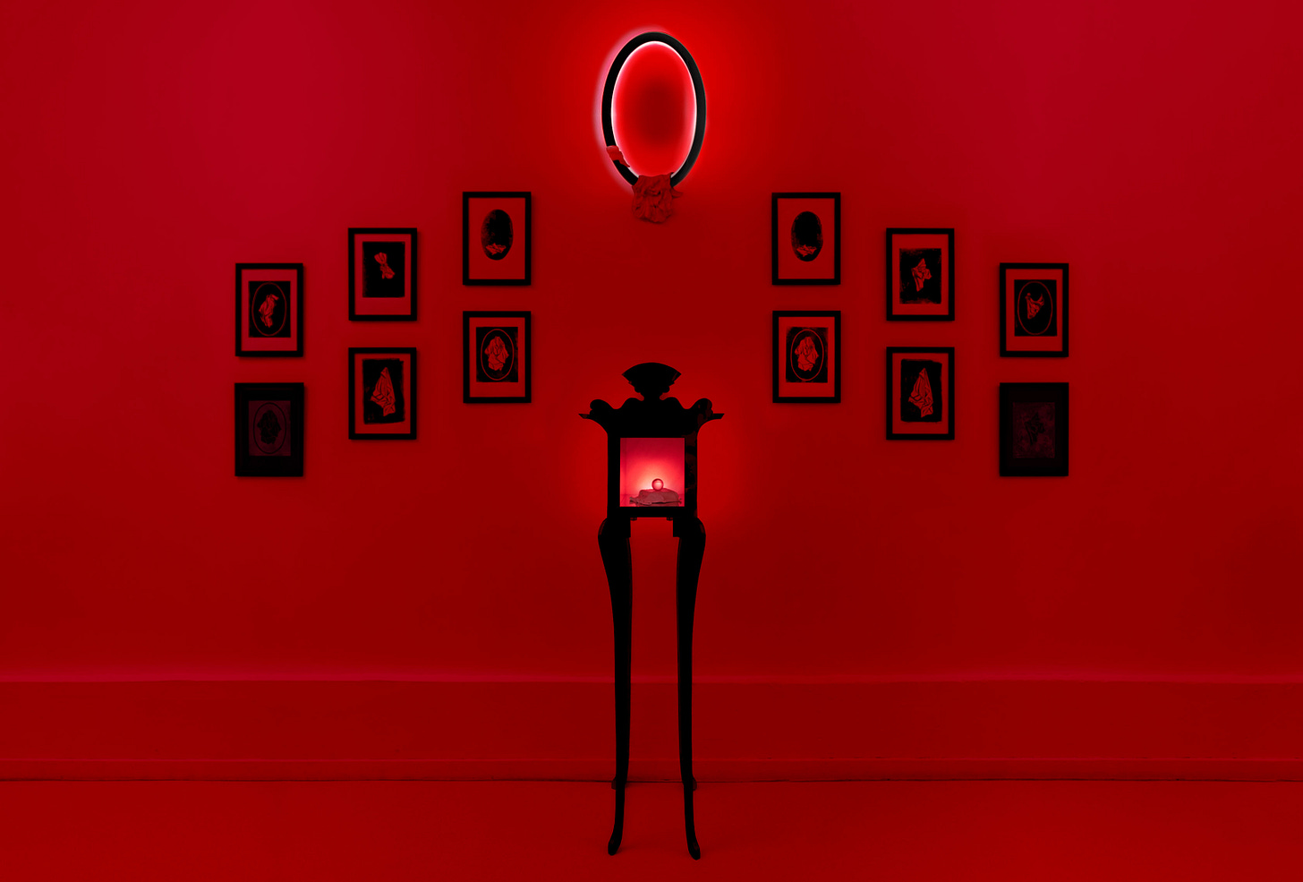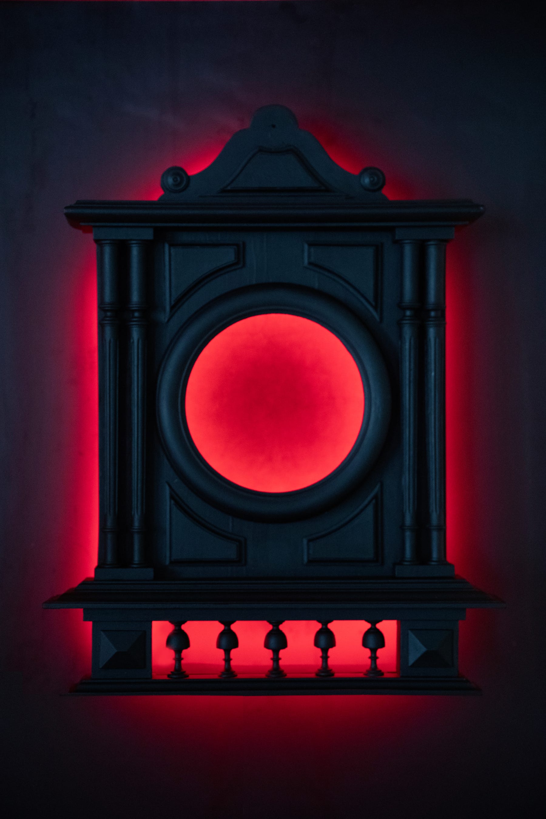One of her most immersive pieces consists of an olfactory installation titled Temple of Saturnus (pictured above). The installation remains a shrine to the ancient god Saturn and to the titan Kronos (Cronus). Lisa uses descriptive traits in the contemporary shrine to characterize these ancient deities, such as using the emanation of red light symbolizing the violent nature of Kronos devouring his children, while the black color of the clock represents Saturn in terms of the night and restriction. Lisa constructs the shrine in the shape of a French clock with Roman and Greek structures of a facade containing stereobate, doric columns, entablature, and pediment. The smell of spiritual incense seeps from the installation as if to put the viewer in a daze or dream-like status reflecting on ancient gods and titans in a contemporary fashion.