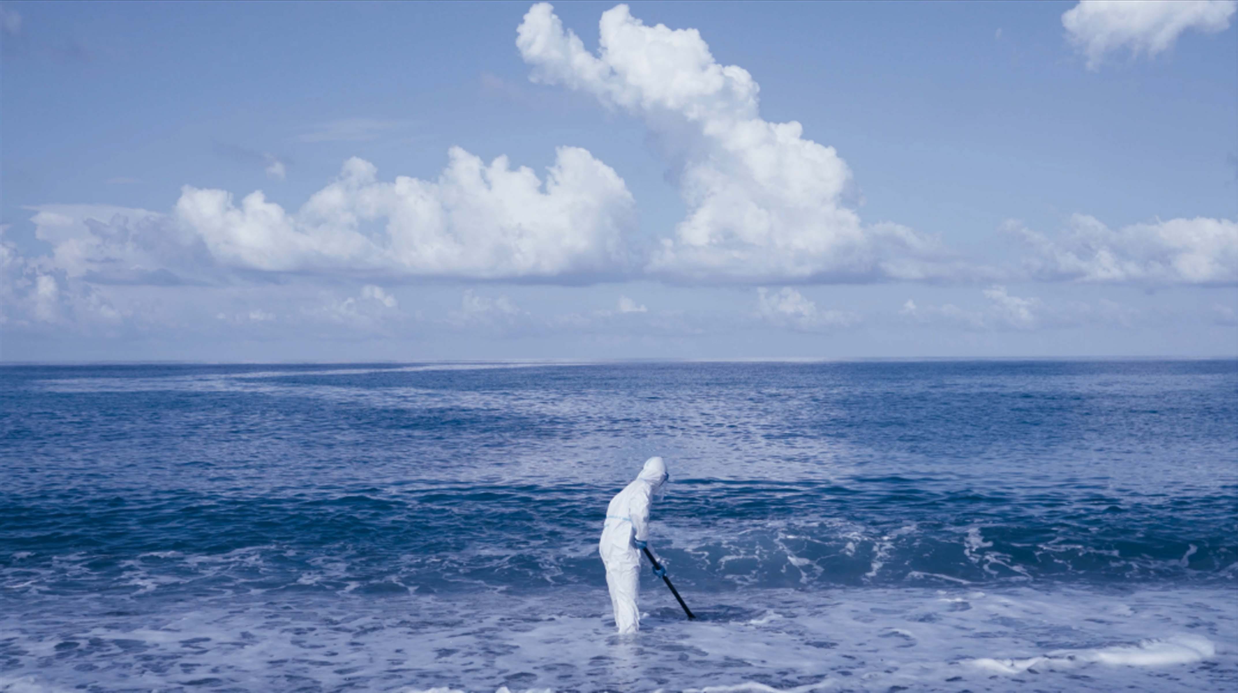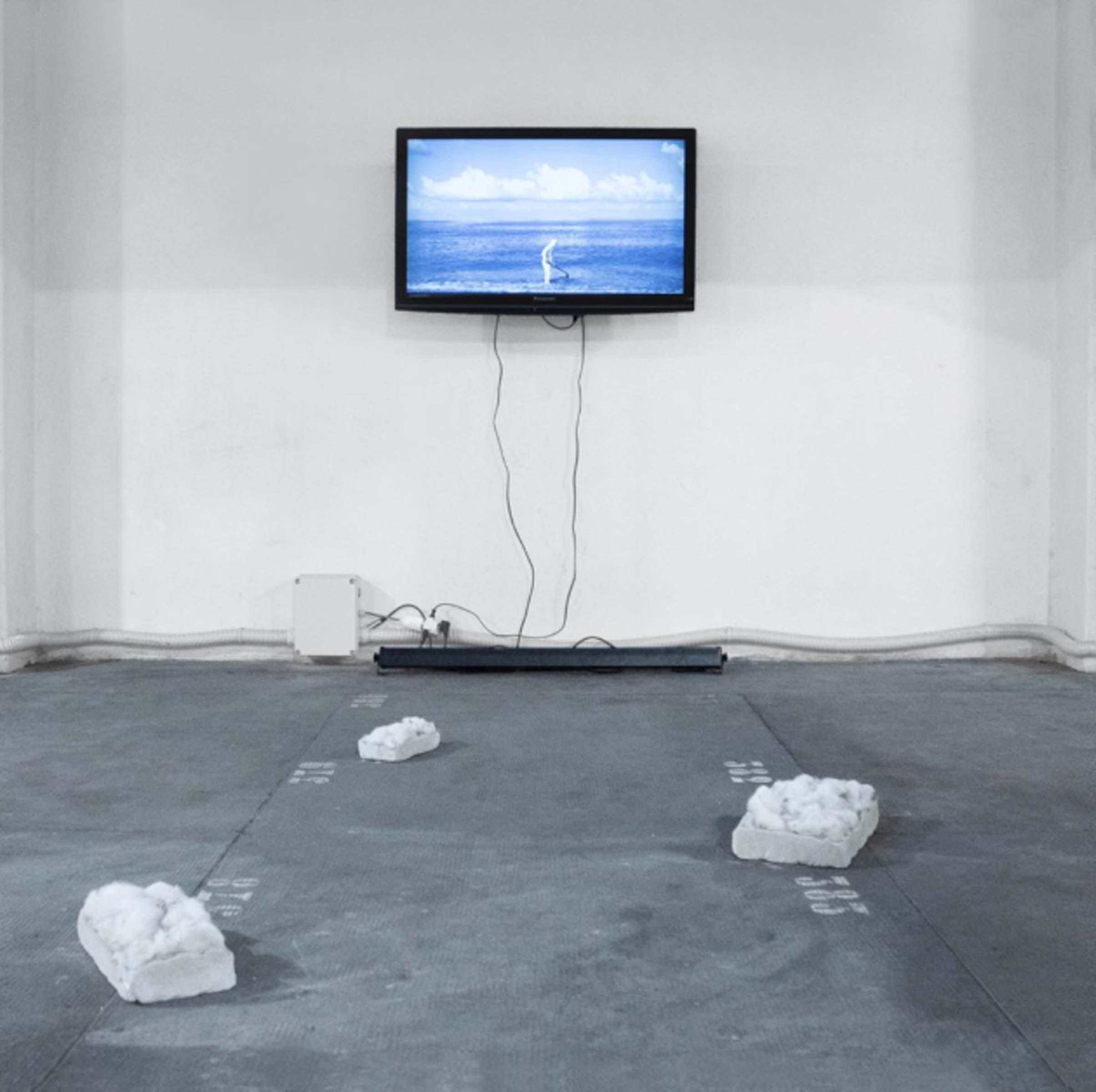 Probably the most interesting performance art out of his body of work, Hoeing the Sea (top of article), contains video of a man clothed in what looks like a hazmat suit…literally hoeing the sea. The performance has been displayed as stand alone and either integrated into an installation with pieces of debris which appear like broken up concrete with pieces of cotton attached. Indicating a relationship between humanity and nature, according to Luca the performance also contains metaphors towards the contemporary humanitarian crisis of 114 million refugees in the world, as well as persecution and human rights violations. Performing an illogical and impossible act of farming the sea as if land were there acts as a form of protest towards current world conditions.