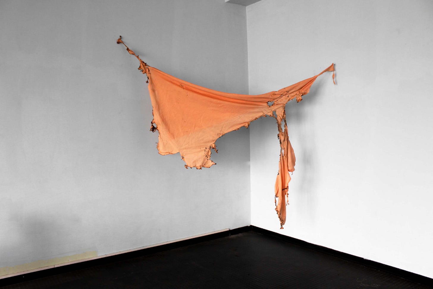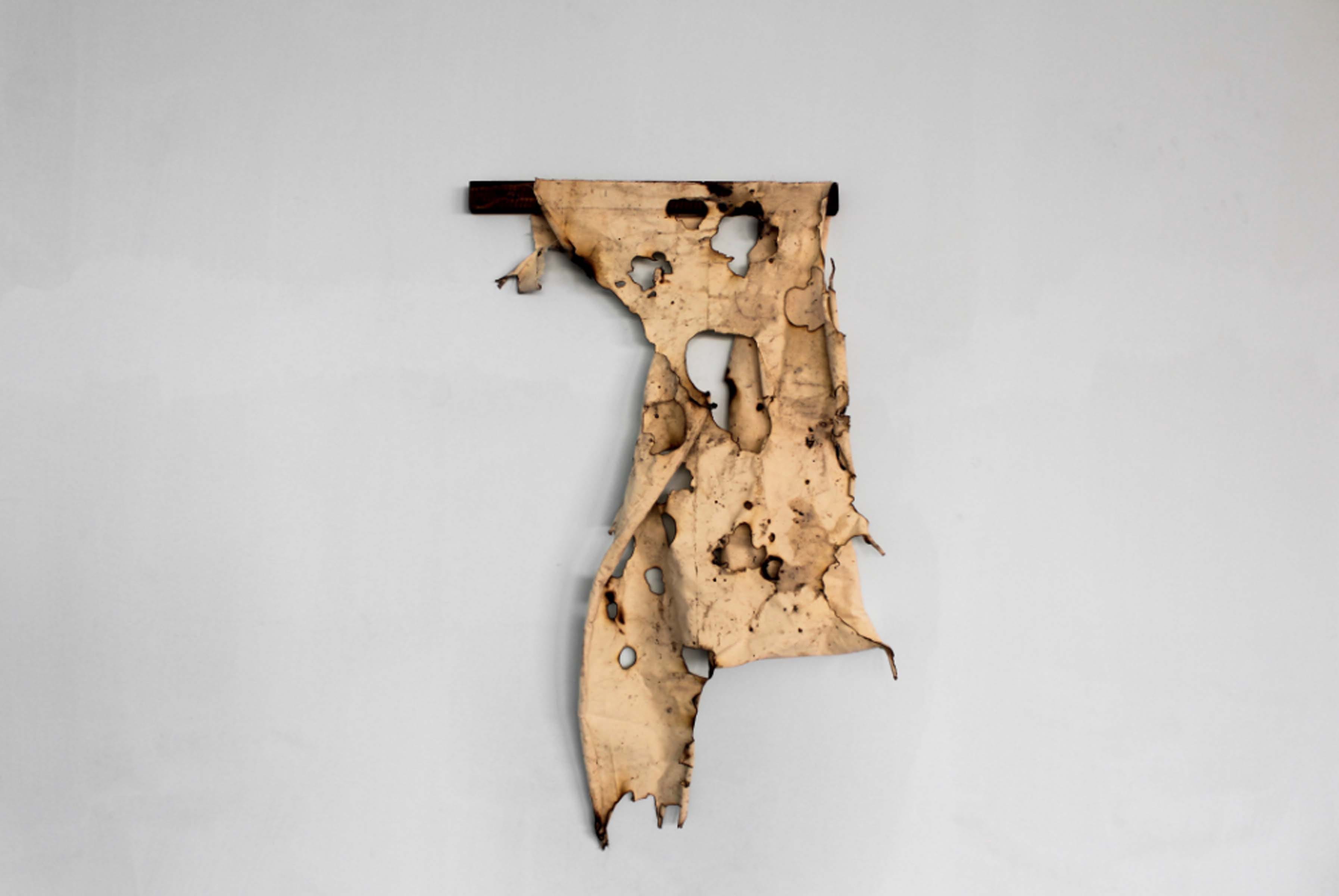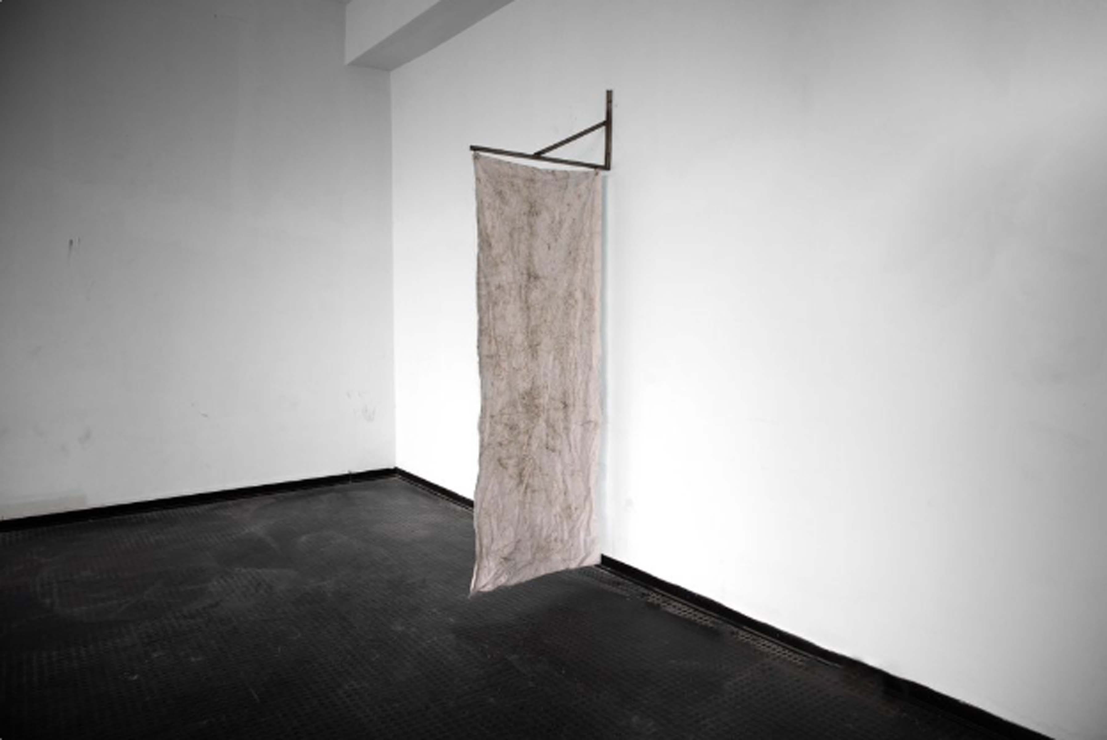 Returning back to the burned fabrics, these works could be interpreted as lashing out against feelings of oppression and repression. The pieces seemed to have a controlled burn as if the artist was sculpting with fire. Artworks which are intact such as Sentimental Flag (pictured above) contain mechanical traces of dirt, dust, and smeared debris. A statement made with a dirty, worn out flag with crinkles suggests the artist making a commentary on nationalism. The title even suggests the flag as a reference to nostalgia in a world increasingly becoming more associated with globalization.