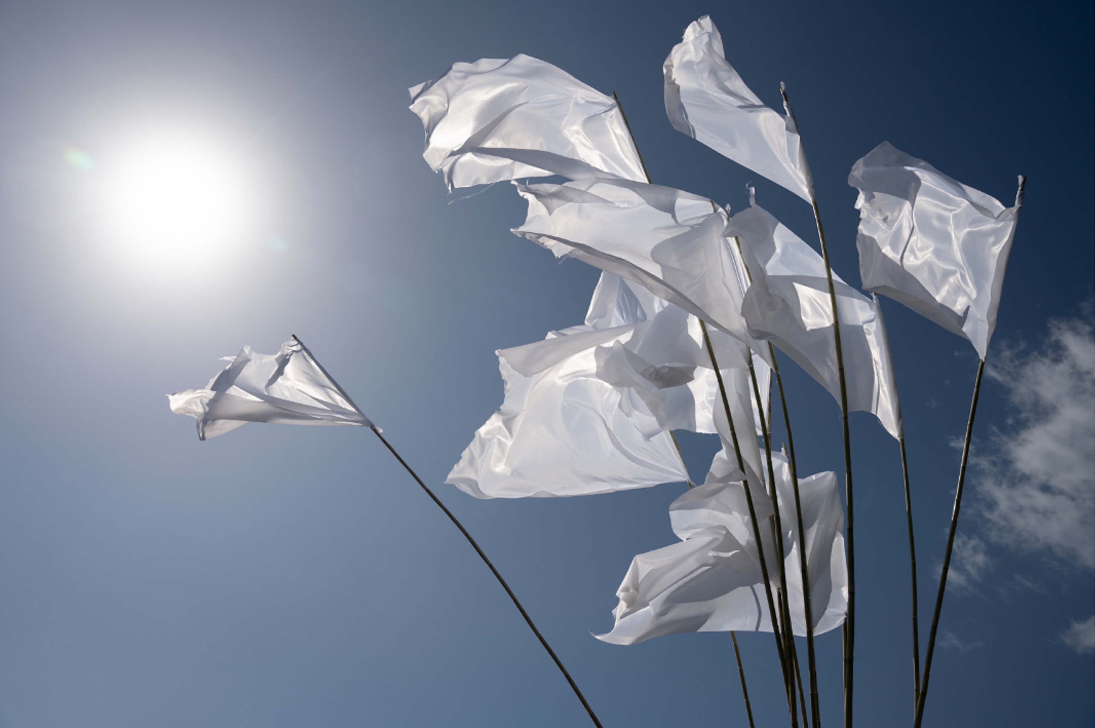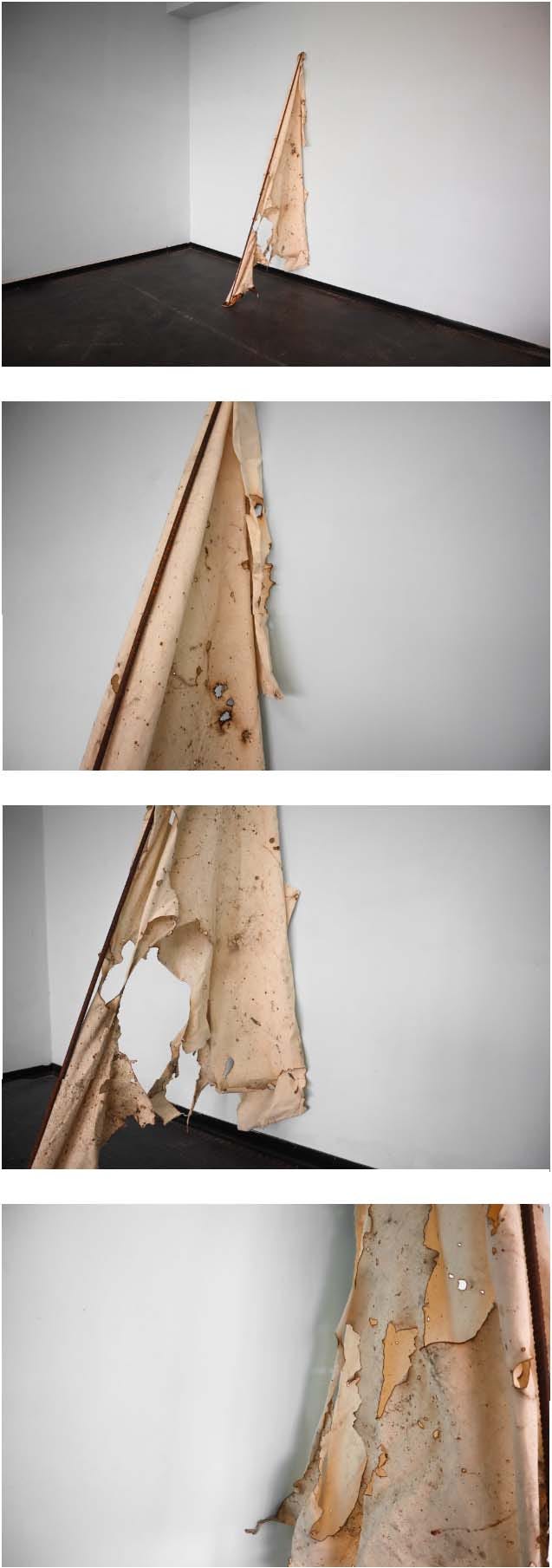 With an anthropological approach, Luca explores the sociological context of our environment. The works often contain the use of cotton fabrics displayed similar to or literally like flags, usually torn and burned. These contemporary standard bearings imply chaos and destruction as seldom few of them are left intact and even the ones which are whole are smeared with grain and dust. One piece which contains clean, intact cotton standards, Places Surrendered (pictured below), does not imply surrender but in actuality resistance to repressive governments and cutthroat market ideologies. A directed project of handmade white flags constructed and hand-carved out of bamboo and white cotton placed along Maremma National Park.