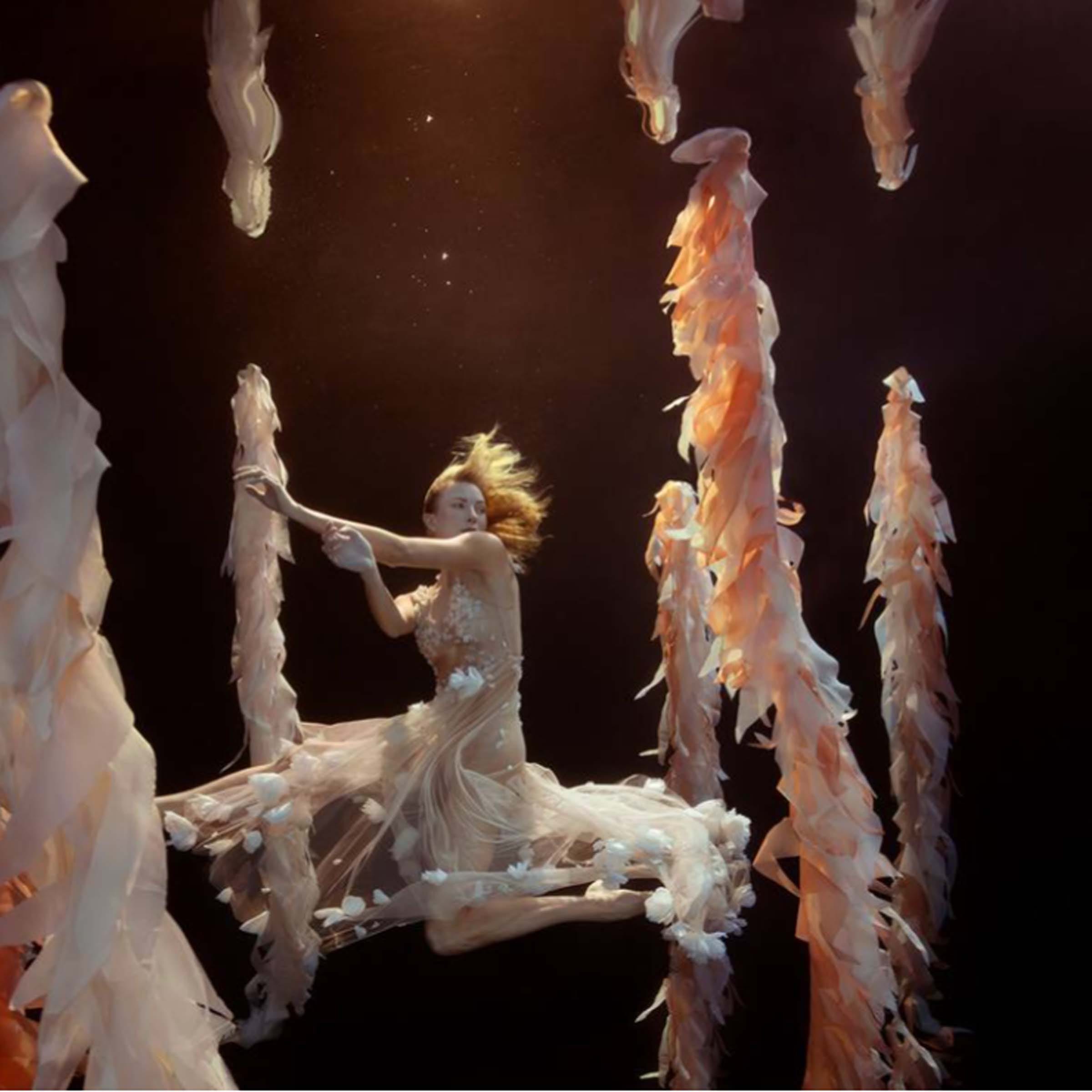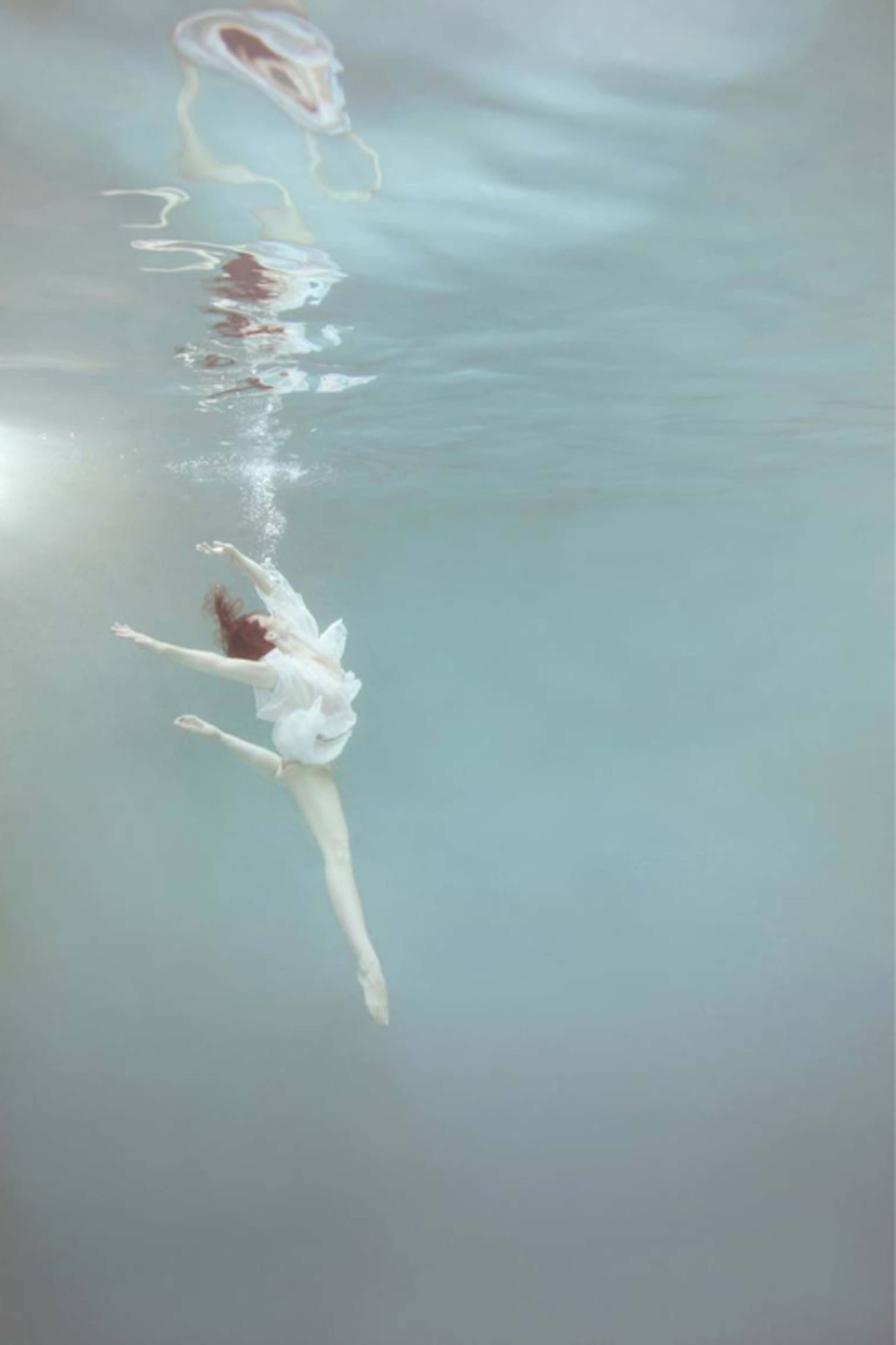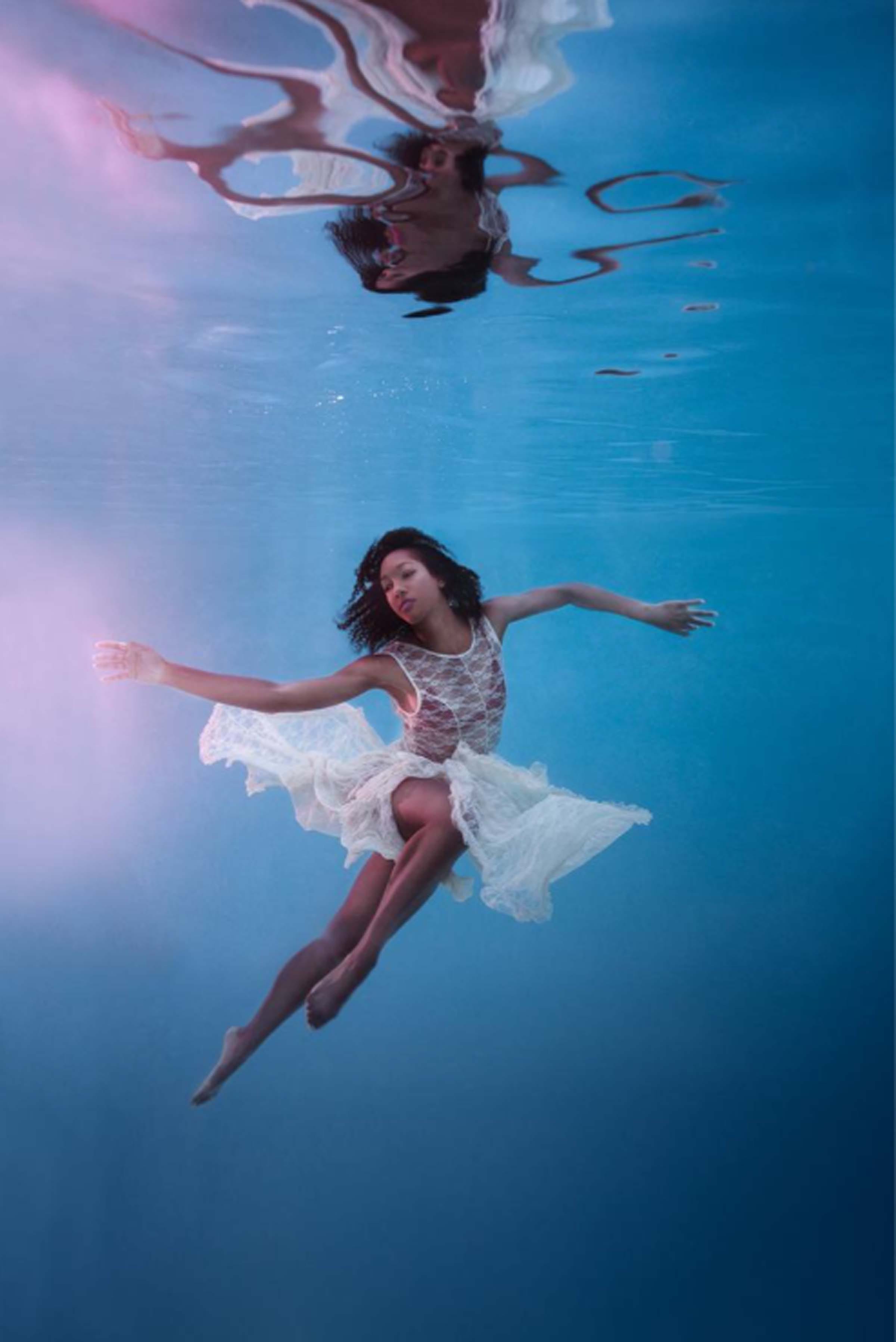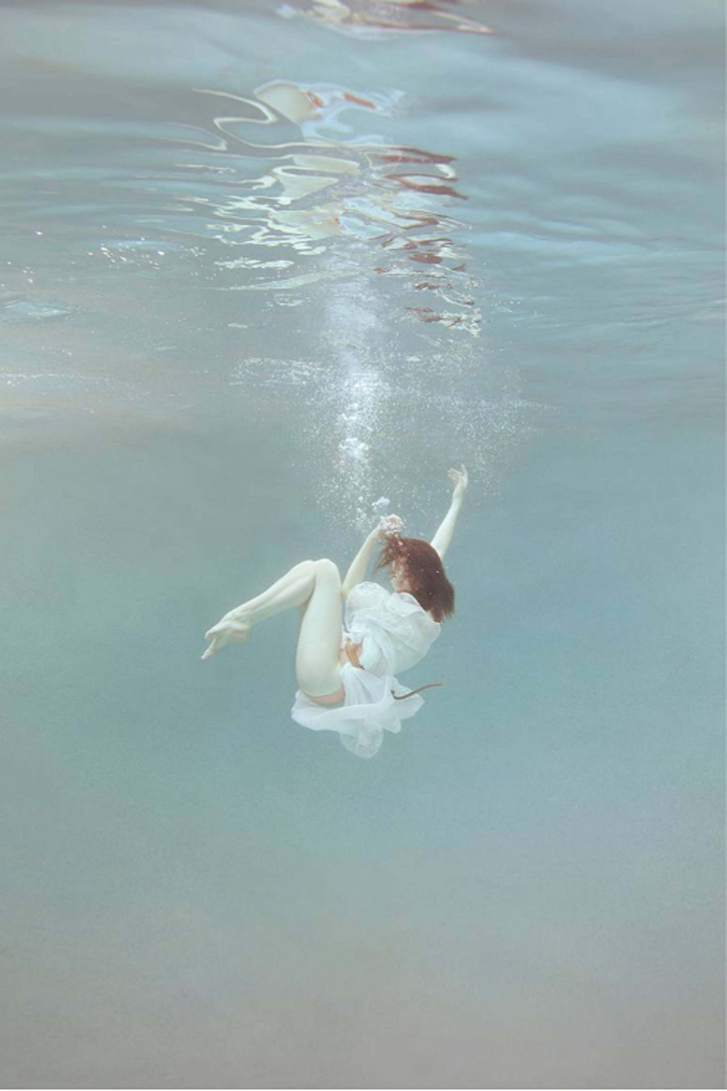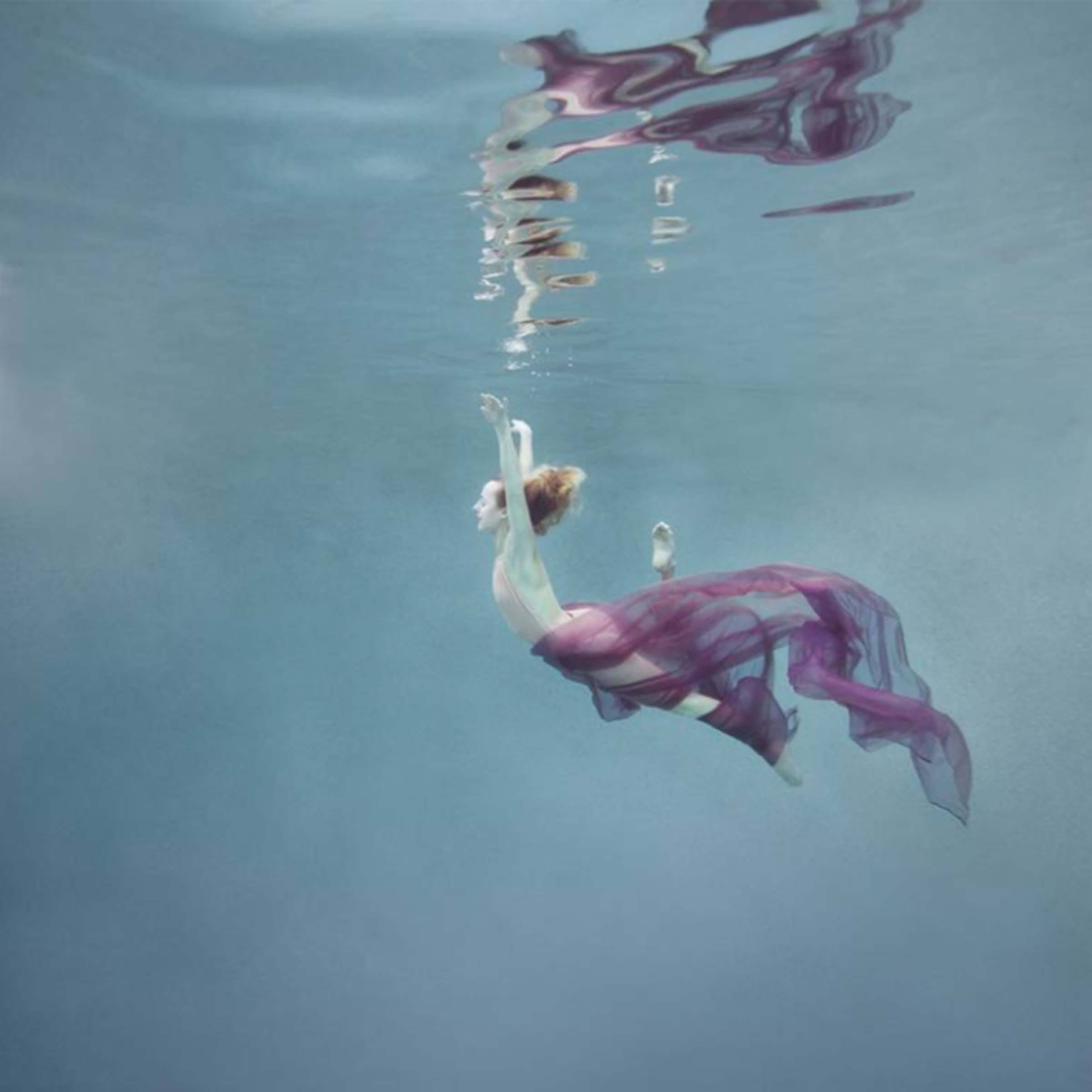 As a former ballet dancer with 24 years of experience, Mallory felt the art form was restrictive in the inherit temporary nature. In water, Mallory can capture her models dancing in complete suspension giving her time to portray the right pose as opposed to the finite seconds of leaping through the air in gravity. The figures appear as if almost frozen, captive within the subtle light penetrating the water with their limbs, attire, and fabric flowing organically amidst the aqua. With a sense of suspense and suspension, the figures dance dramatically, extending their limbs and curving their torsos which express emotional impulses. The color of the lighting within the water creates a sense of deep aesthetic rhythm which softly caresses the curvature of the figures.