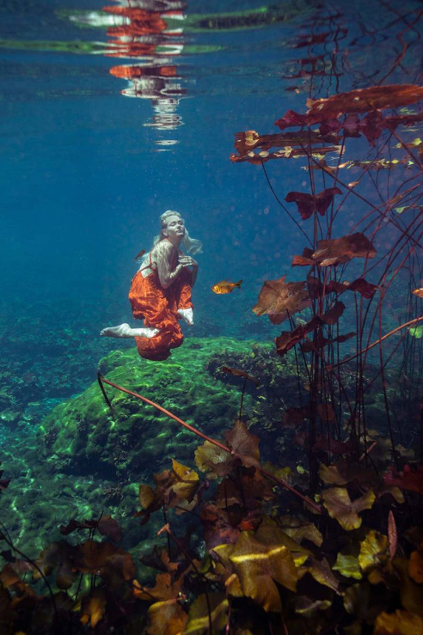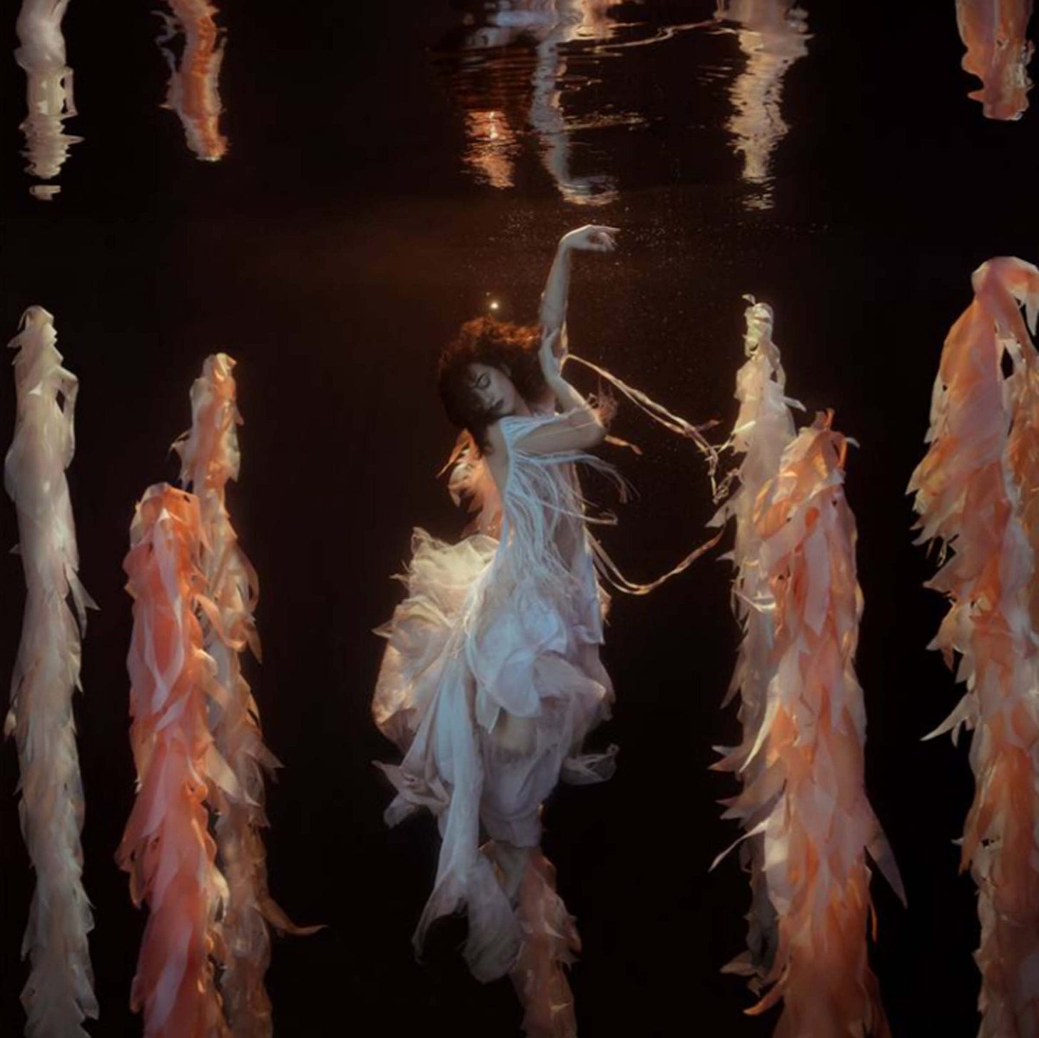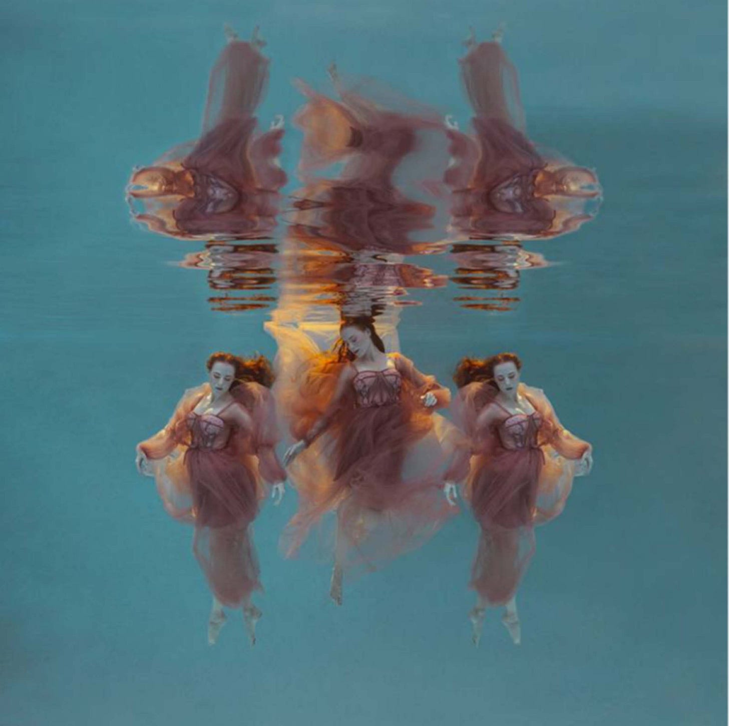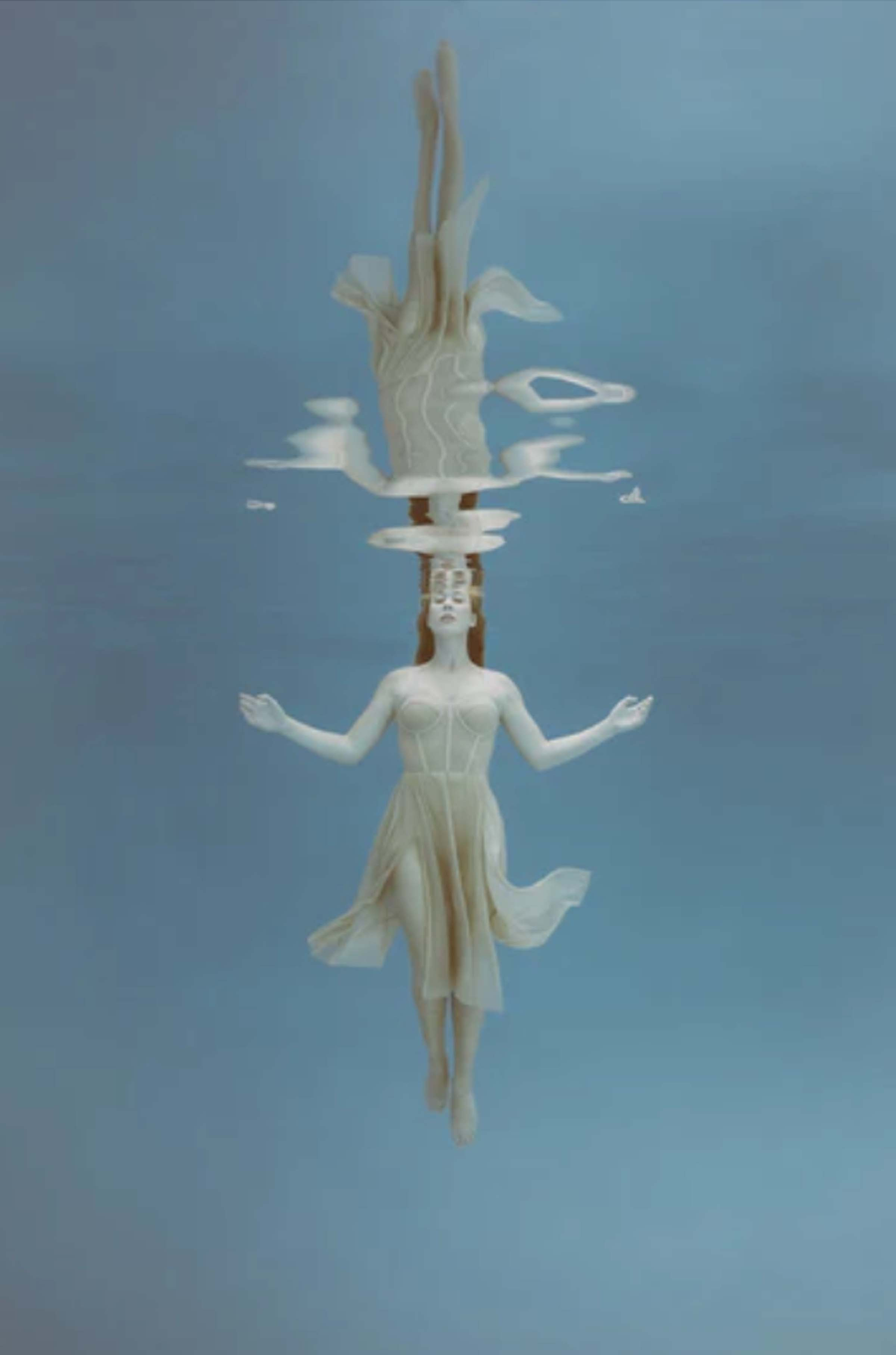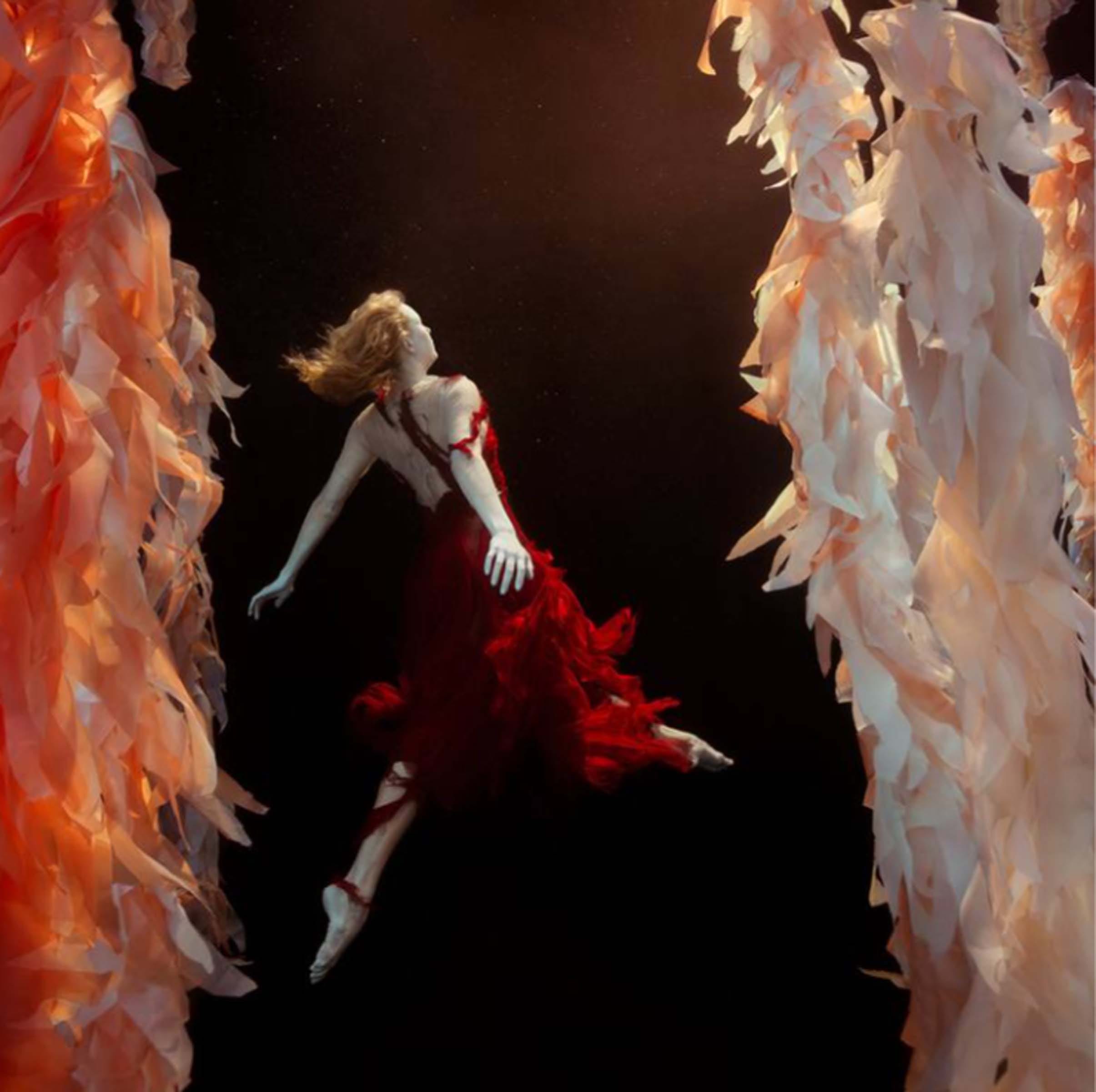 As a former ballet dancer with 24 years of experience, Mallory felt the art form was restrictive in the inherit temporary nature. In water, Mallory can capture her models dancing in complete suspension giving her time to portray the right pose as opposed to the finite seconds of leaping through the air in gravity. The figures appear as if almost frozen, captive within the subtle light penetrating the water with their limbs, attire, and fabric flowing organically amidst the aqua. With a sense of suspense and suspension, the figures dance dramatically, extending their limbs and curving their torsos which express emotional impulses. The color of the lighting within the water creates a sense of deep aesthetic rhythm which softly caresses the curvature of the figures.