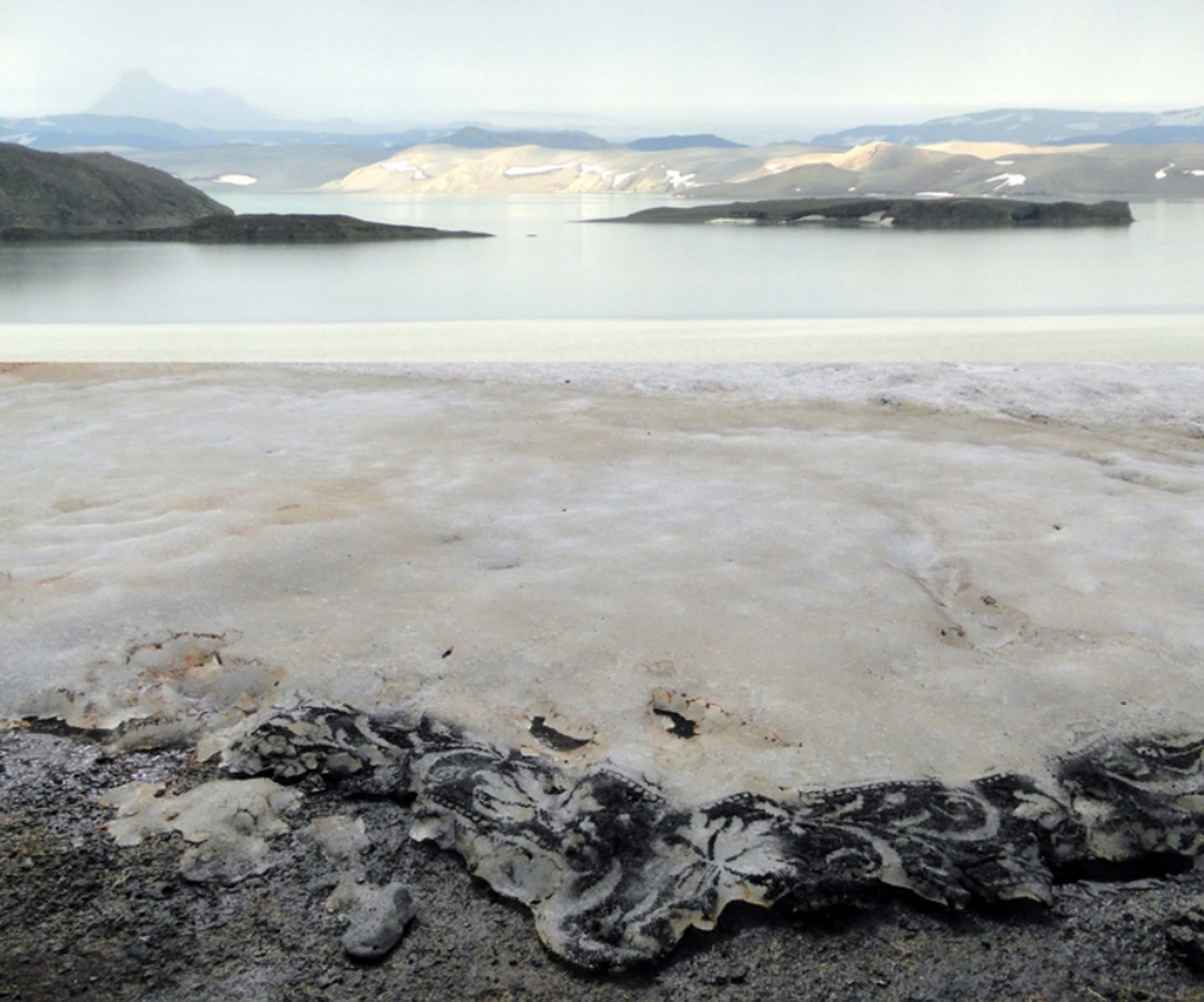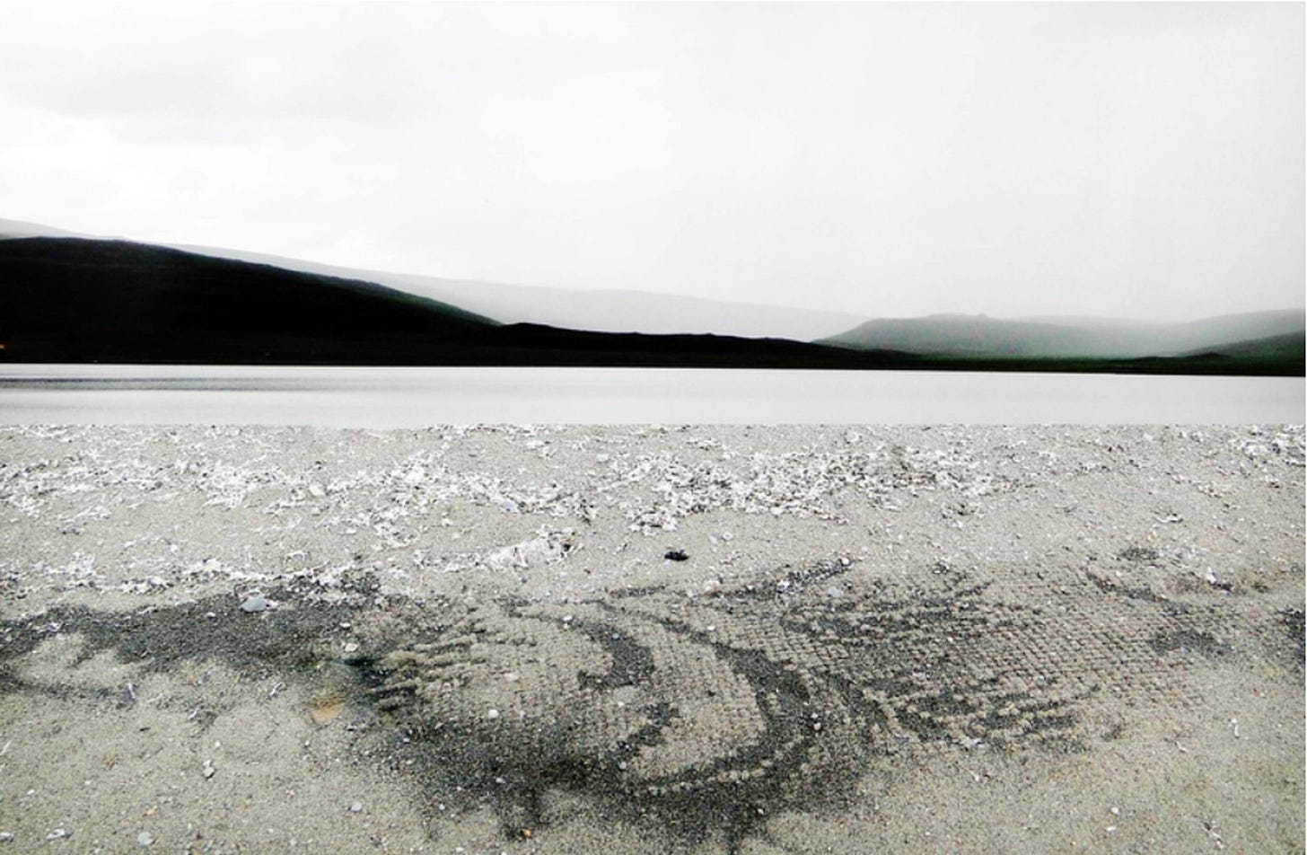 Westfjorde / Island (pictured above) remains an installation piece of sand art poured and designed onto an unfamiliar landscape of what could be interpreted as a lake shore filled with salt or lime deposits. A pristine pale white landscape lays upon the composition while hints of darkness in small distant mountains and the black sand in the foreground for which Margret has poured her creativity on. The design reflects florals and intricate foliage reminiscent of French Rococo furniture or wallpaper. Unlike most of her installations, the sand art is minimally applied almost as if melting into the landscape like a natural aspect of nature.