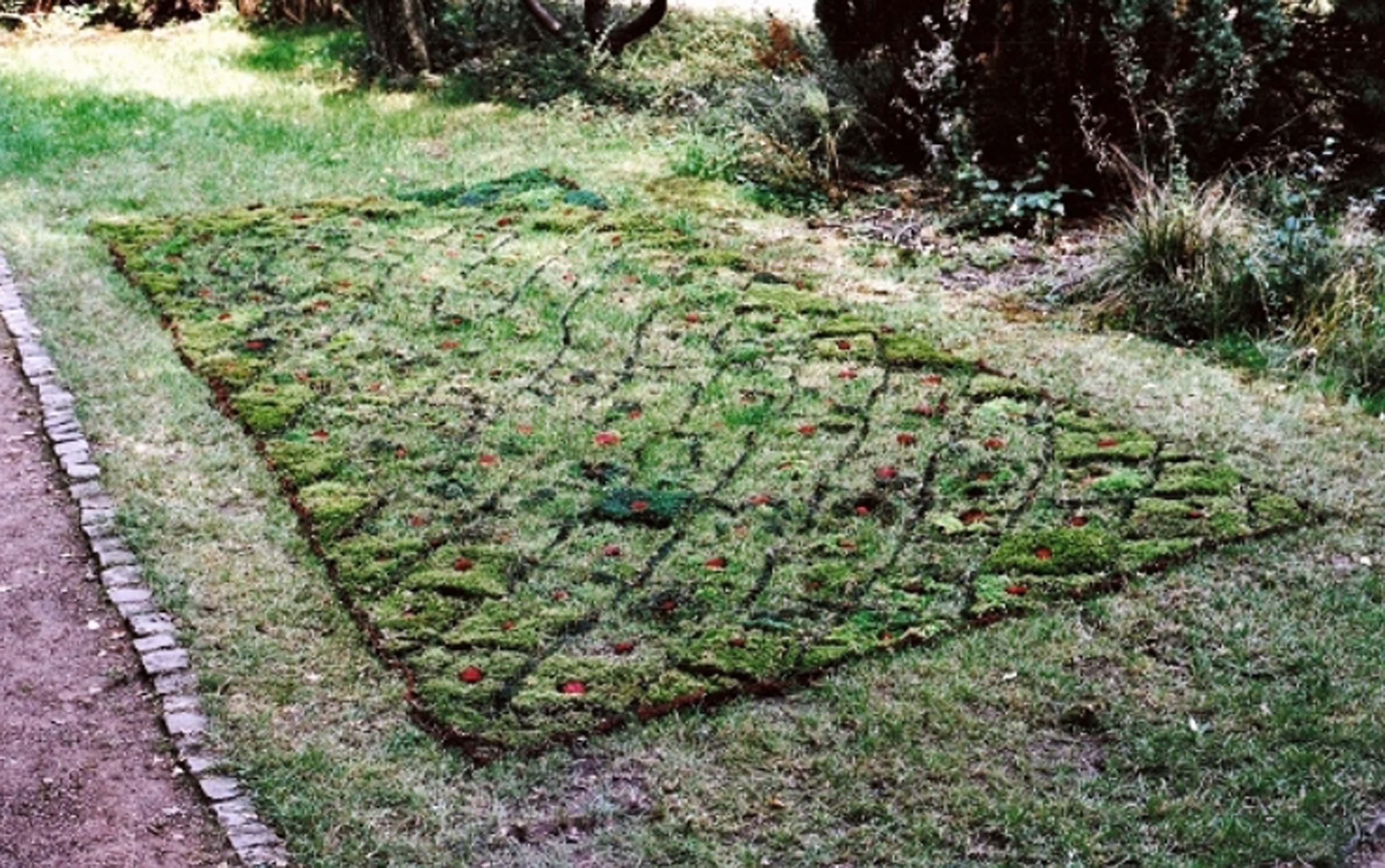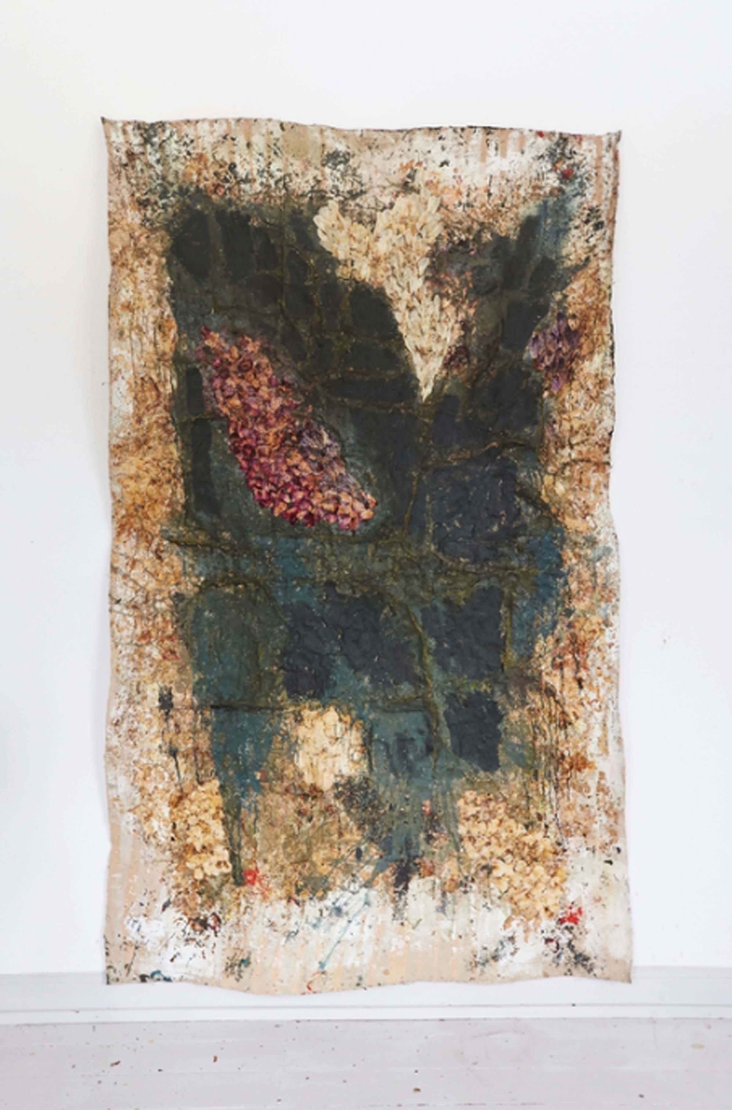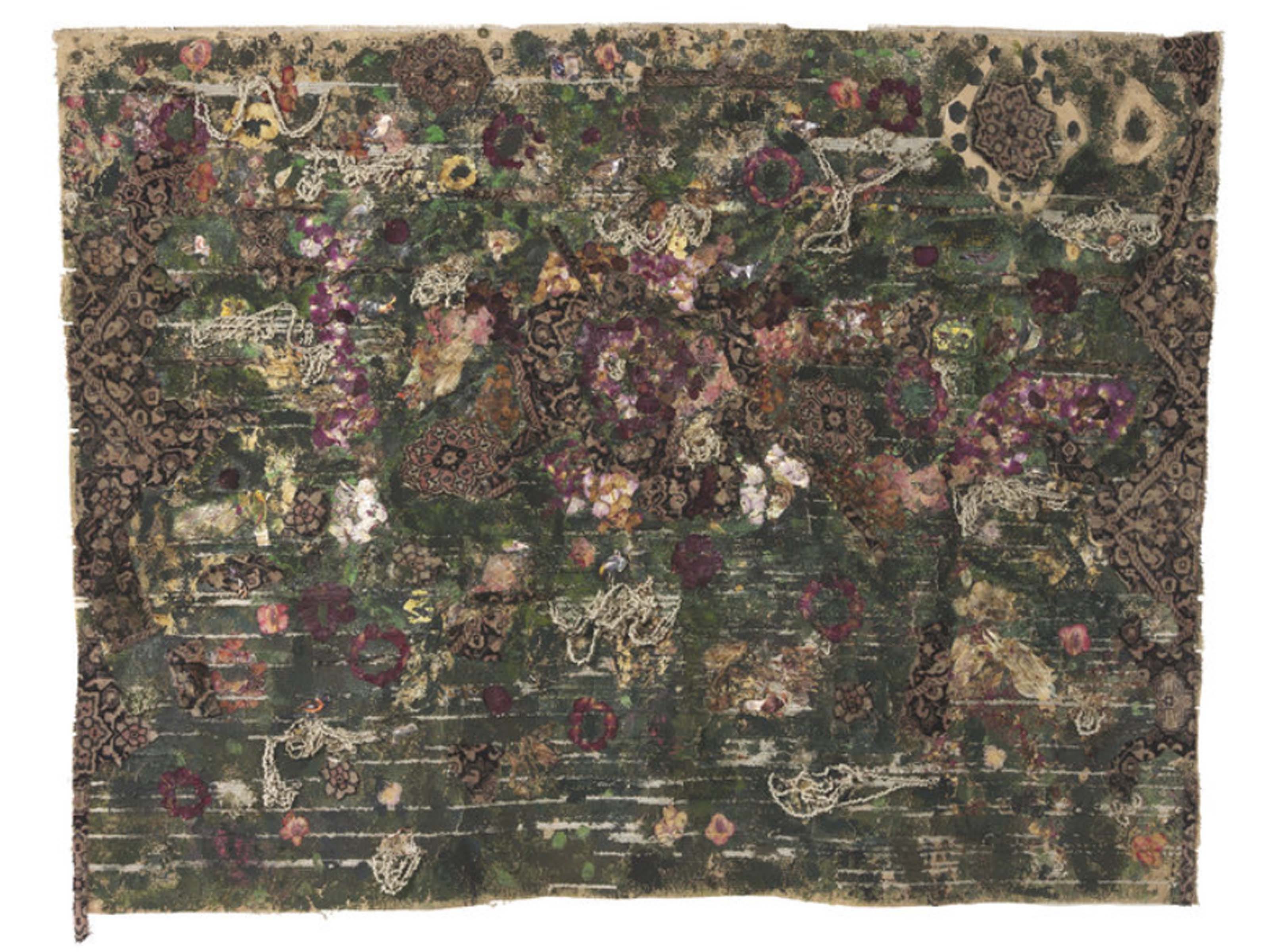 Tausendblumenteppich, Rückseite von Industrieteppichboden collagiert mit Blütenblättern (pictured above) portrays a uniqueness within her body of work as the paintings resembles both her intricate sand installations and foliage paintings at the same time. Spread out across the surface we may find what appears to be mashed up foliage like crushed up flowers and leaves, as if smeared across the paper. With a successful integration of elegant rug-like designs, we are left with an aesthetically pleasing work which reflects nature, design, and fusions of representations and interpretations of the natural world.