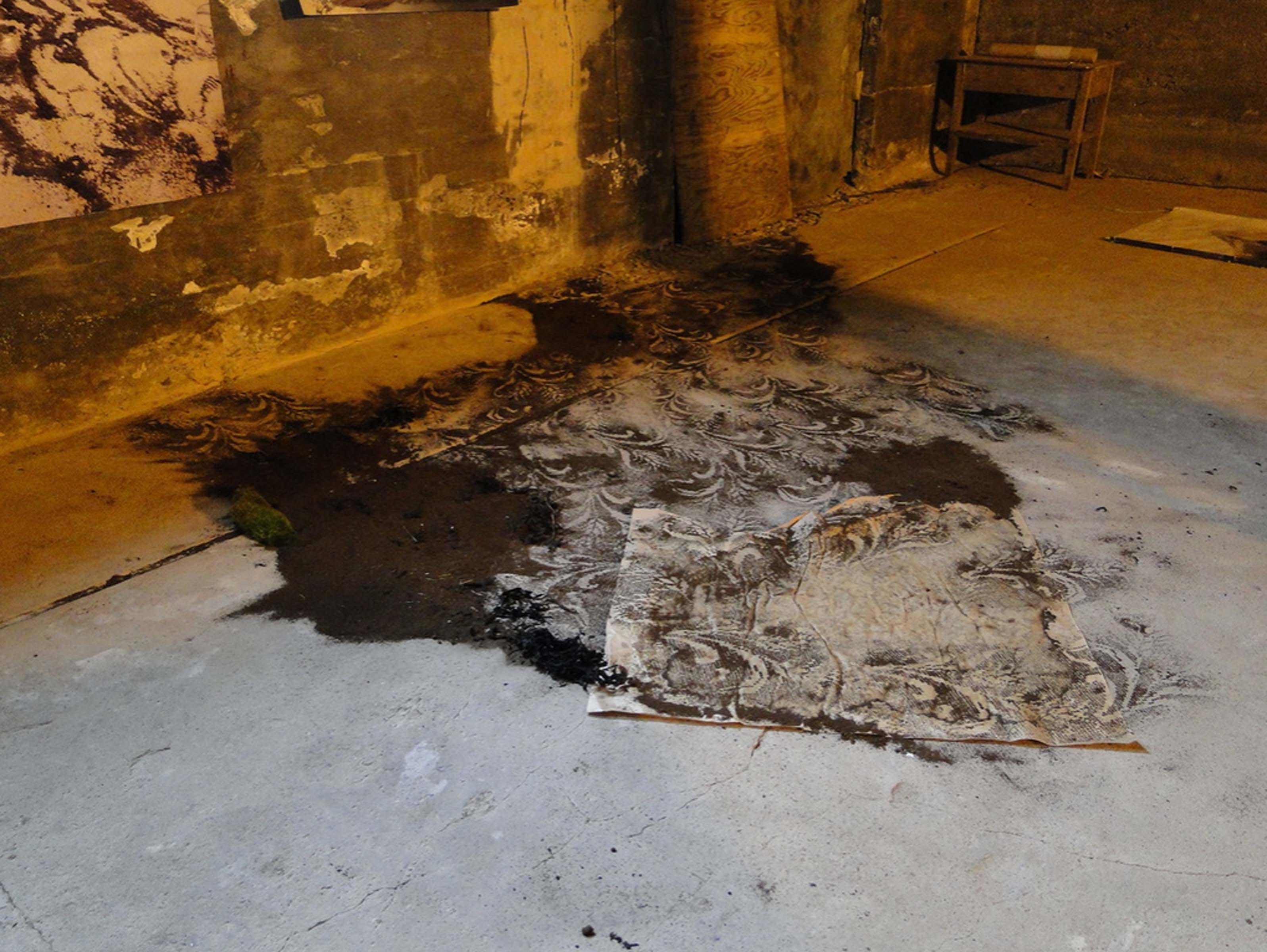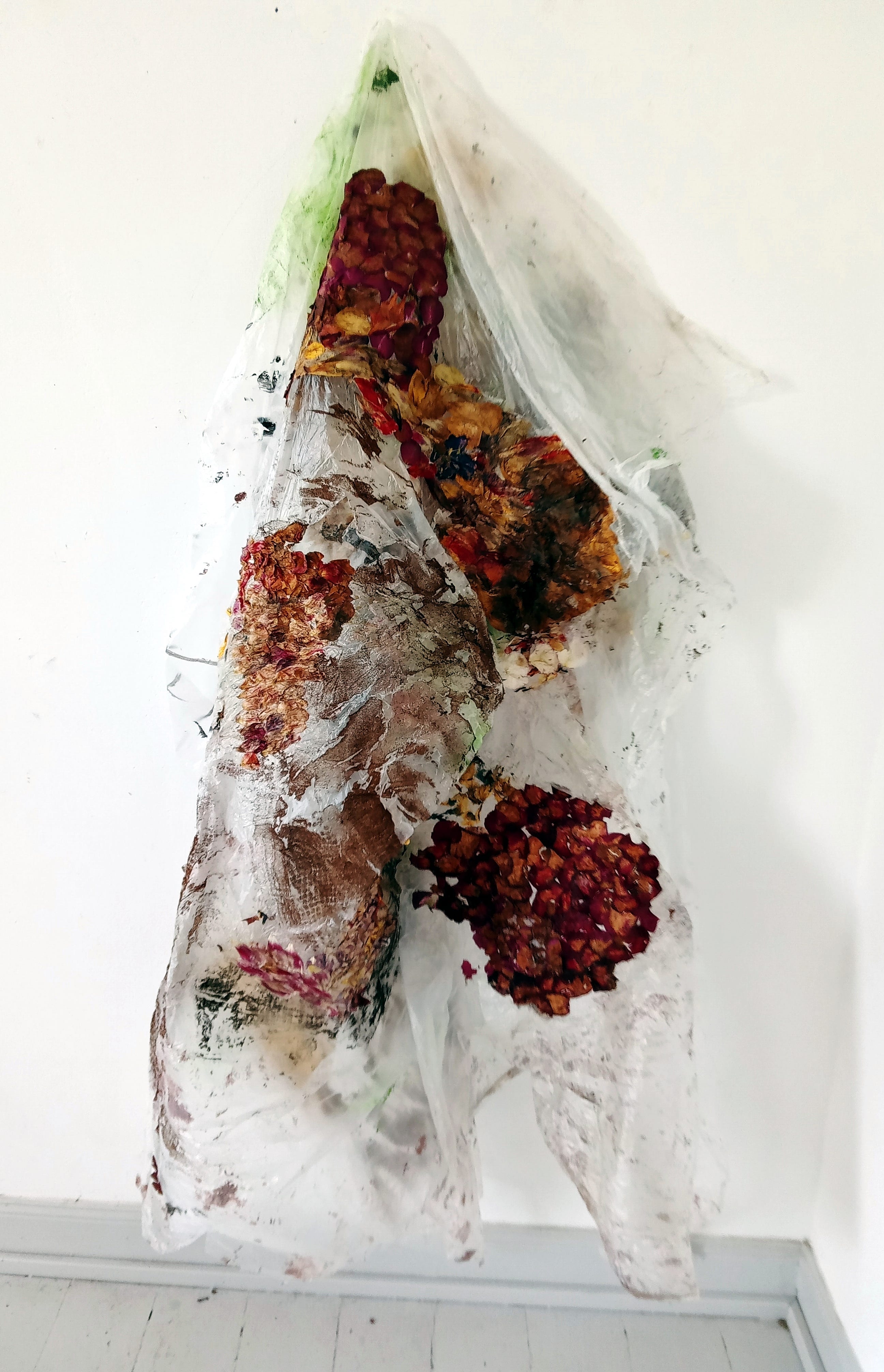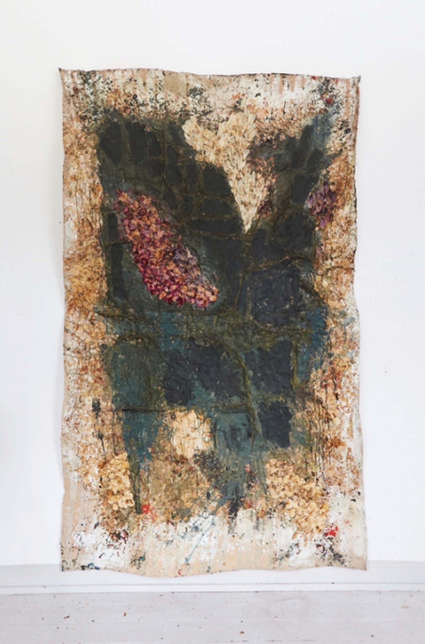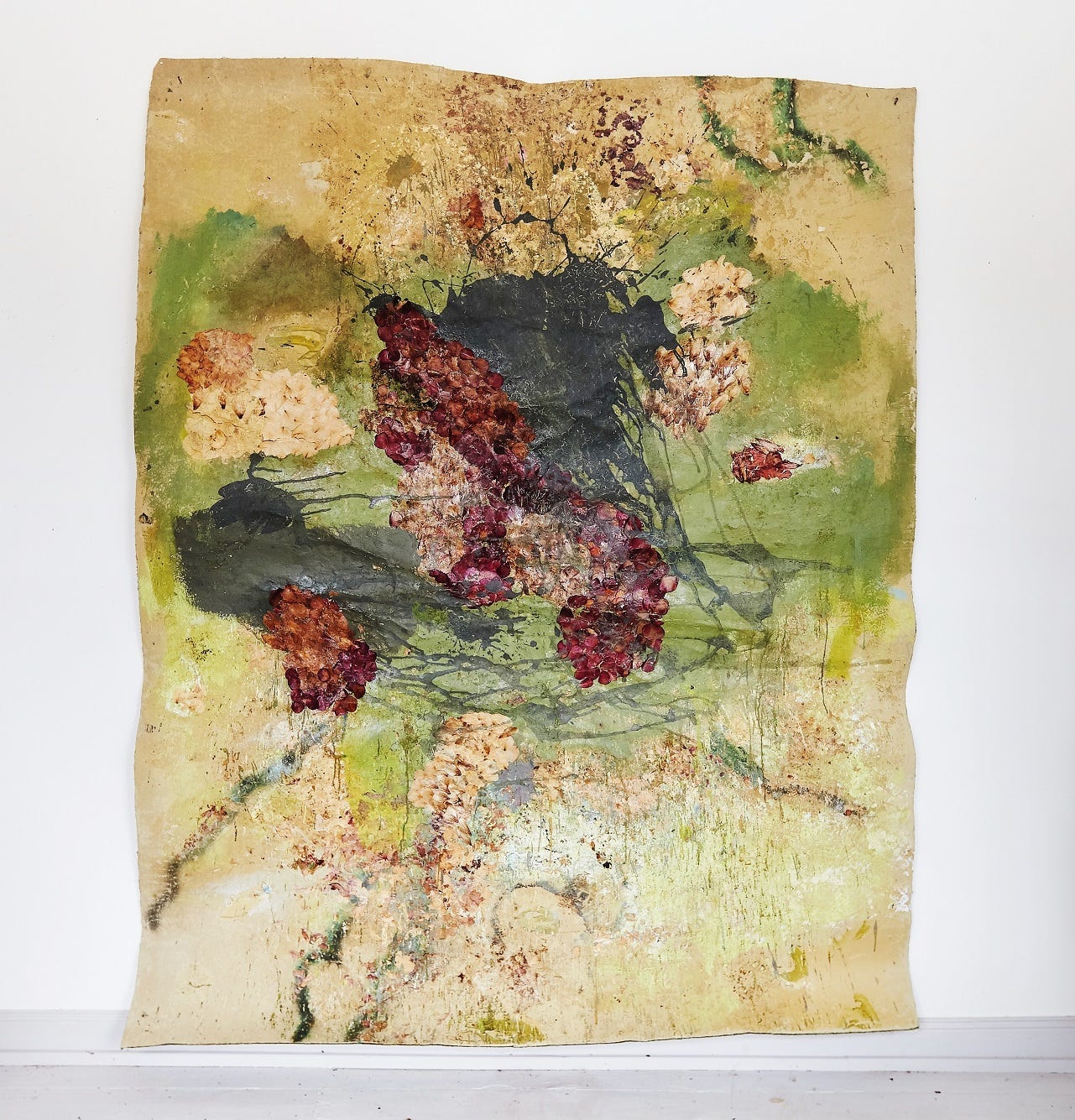 Tausendblumenteppich, Rückseite von Industrieteppichboden collagiert mit Blütenblättern (pictured above) portrays a uniqueness within her body of work as the paintings resembles both her intricate sand installations and foliage paintings at the same time. Spread out across the surface we may find what appears to be mashed up foliage like crushed up flowers and leaves, as if smeared across the paper. With a successful integration of elegant rug-like designs, we are left with an aesthetically pleasing work which reflects nature, design, and fusions of representations and interpretations of the natural world.