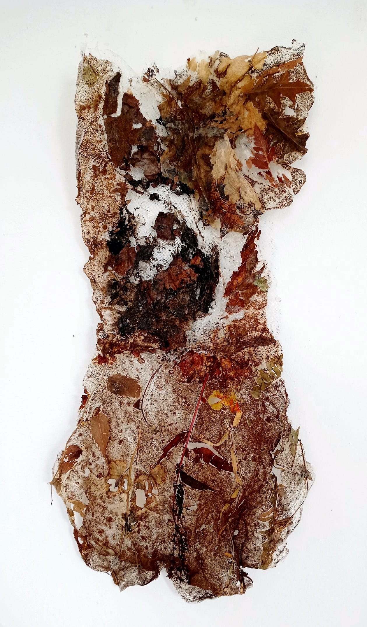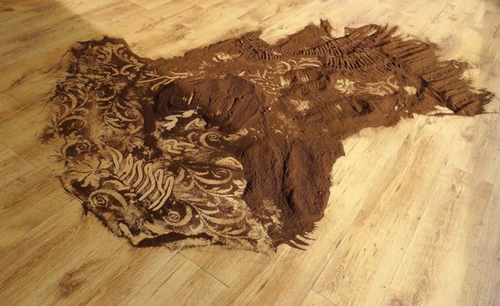 Margret’s work often entails interactions and interpretations of environments both natural and interior / industrial in aspect. She often creates intricate sand art with rug-like patterns literally poured on the floor of natural environments, in living rooms, formal sitting areas, and industrial zones. The mixed media paintings appear to be done on large pieces of thick and rough recycled paper or paper-like material and often portraying close ups of nature which sometimes resembled mashed up leaves, twigs, and earth. She creates installations mixing both natural and manufactured elements such as wrapping torn pieces of foliage in plastic. Her sand art installations are sometimes performed on breathtaking and rare scenery such as land geysers and landscapes containing unrefined salt deposits.