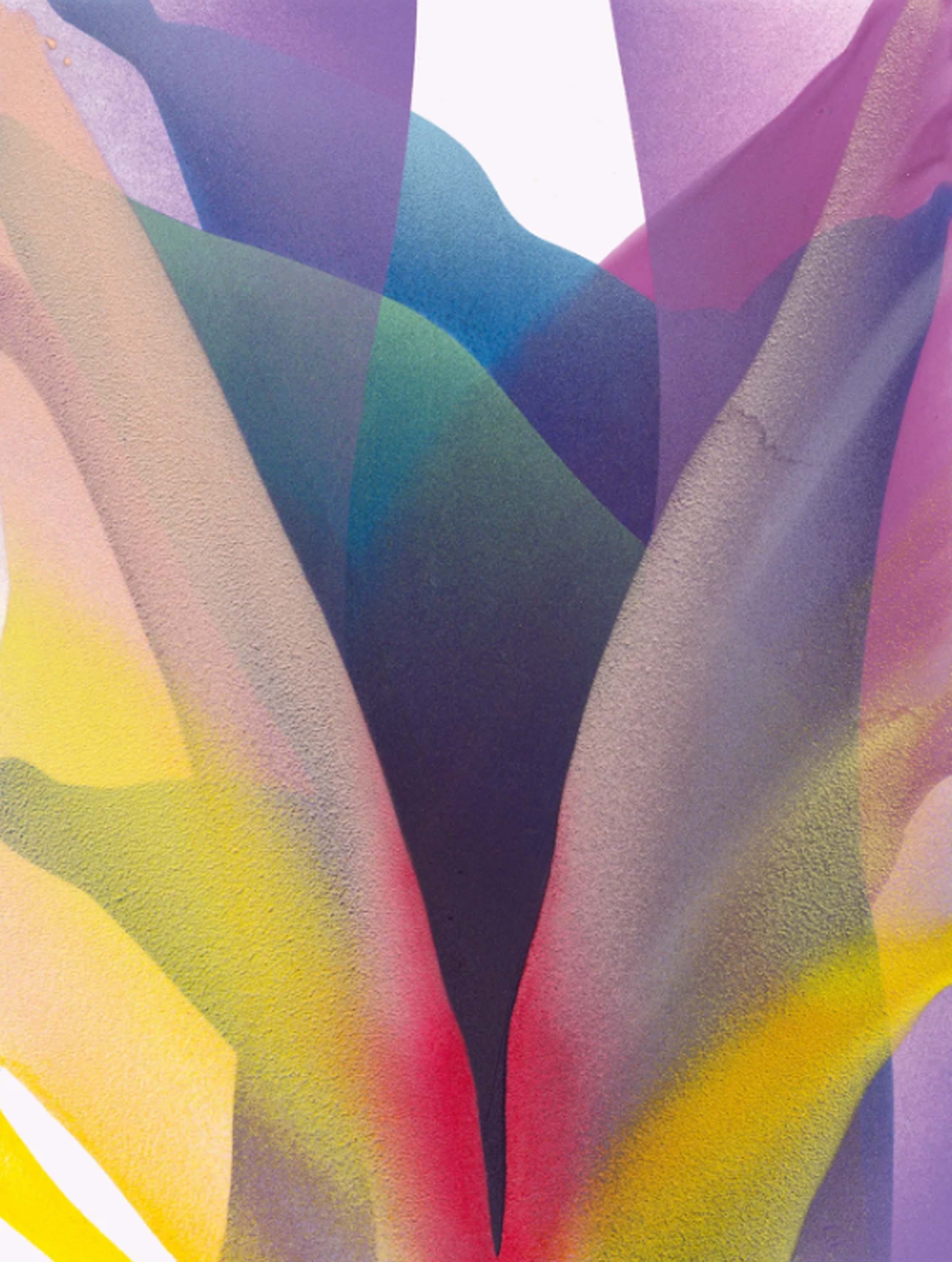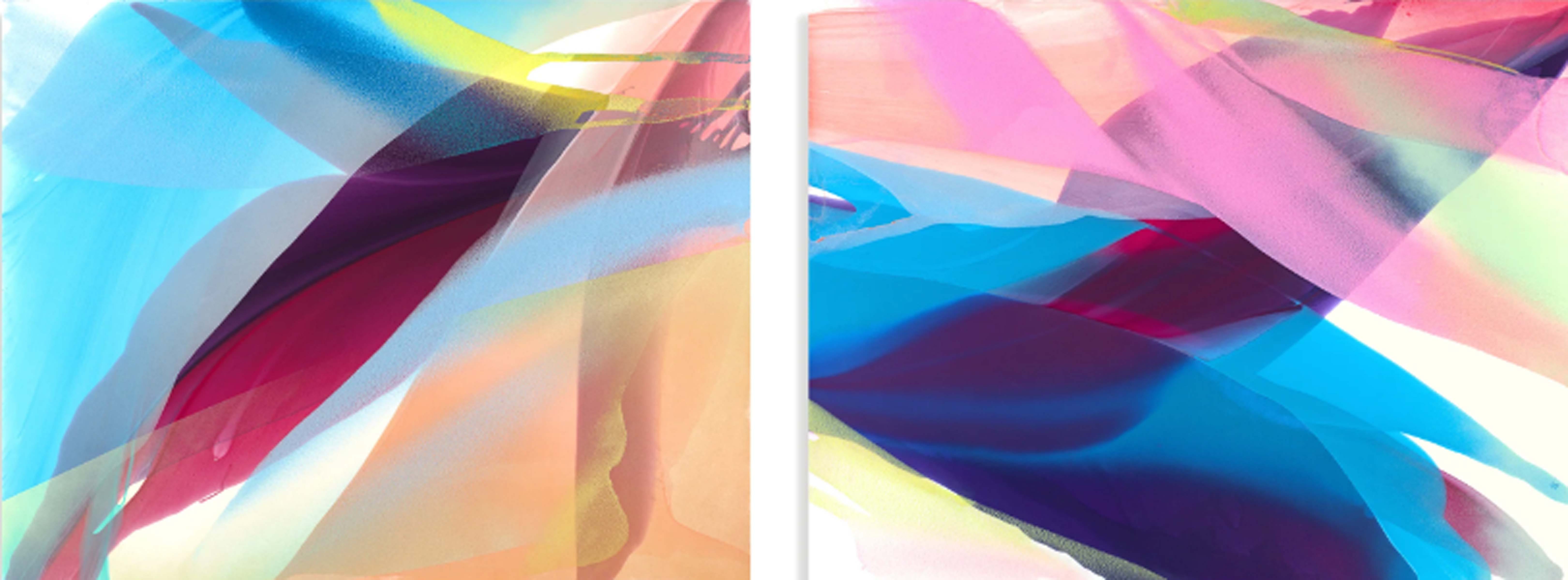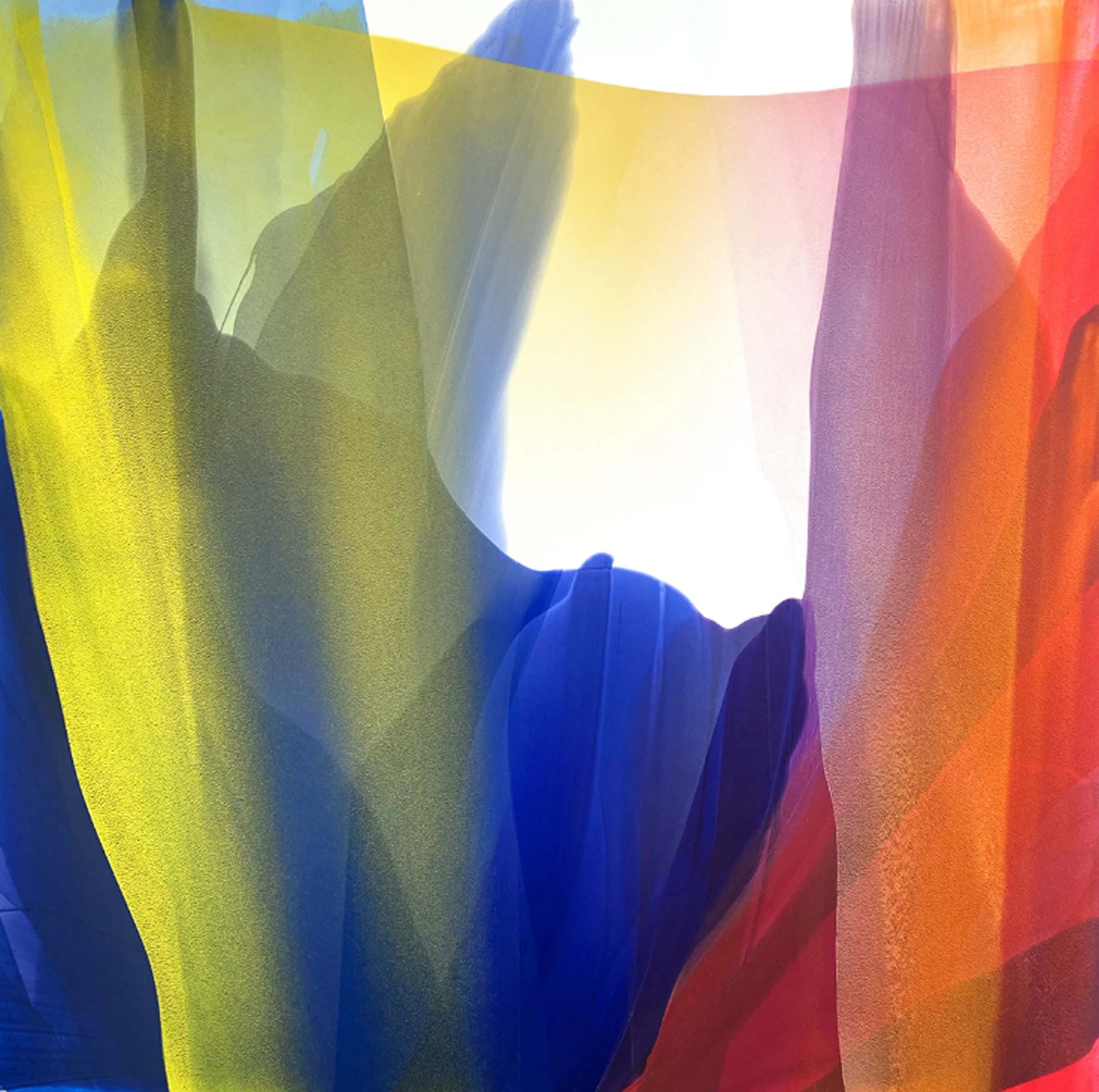 Alpenglow (pictured above) portrays a painting deeply embellished in the primary colors of red, yellow, and blue. Each of the primary hues became gradually saturated into pigments of orange, magenta, and green. As each color folds upon each other, they create transitions in light and variation. There remains shadows and indentations of form within these folds of shapes in soft delicate shades of black. The painting comes across as hyper-pristine and as if peering through glass pressed upon folds of elegant multi-colored drapery. Intricate shading remains applied to the non-objective shadows. As each fiber-like form covers the other a deep transparent and impression of luminosity alters the colors underneath the dominant colors hovering above. A delightful painting which evokes joyful tones, soothing low contrast, and deep richness in subtle color.