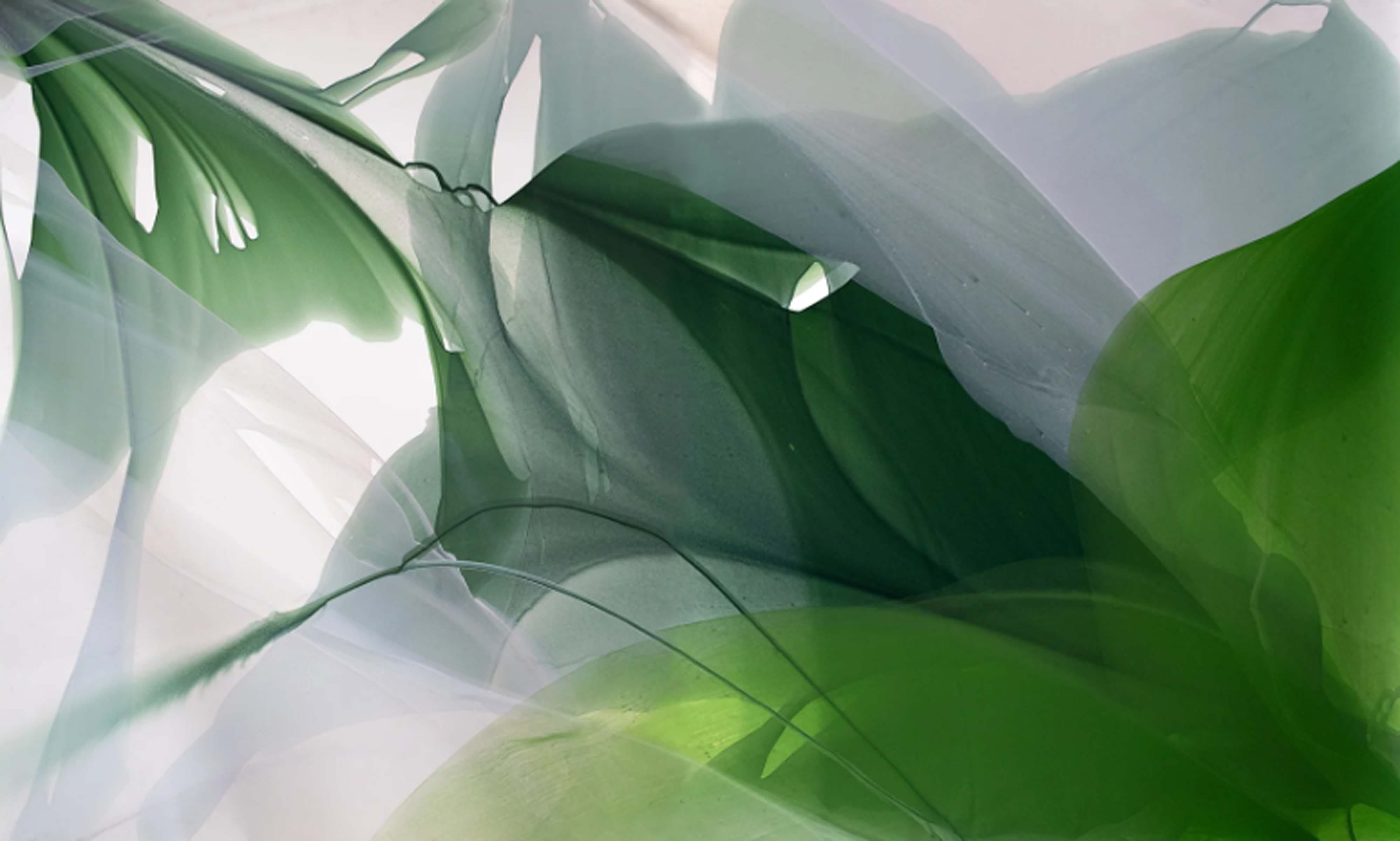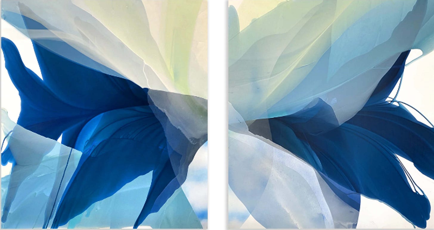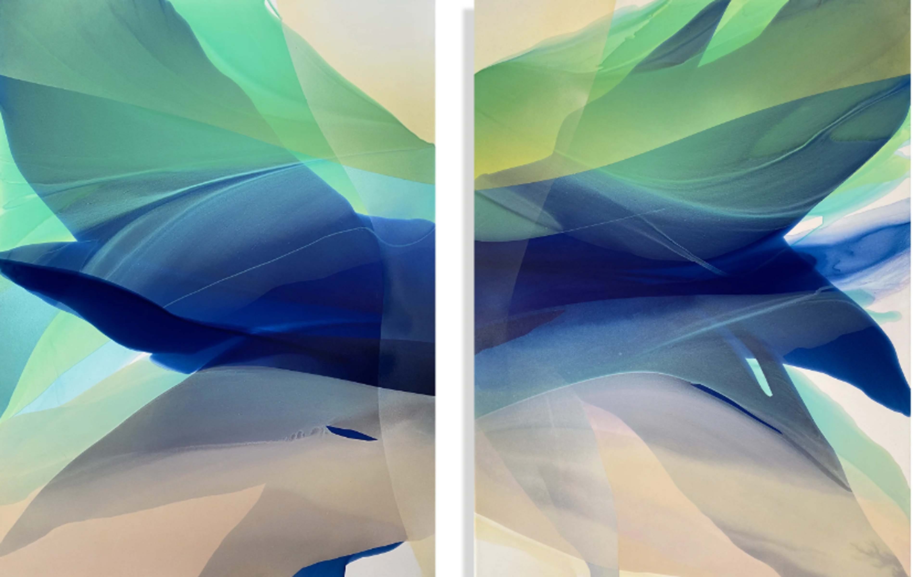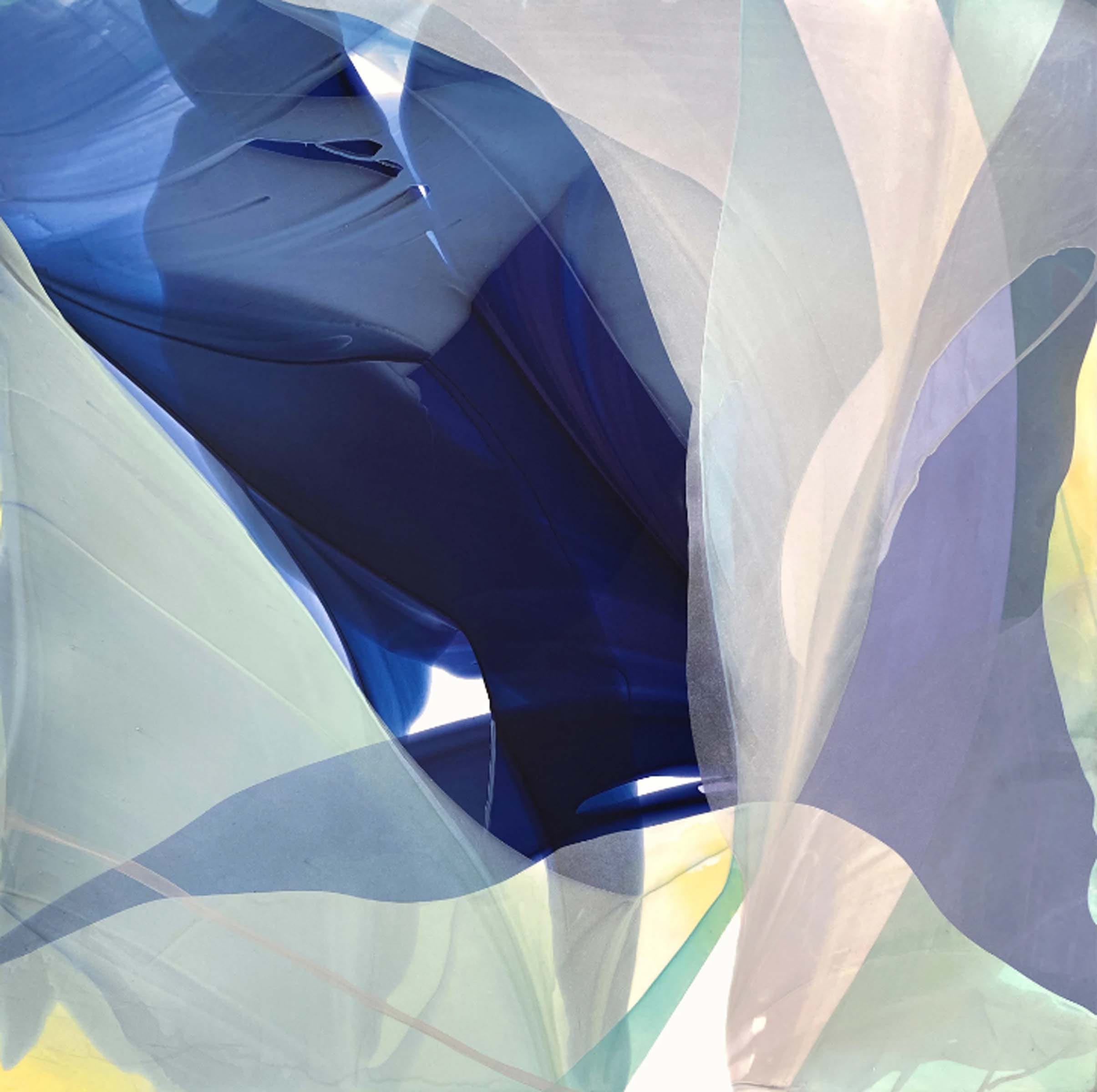 Alpenglow (pictured above) portrays a painting deeply embellished in the primary colors of red, yellow, and blue. Each of the primary hues became gradually saturated into pigments of orange, magenta, and green. As each color folds upon each other, they create transitions in light and variation. There remains shadows and indentations of form within these folds of shapes in soft delicate shades of black. The painting comes across as hyper-pristine and as if peering through glass pressed upon folds of elegant multi-colored drapery. Intricate shading remains applied to the non-objective shadows. As each fiber-like form covers the other a deep transparent and impression of luminosity alters the colors underneath the dominant colors hovering above. A delightful painting which evokes joyful tones, soothing low contrast, and deep richness in subtle color.