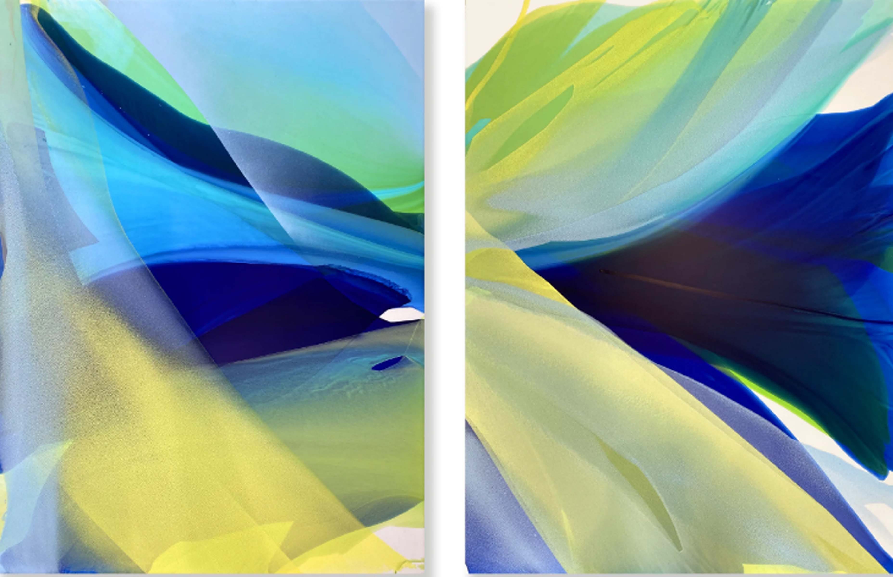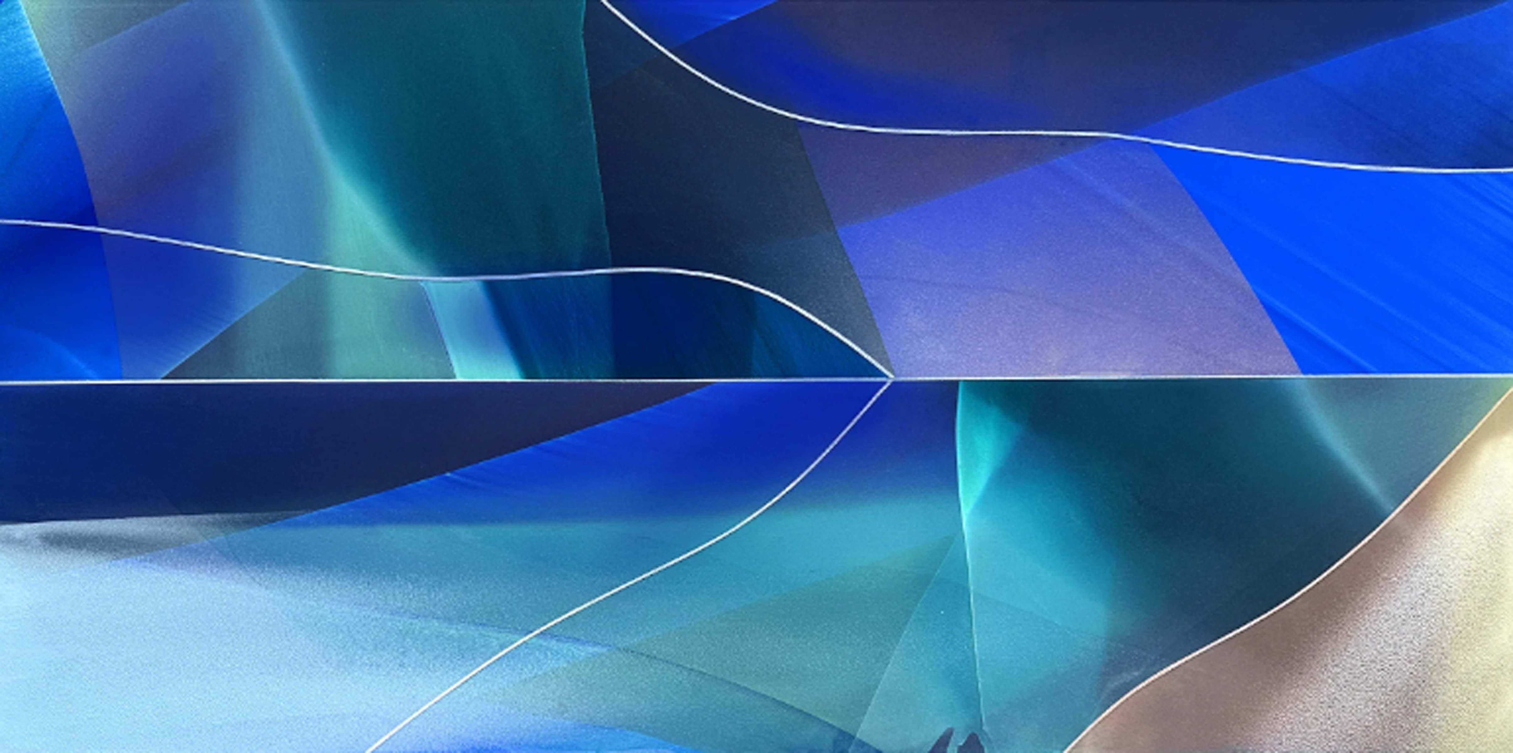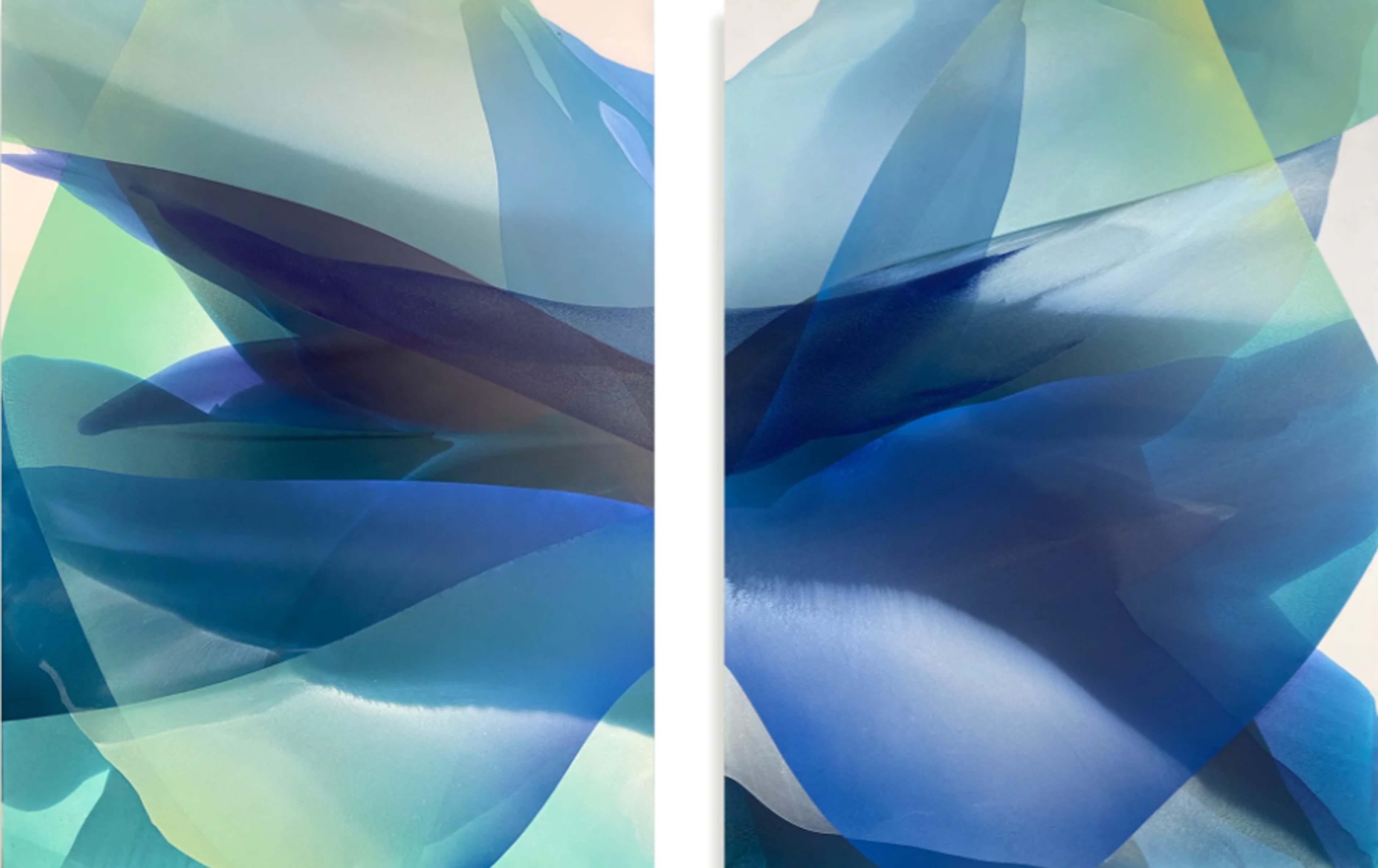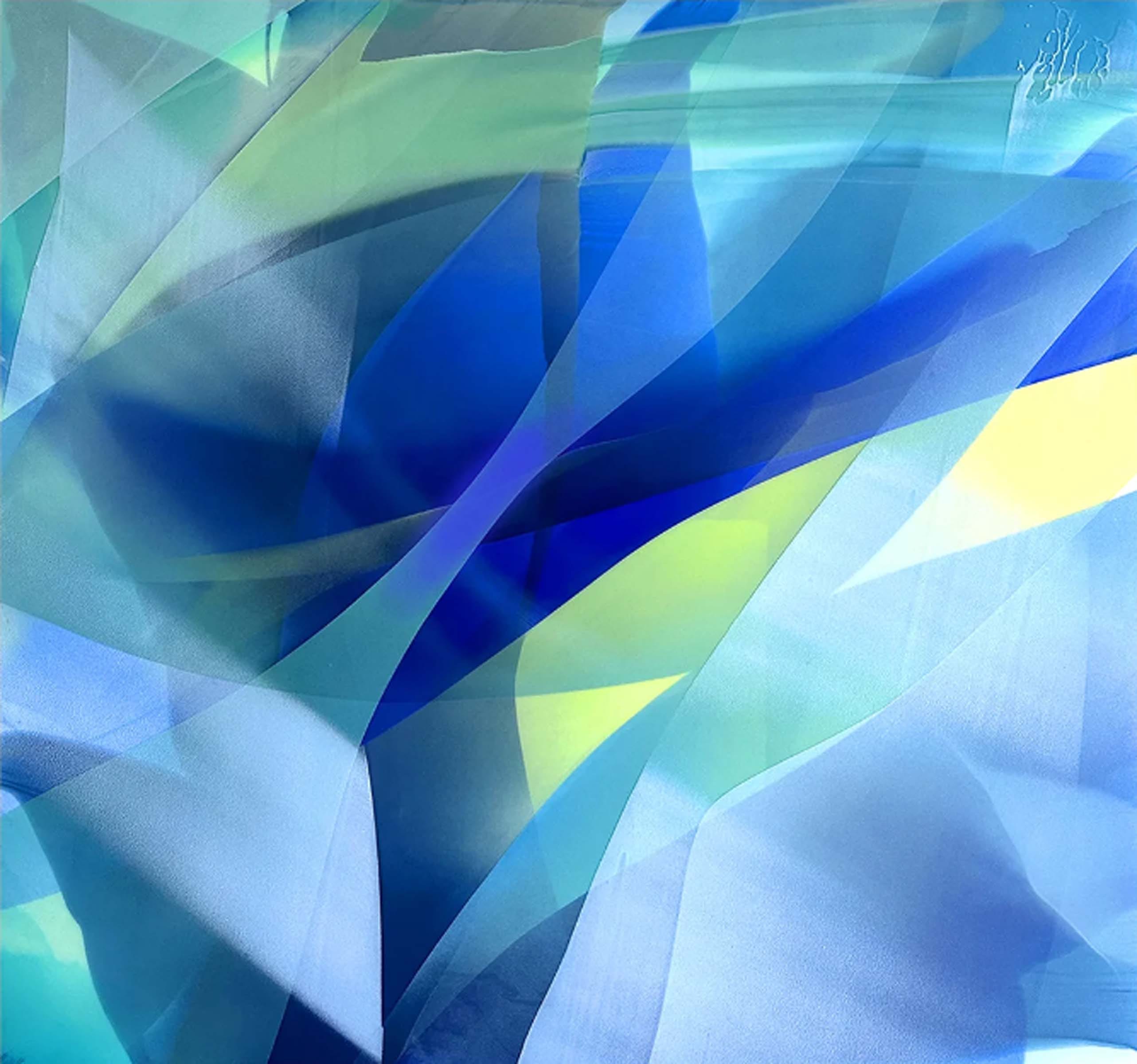 When you visit Marina’s artist website you are greeted with a video guiding you into her painting process. The video reveals pools of water being poured onto the surface and the brush being allowed to bleed the paint onto the canvas as well showing her use heavy mixtures of water with her paint. She incorporates sand onto the canvas in order to create a sense of texture and grainy finish. Although the paintings are an exercise in abstractions, there are clear asymmetrical forms created which almost resemble folds of fabric. As if multi-colored sheets of linen were stretched out over layers of each other under impact of heavy light. The aquatic, prismatic, and luminous display of the paintings reveal a painting process deeply inspired by reinventing contemporary notions of abstraction. Clear forms, linearity, and improvised shapes of shadow fold upon the facet to create fascinating compositions filled with both curves and angles.