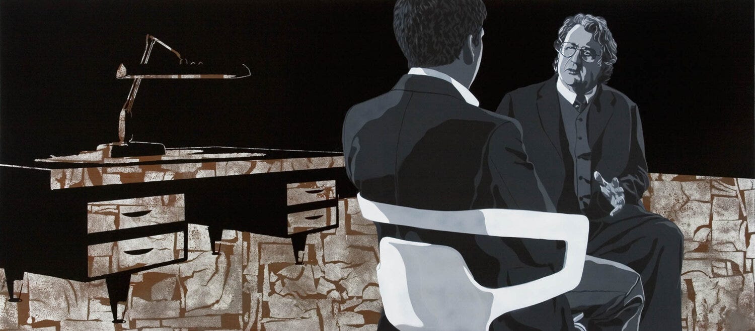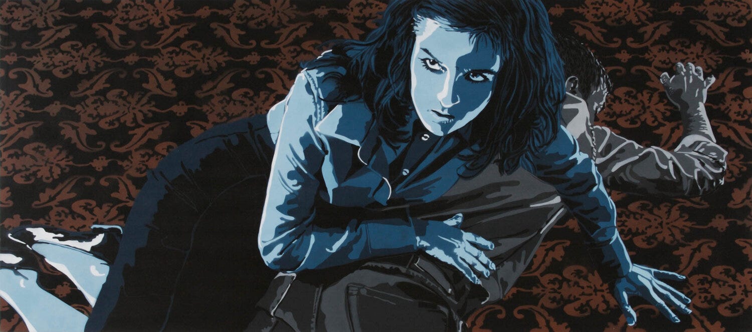 Preservation (top of article) portrays a woman staring at an aggressor who has just assaulted or murdered a loved one who lays helplessly on the floor. The detailed carpet patterns reveal an environment of refinement with the figures dressed in business casual attire. Perhaps the interior of a five star hotel or prestigious mansion, the intricate carpet hints at an opulent setting. The cool blues on her skin reflect the cold reaction on her face facing the unseen aggressor who appears off the surface. The assaulted man remains spread out on the floor with neutral tones as if to express lifelessness and inactivity. A theatrical shadow protrudes over the young woman’s face as if like an opera mask. The theatrics and high tensity painting reflects a sense of urban film noir, retro aesthetics, and containing pop art elements of blocked off forms.