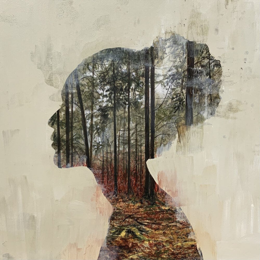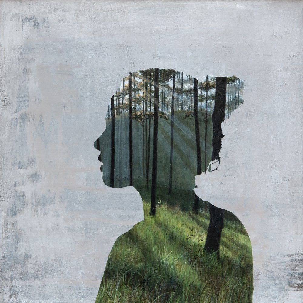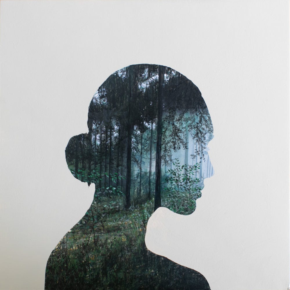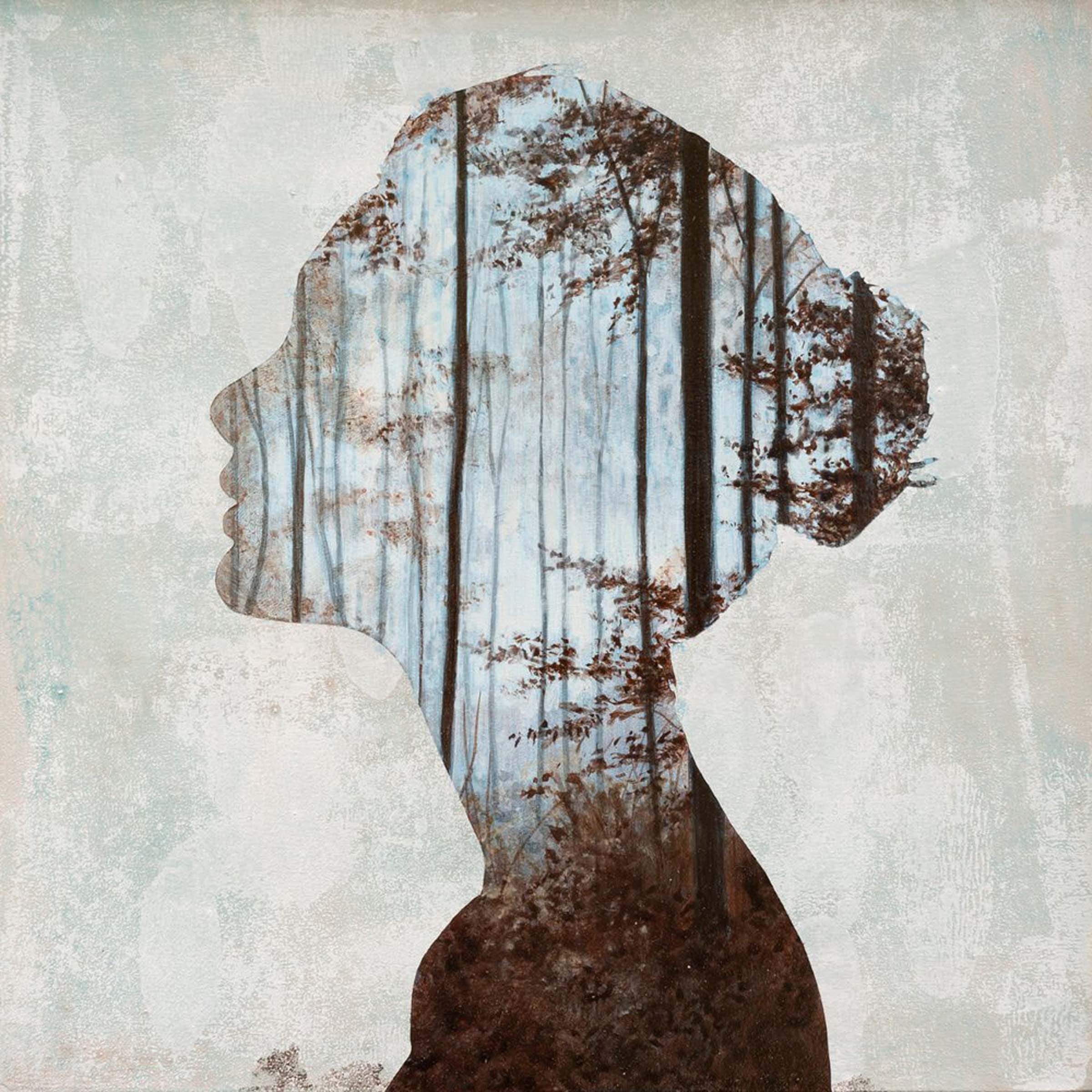 Although these artworks may appear to be cut out photographs, they are in fact photorealistic acrylic paintings painted within a stencil shaped in the form of female bodies and portraits. Megan uses models for the basis of her vinyl stencils which she lays over panel and paints intricate landscapes within the interior shape. Megan’s paintings are poetic gestures connecting womanhood with tranquil relationships within nature referenced by her upbringing in rural New England, where she often spent her childhood exploring the woods.