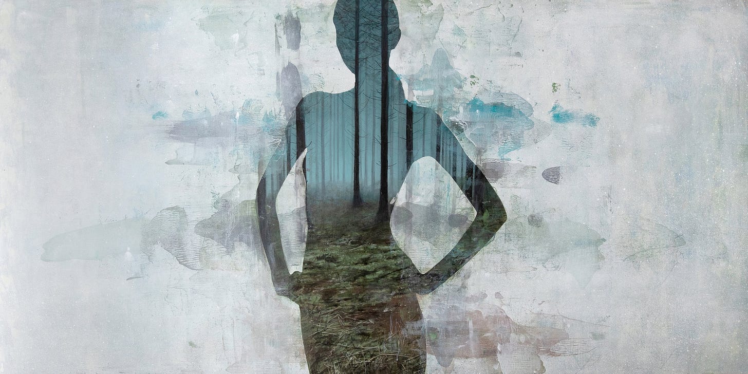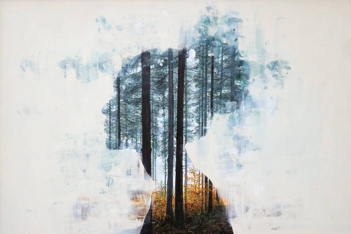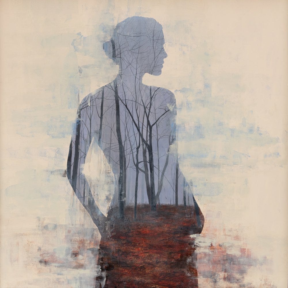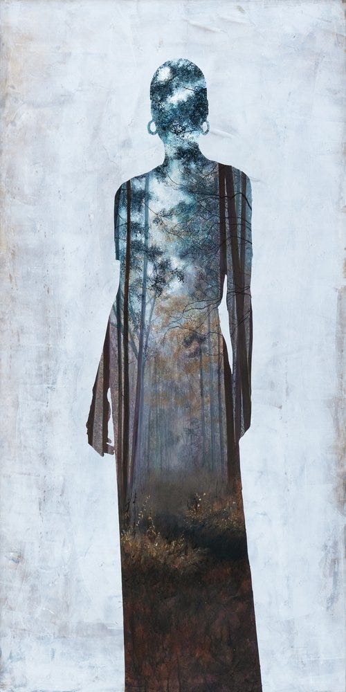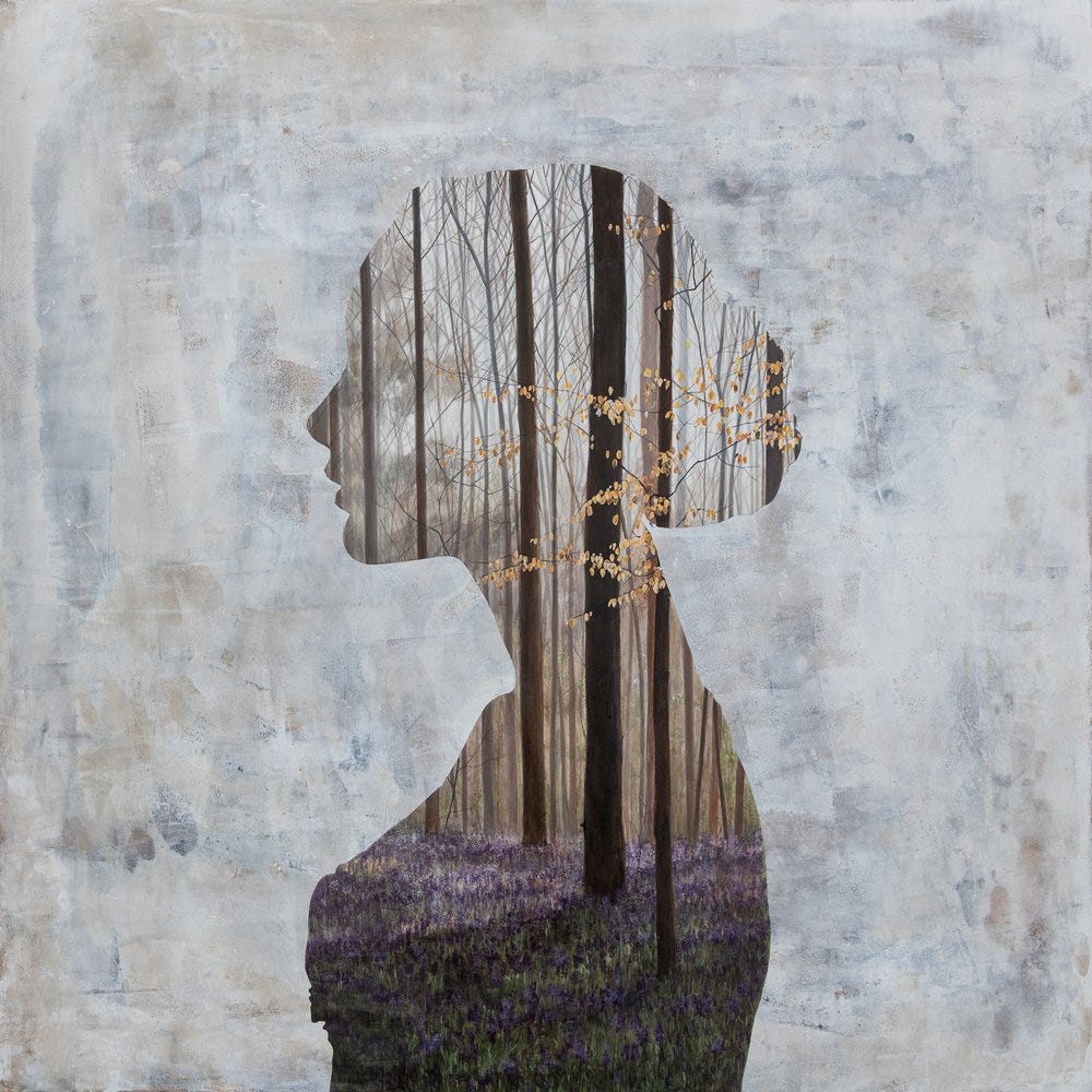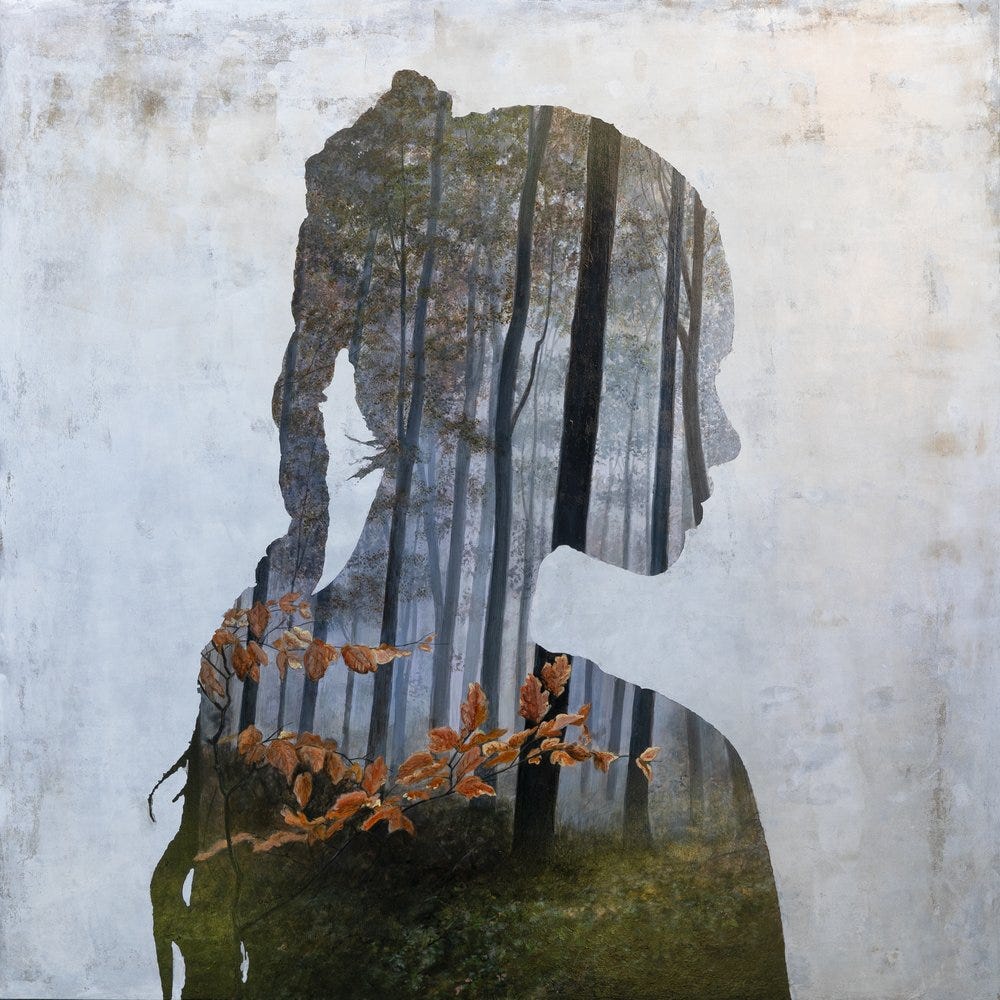 Undercurrent (pictured above) remains a clever painting in which the landscape becomes positioned in a way to directly interact with the figure. In such a case, the fallen red leaves from the trees appear in the shape of a skirt for the silhouetted figure. The various precise and thin branches from the trees almost appear like veins spread throughout her body, as if we could see her blood pumping life throughout her form. The background contains subtle touches of colors from the interior landscape such as red from the foliage and bluish gray from the sky, smeared in a blur against a backdrop of a pastel cream tone.