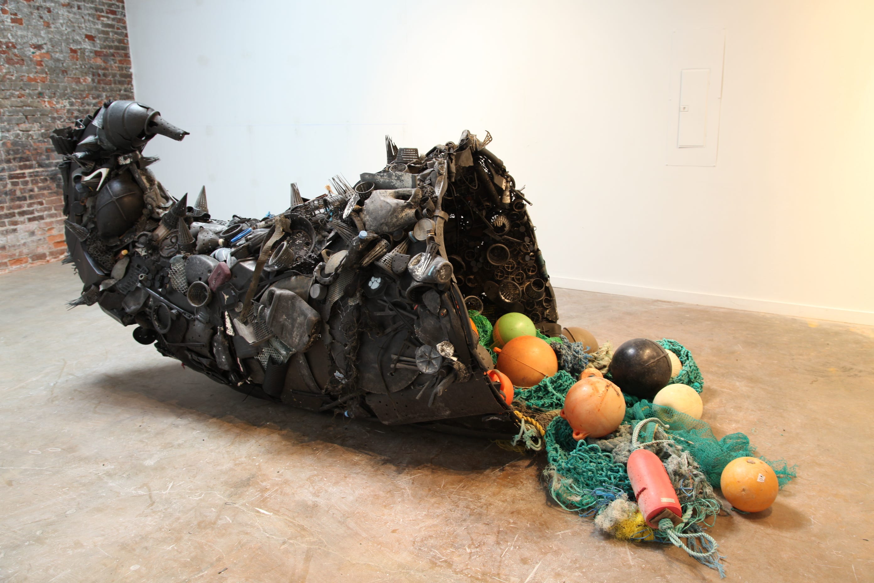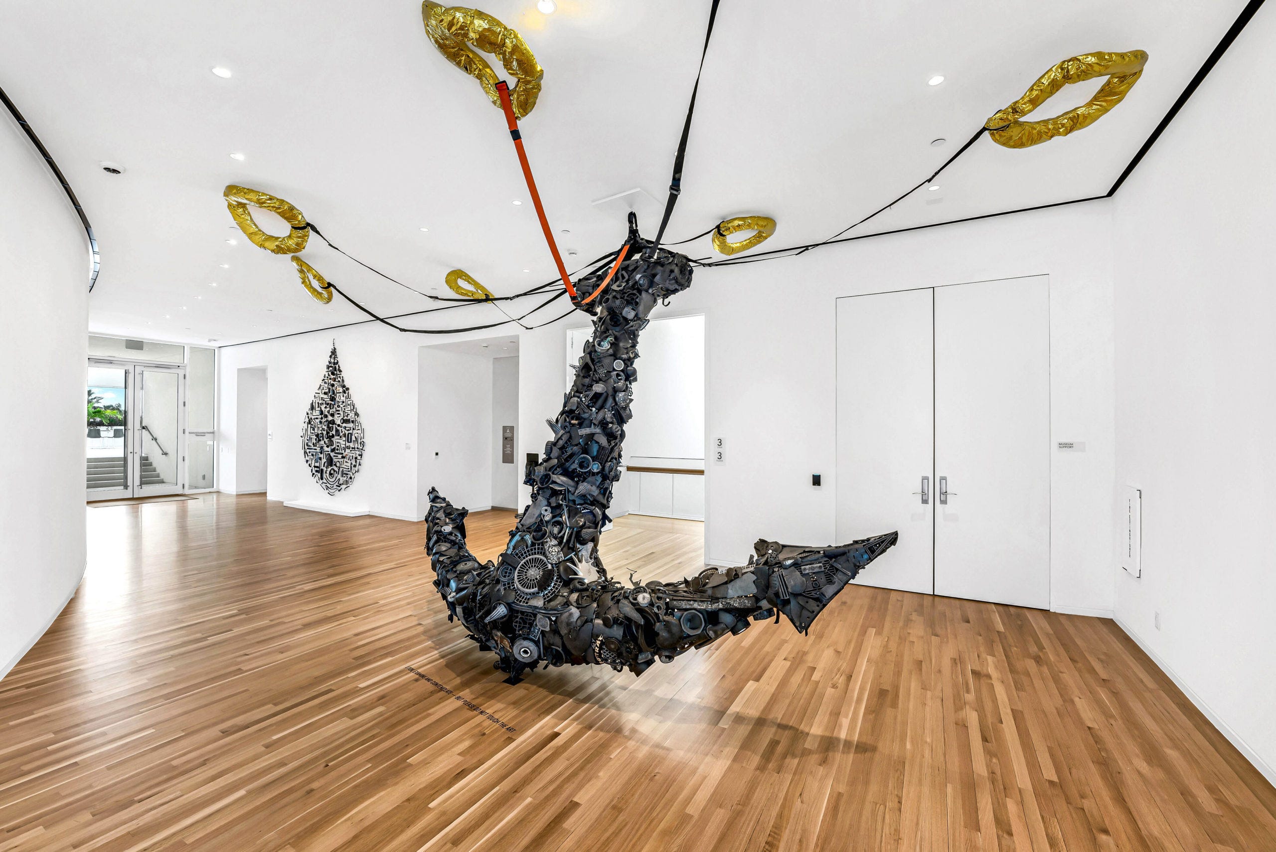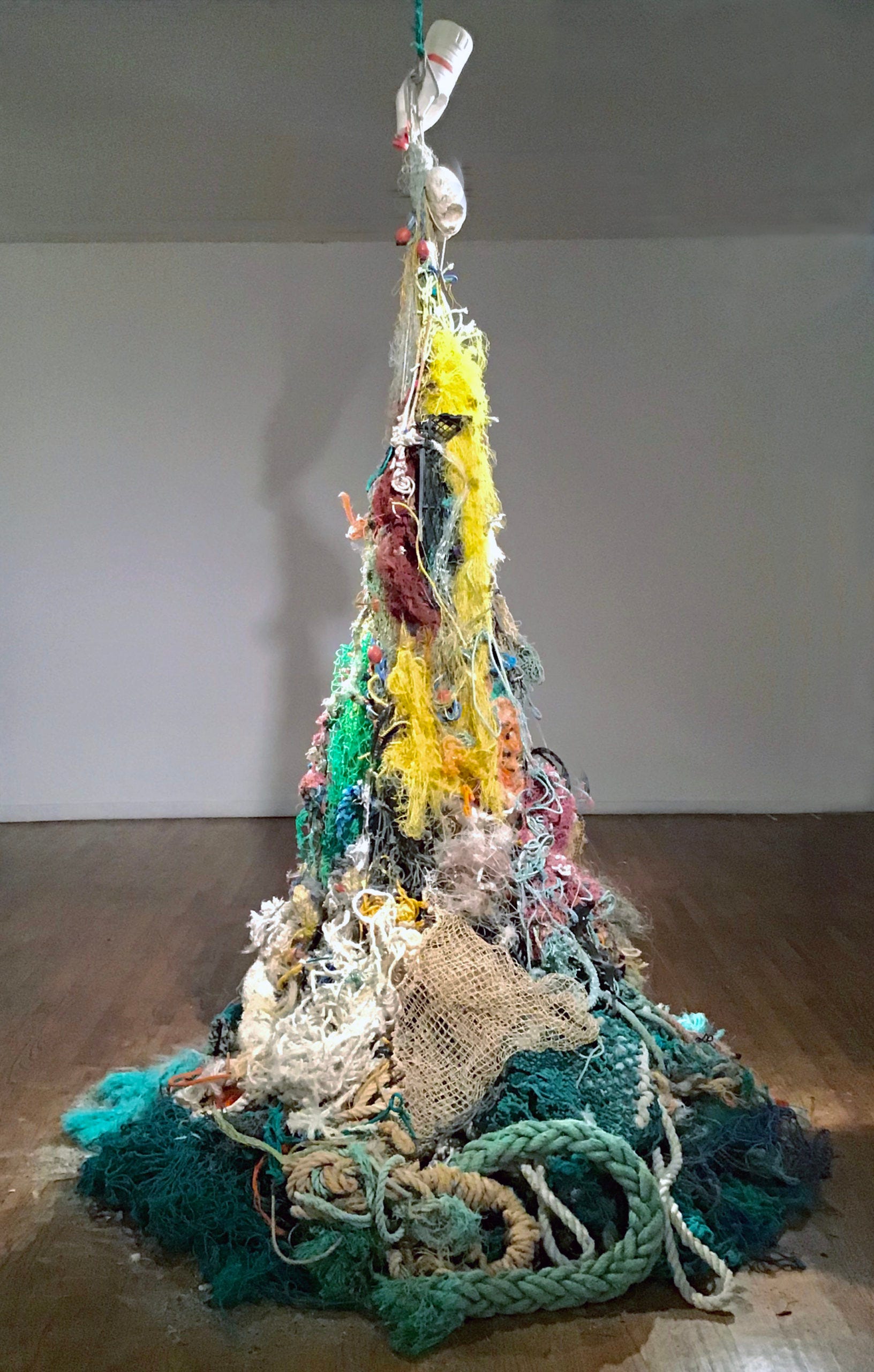 Ocean Gleaning (pictured above) remains one of Pam’s most conceptual works. The large installation depicts an oversized anchor constructed from ocean plastic and strapped to the ceiling as well as to golden life rings. As if the anchor acts as a sinister agent bringing us down to the bottom depths of the ocean as we swim for drastic cover for the lifebuoys. A dark piece reflecting a cynical angle towards the prospect of our damage to the ocean environment, which even brings destruction to our shores.