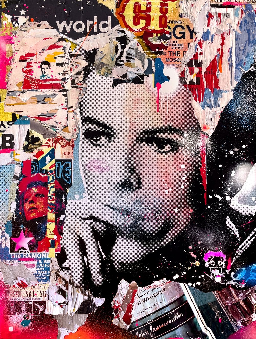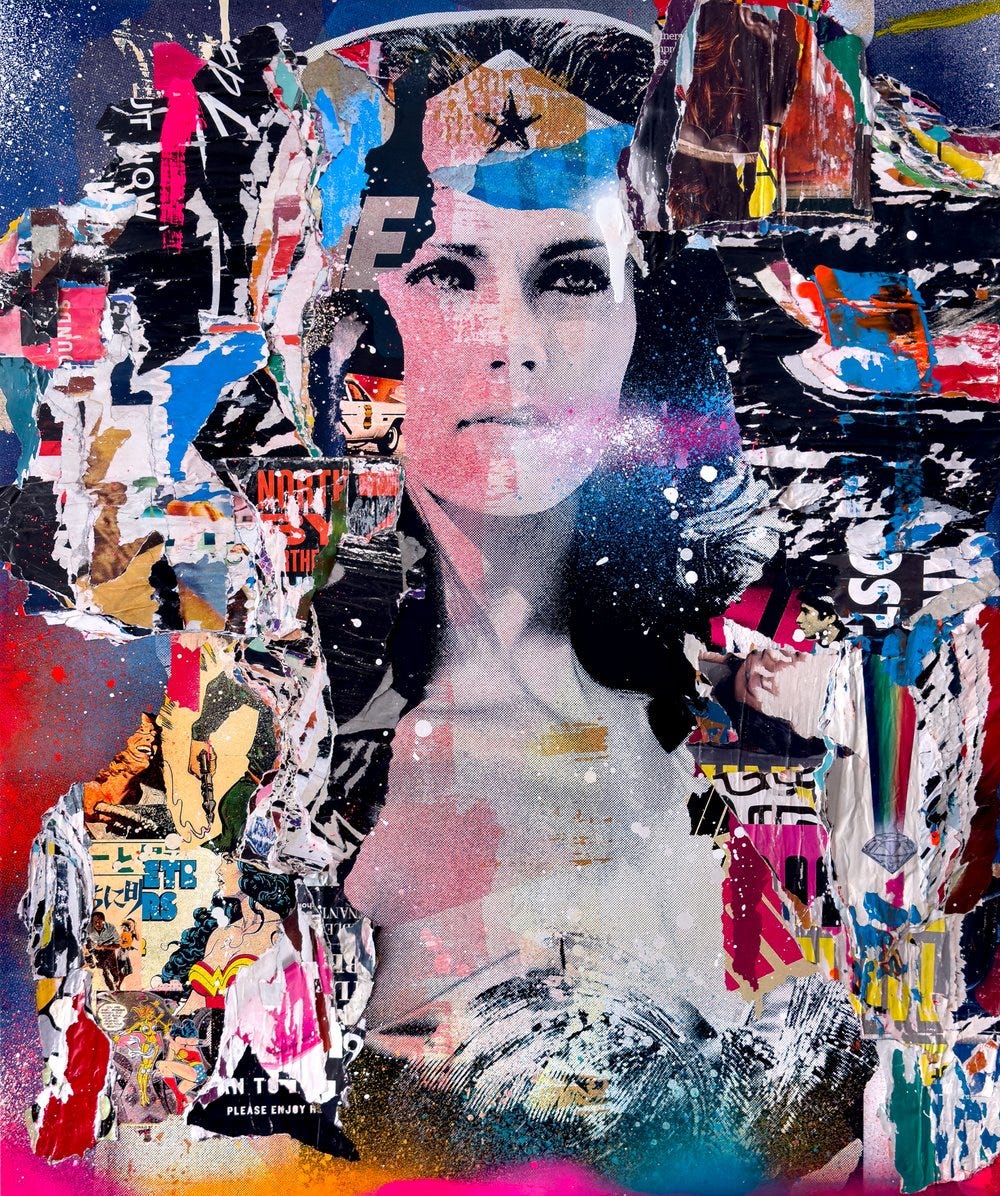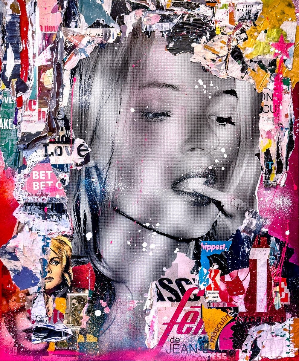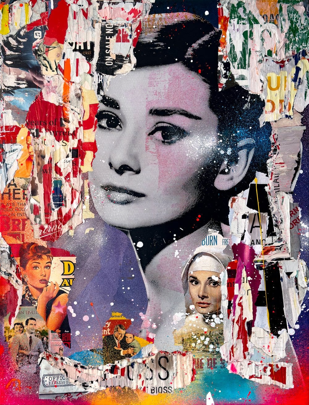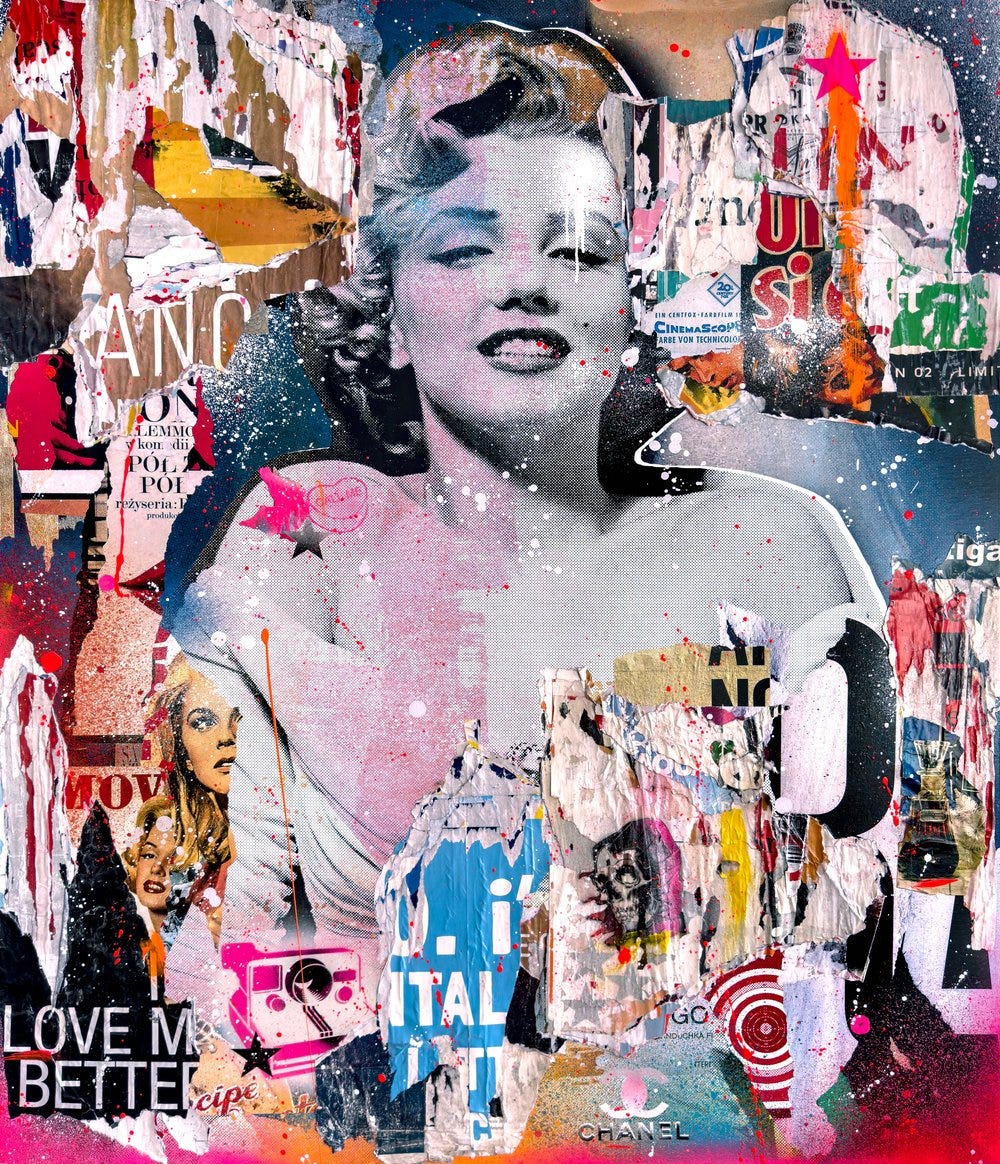 These lively works communicate an appreciation towards vintage pop art aesthetics using contemporary techniques paying homage to the age of modernism. Celebrities depicted range from icons and giants of golden age entertainment such as The Beatles, The Rat Pack, David Bowie, Billie Holiday, Audrey Hepburn, Marylin Monroe, and Paul Newman. The assemblages combine vintage and retro nostalgic appeal with the appearance of torn posters one would see in a heavy urban center like Times Square in New York. These assemblages also combine expressionistic drips, smears, and sprays of bright neon colors typically incorporating hot pink and magenta.