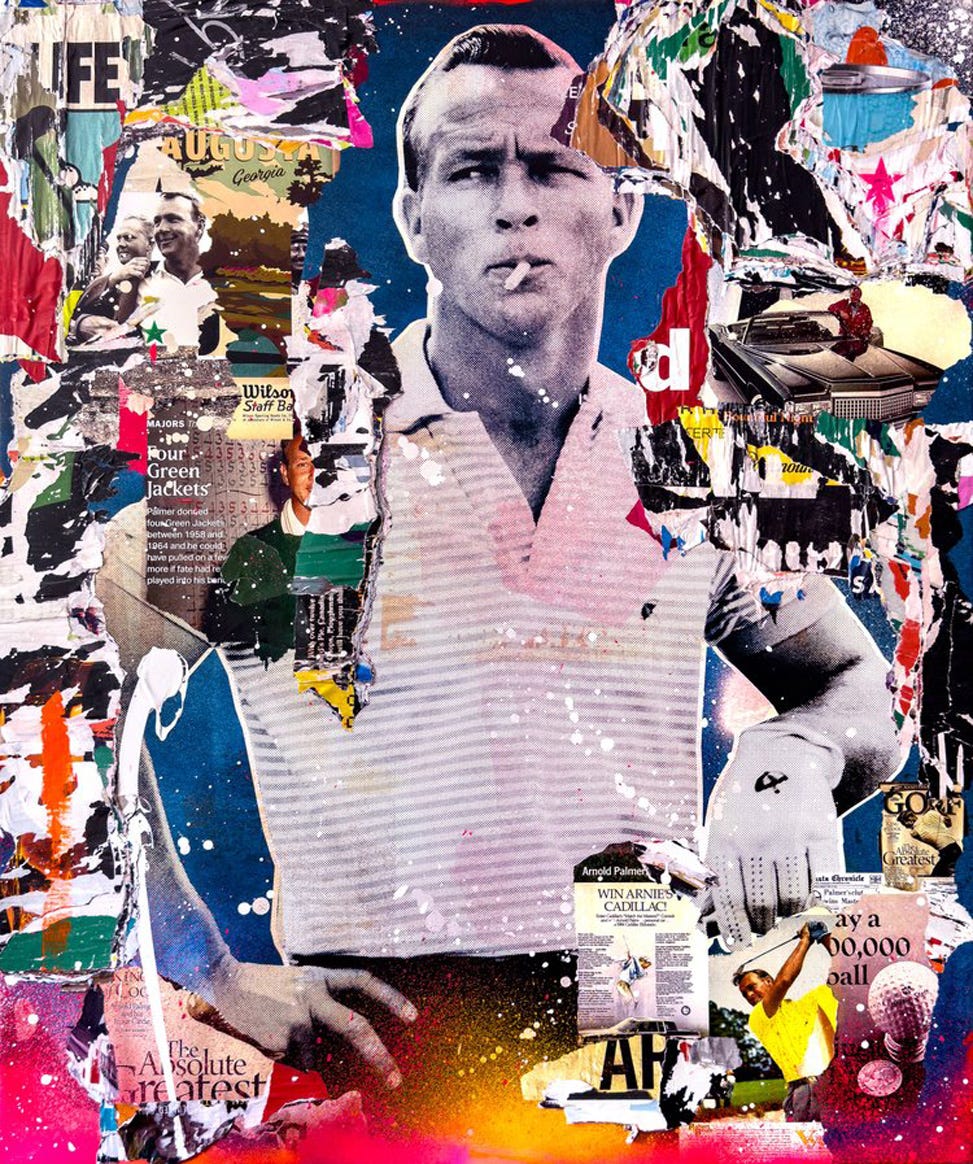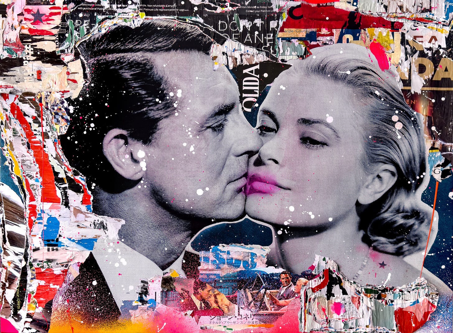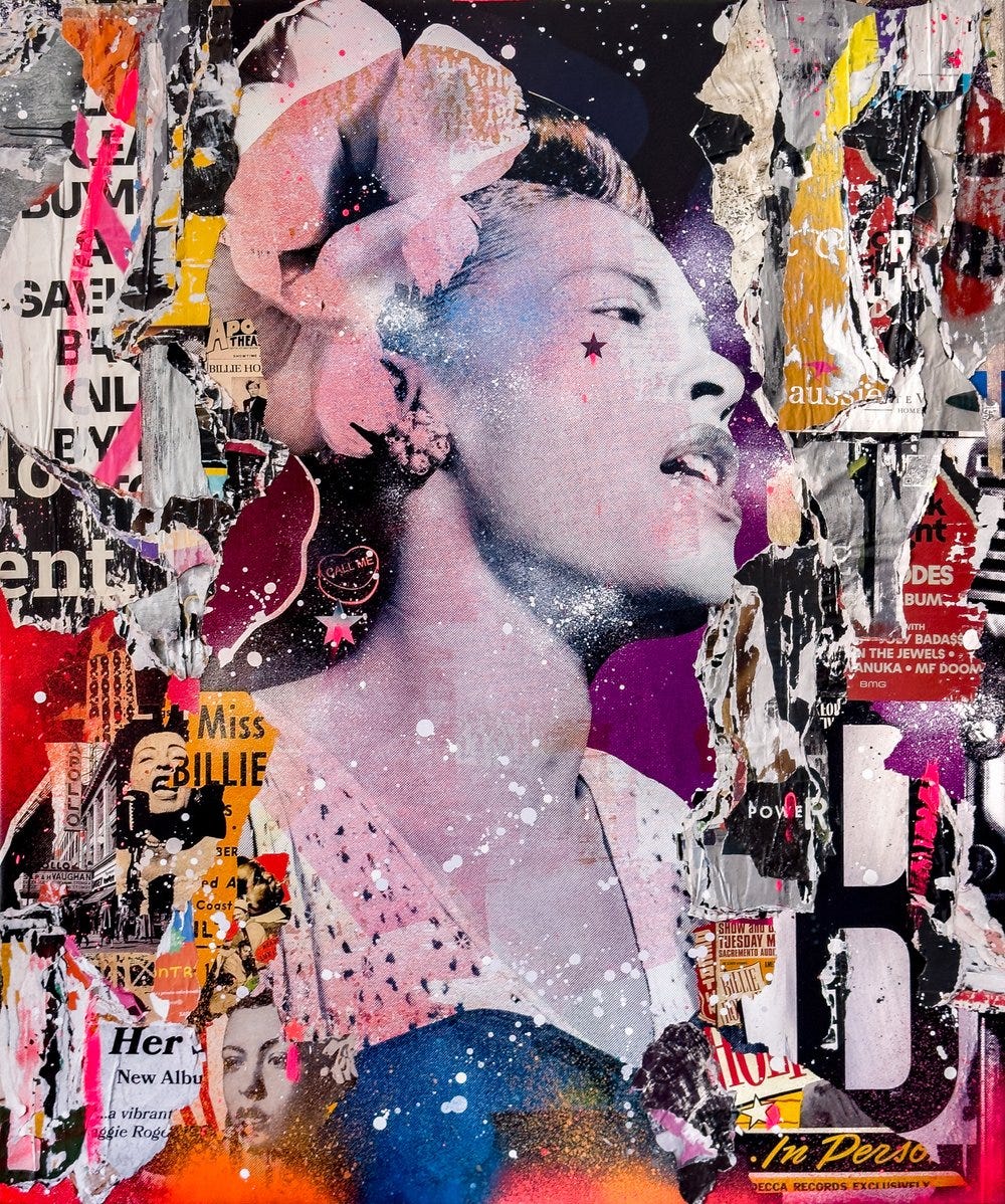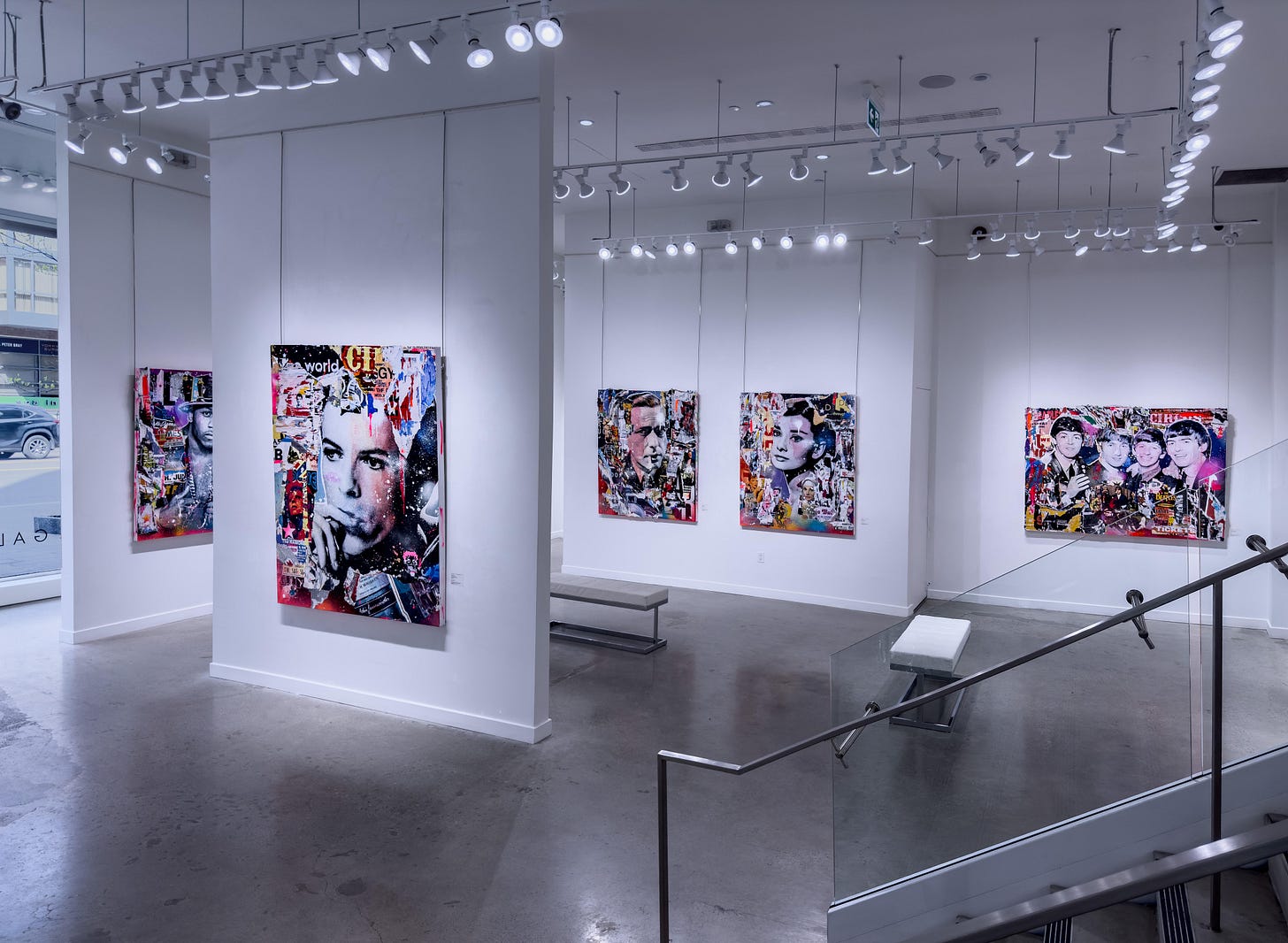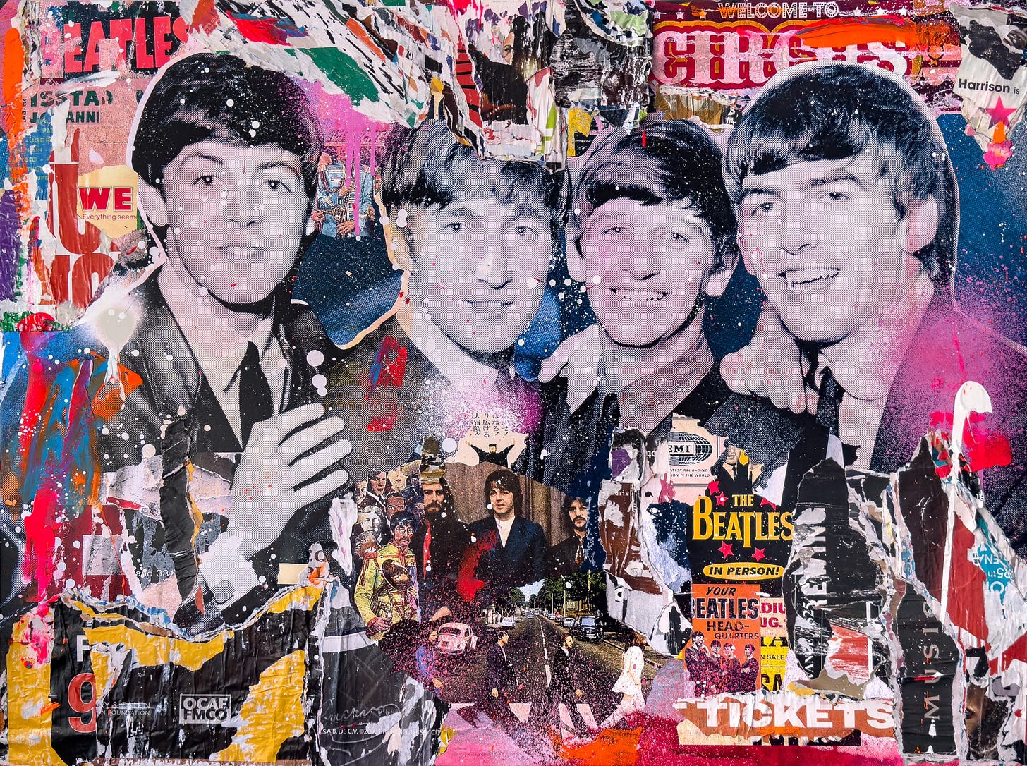 These lively works communicate an appreciation towards vintage pop art aesthetics using contemporary techniques paying homage to the age of modernism. Celebrities depicted range from icons and giants of golden age entertainment such as The Beatles, The Rat Pack, David Bowie, Billie Holiday, Audrey Hepburn, Marylin Monroe, and Paul Newman. The assemblages combine vintage and retro nostalgic appeal with the appearance of torn posters one would see in a heavy urban center like Times Square in New York. These assemblages also combine expressionistic drips, smears, and sprays of bright neon colors typically incorporating hot pink and magenta.