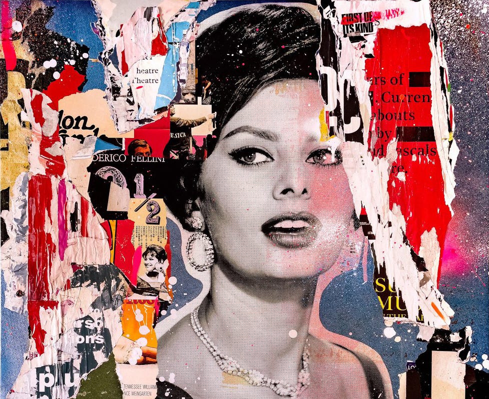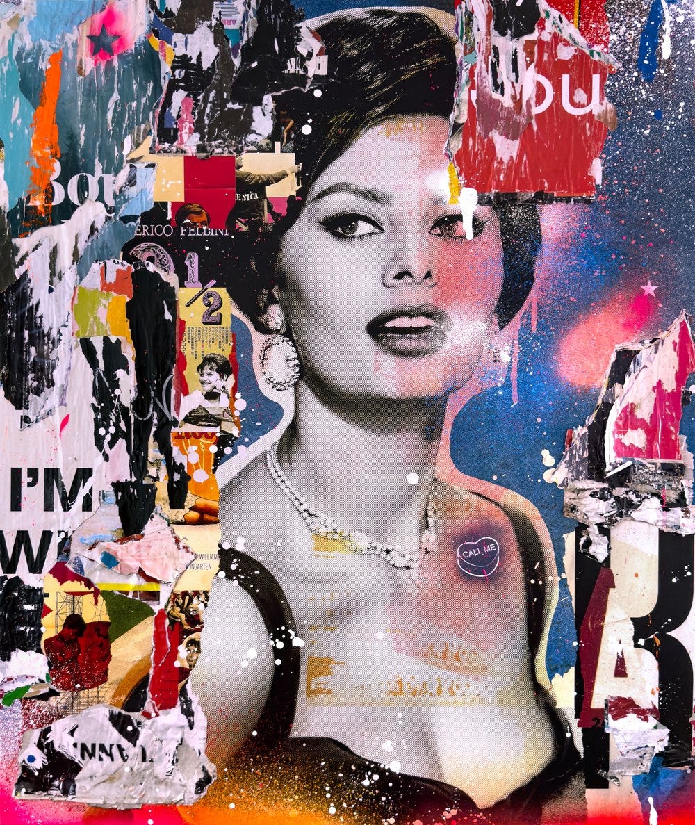 Sophia (pictured above) is one of two varied editions depicting Italian actress Sophia Loren, an icon known for being the first actor to win an academy award for a non-English language performance in the film Two Women. Peter depicts the poster with bright red tears of print accentuated with an abstract landscape of hot pink spray paint below and a glared spray to Sophia’s right. Splatters of white paint dot the background as if Sophia stands in the dark pale, starlit night. Sophia can be regarded as a magical piece and probably Peter’s finest work in the chaotic yet integratively balanced composure of color contrasting bright and dark tones in a symphony which revolves around the print of Sophia Loren.