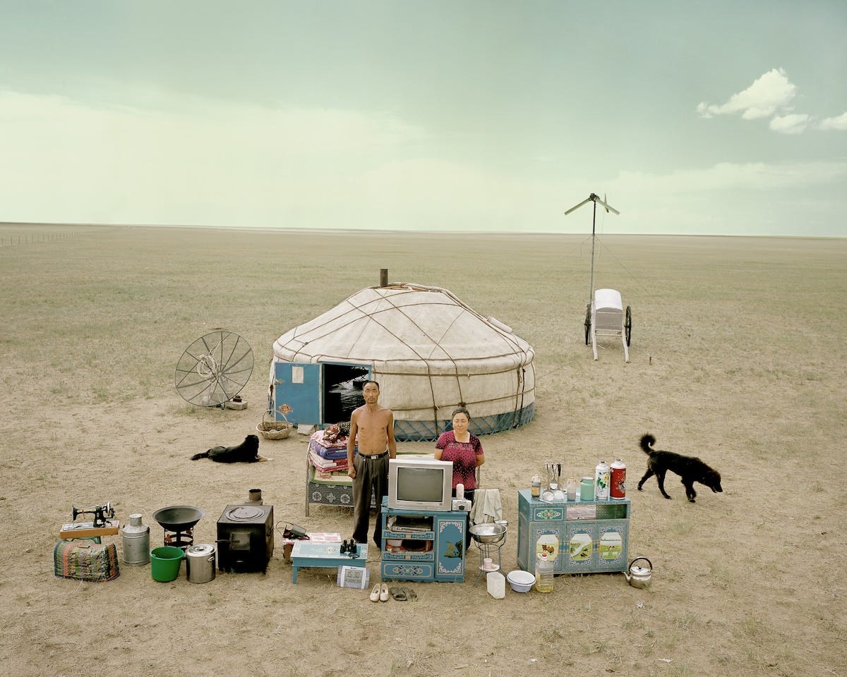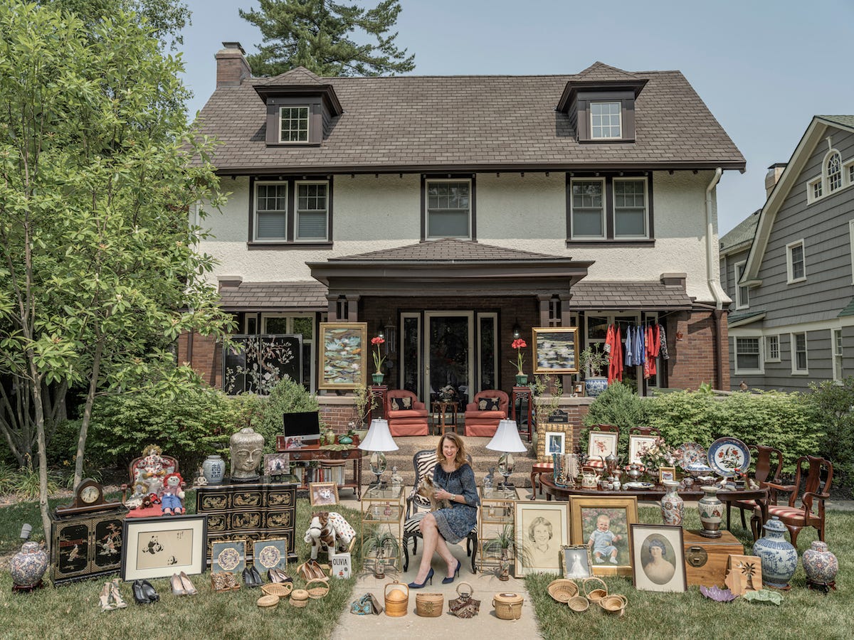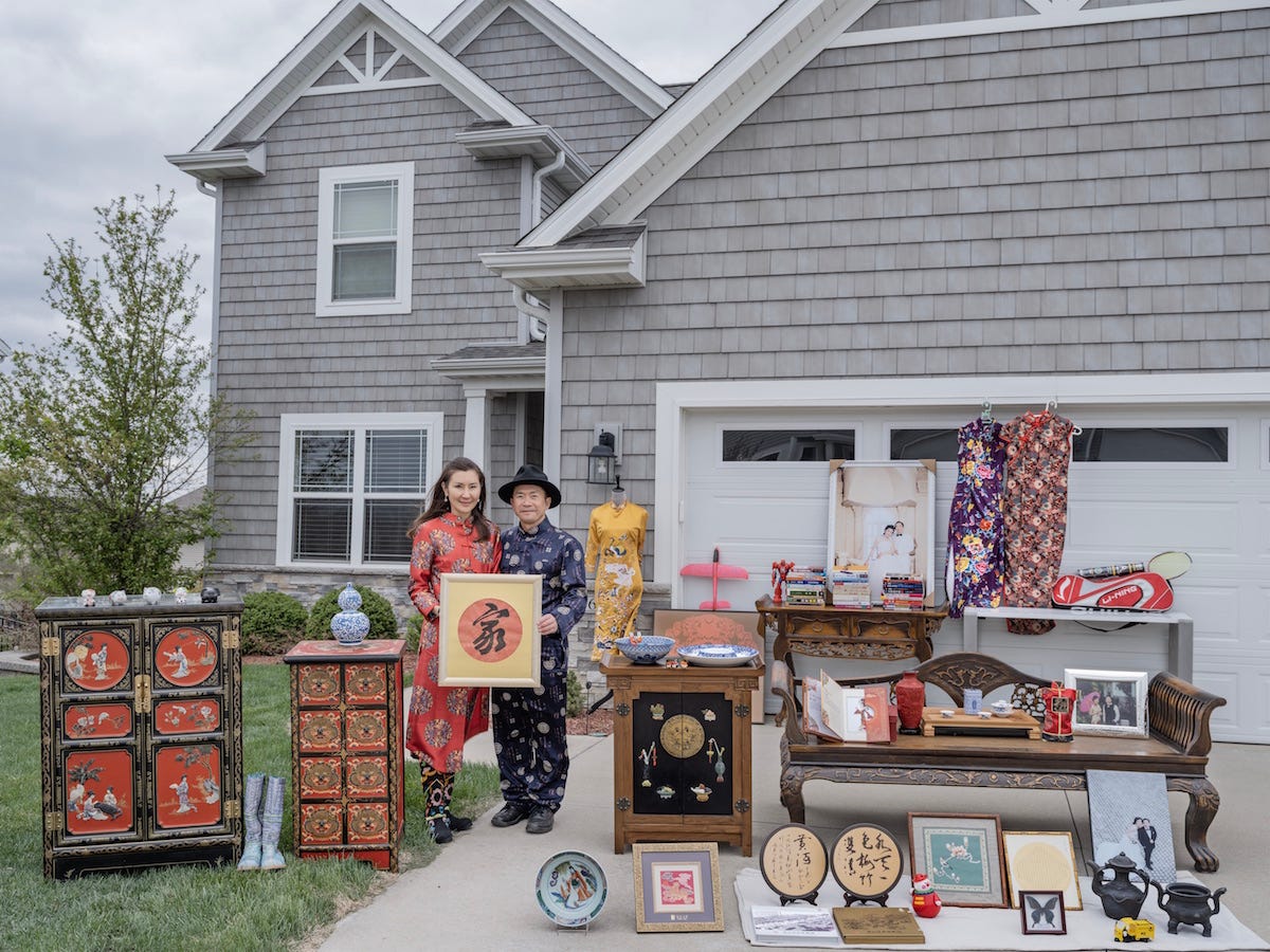 Family Stuff remains a series by Qingjun which explores notions of nostalgia, materialism, and personal connections. Quingjun sets up staged photography as his concept entails having his actors reveal narratives about their past and personal connections. The people within the works are tasked with collecting their most prized possessions, which are often in the form of paintings, vintage photographs of family members, retro clothing, and antiques. Qingjun then curates a sort of exhibition of a person's personal items laid out in front of their home with the homeowner posing along.