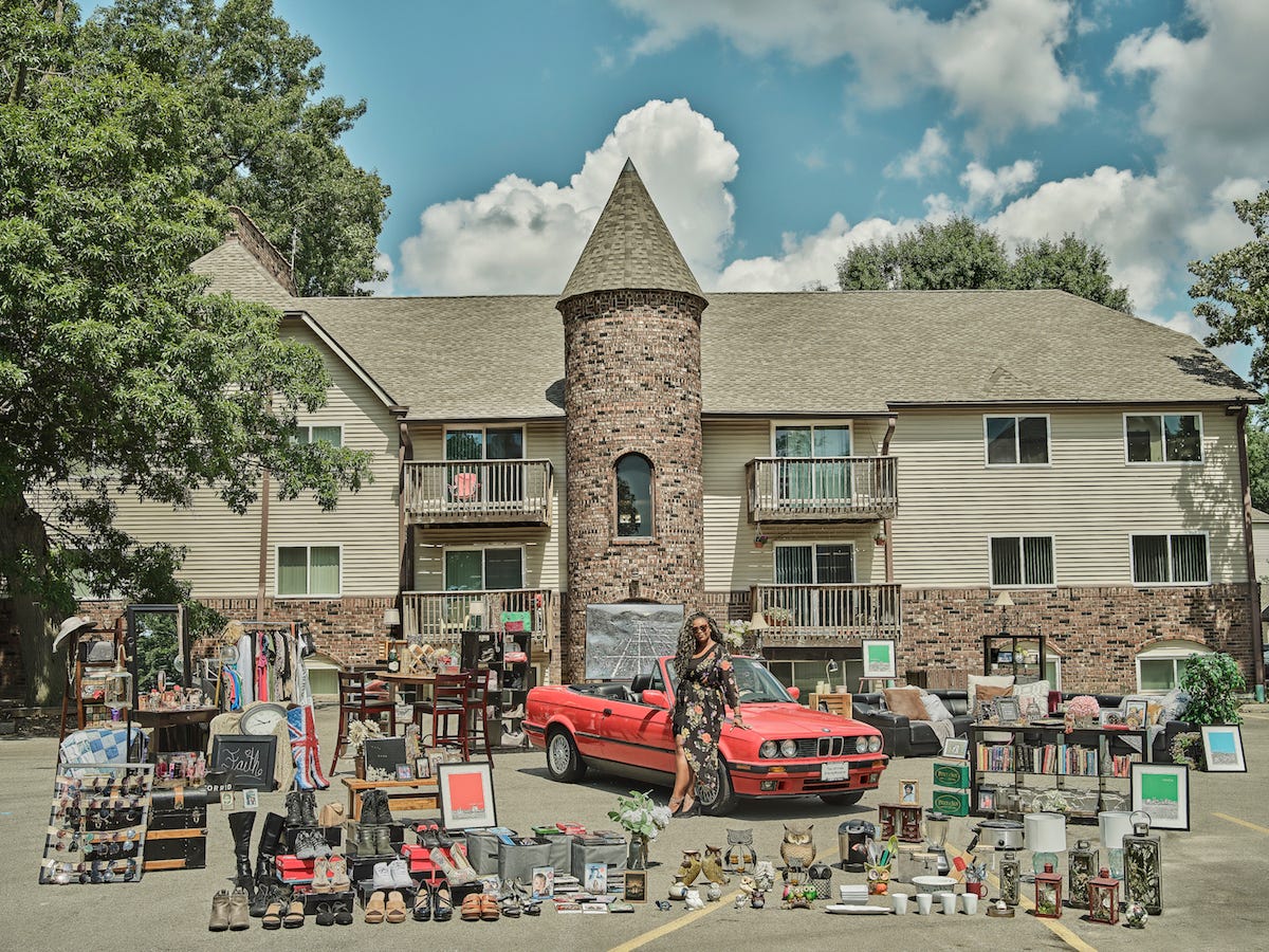 Whitney (pictured above) depicts a woman against her luxury home, vintage BMW, and prized personal possessions displayed in an exhibition for the audience. The piece exemplifies Qingjun's depiction of the home and intimate objects to help describe the character of the subject. As we can see from the photos, the figure seems to have a fascination with shoes and books, suggesting she is fashionable and grounded in intellectual pursuits.
