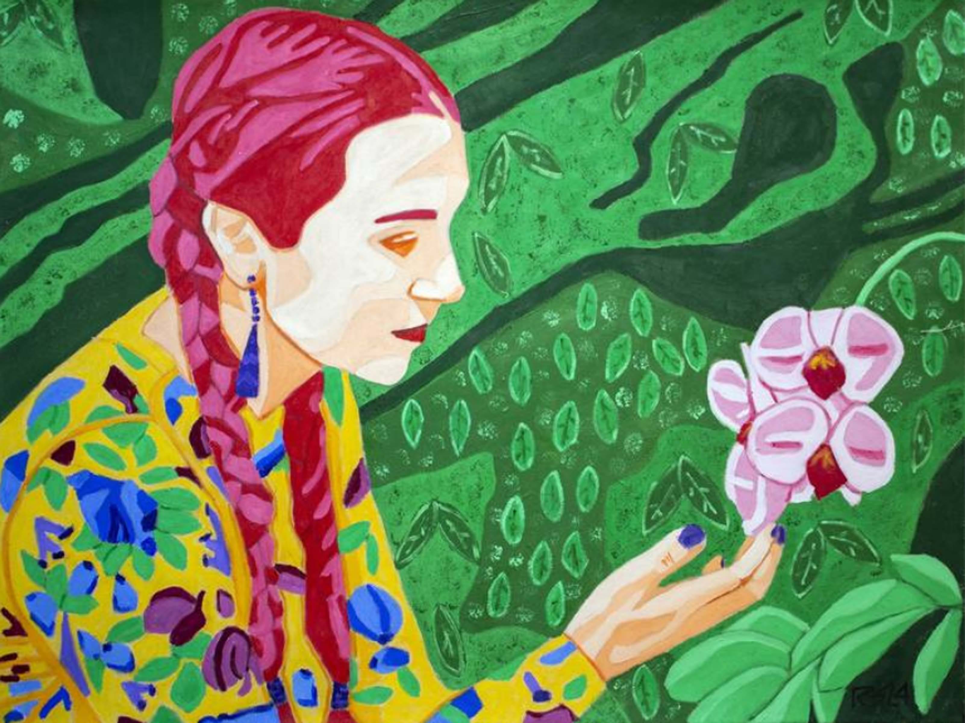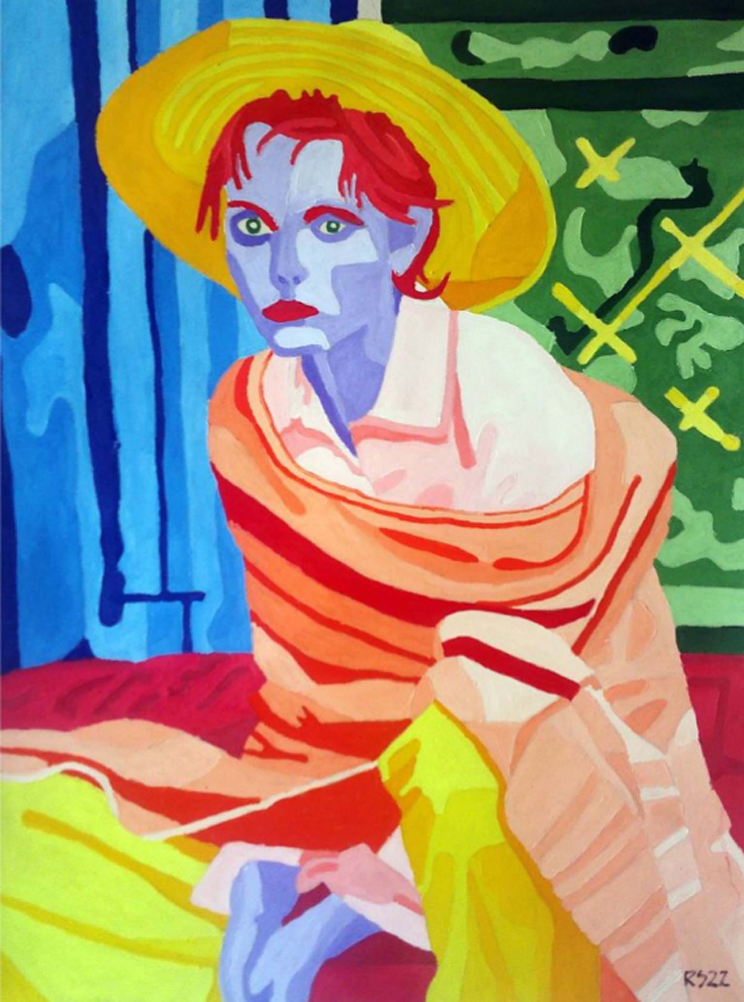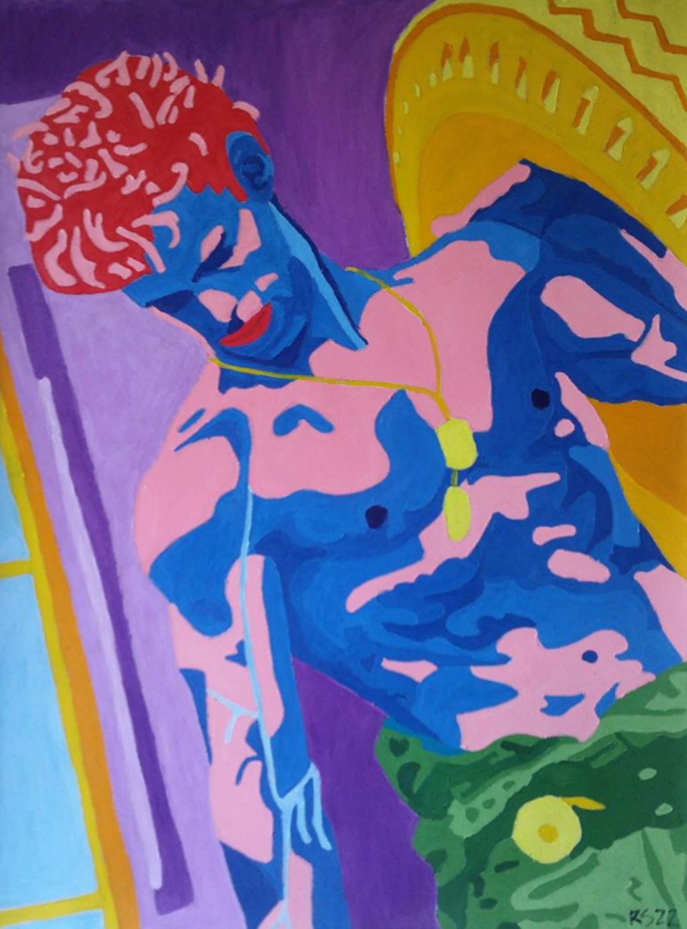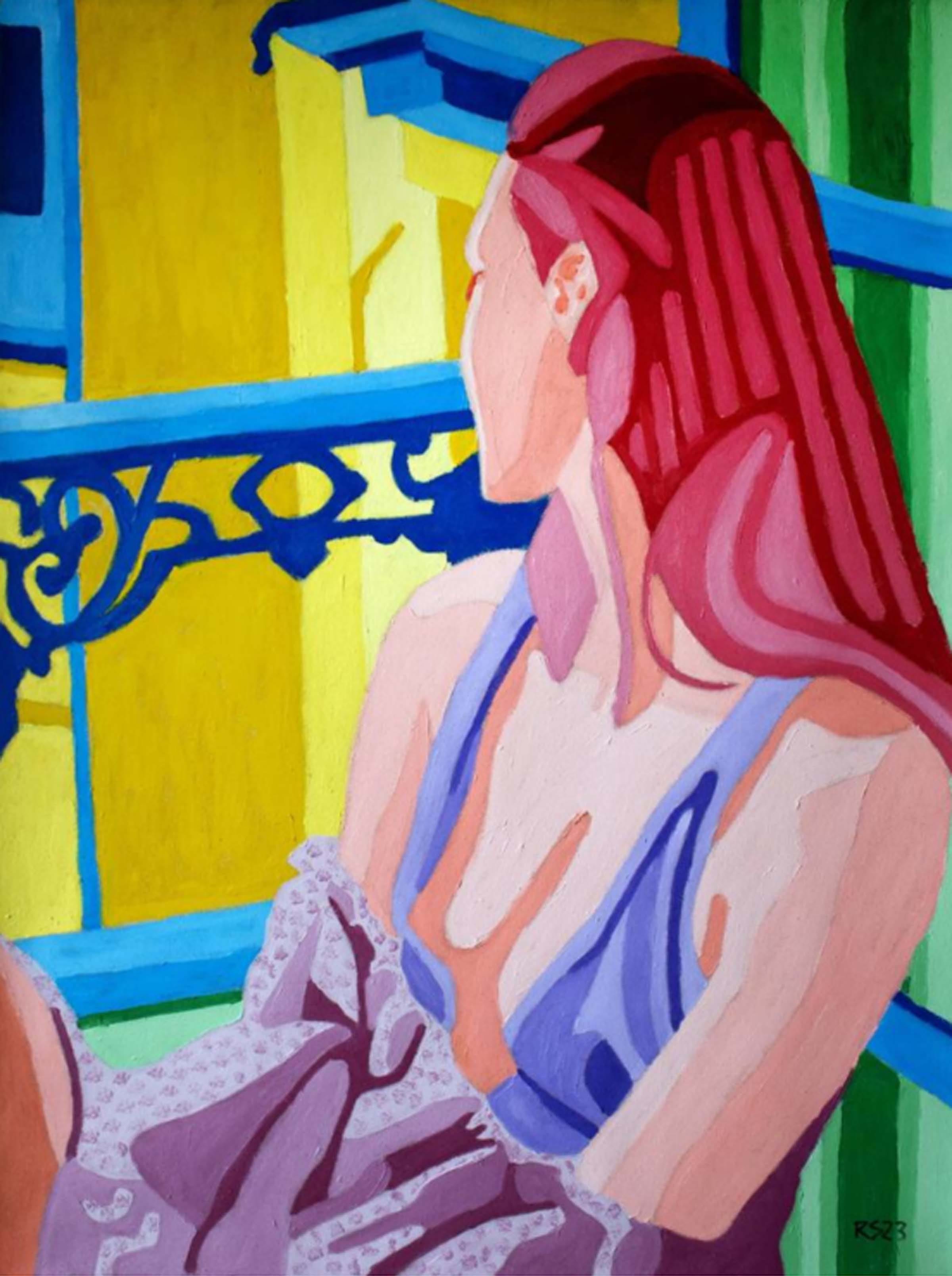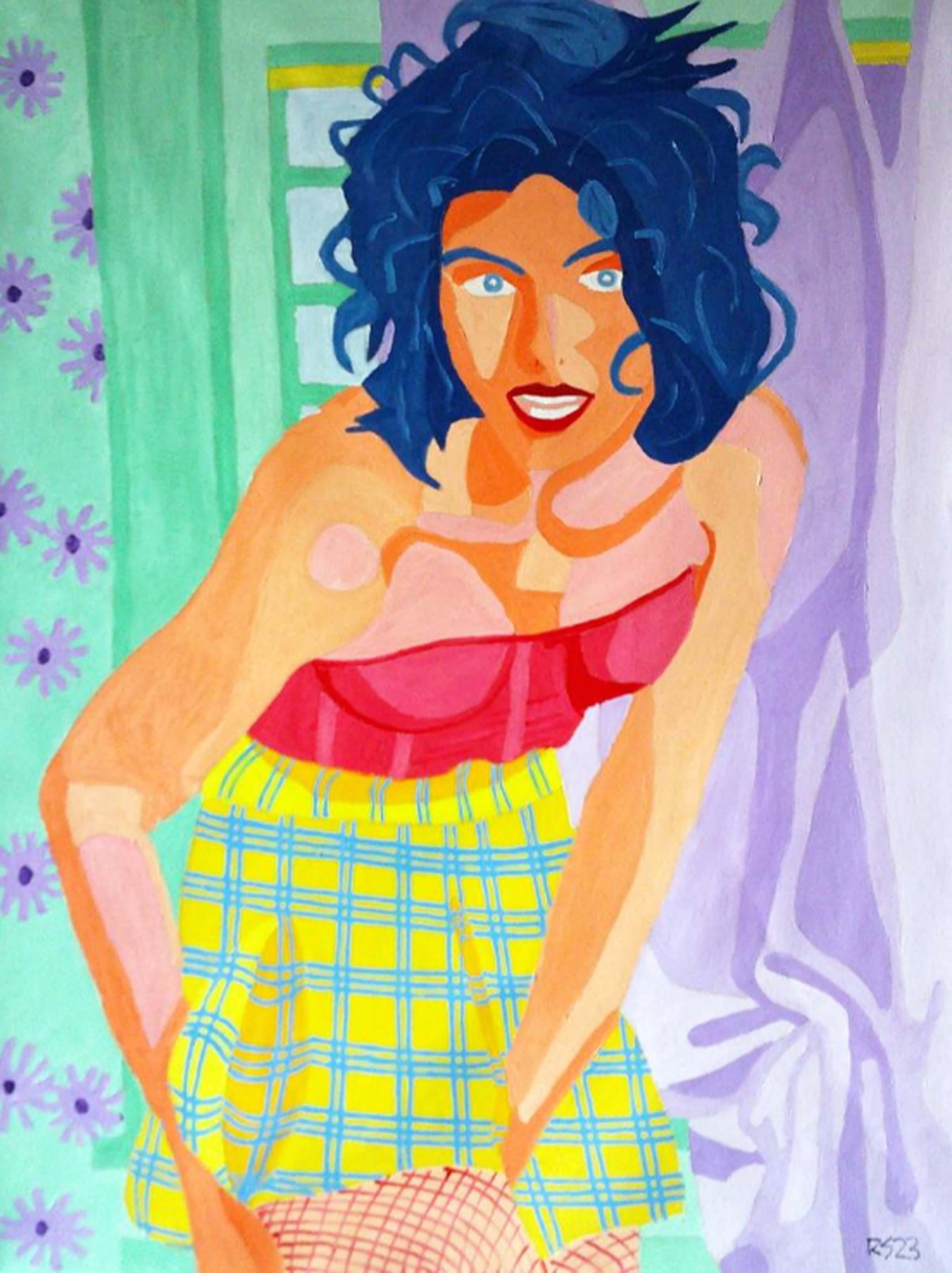 The paintings are immensely colorful figurative mid size compositions which usually measure 40 x 30 inches. Randall focuses on various figures painting either their skin or shadows with imaginative colors and breaks down human form and facial features to flattened geometric shapes. Viewers may notice complex patterns in Randall’s backgrounds and / or fashionable attire on his subjects. The intricate patterned designs are depicted selectively in just a portion of the paintings while the remainder of the composition becomes flattened like a silkscreen print.