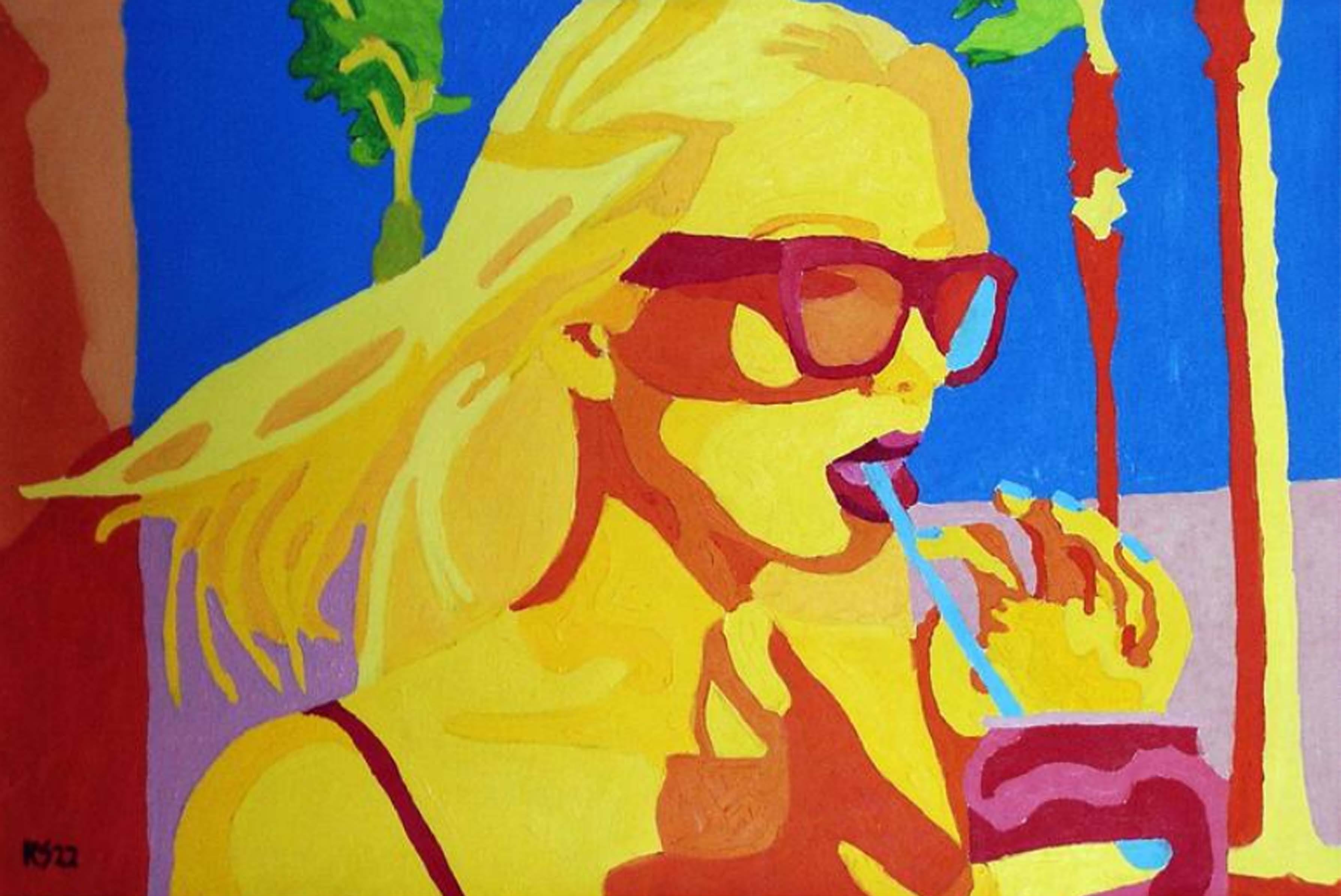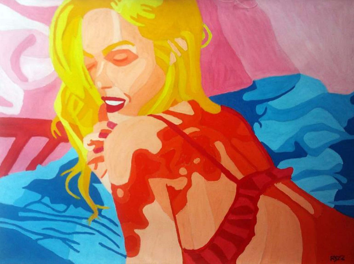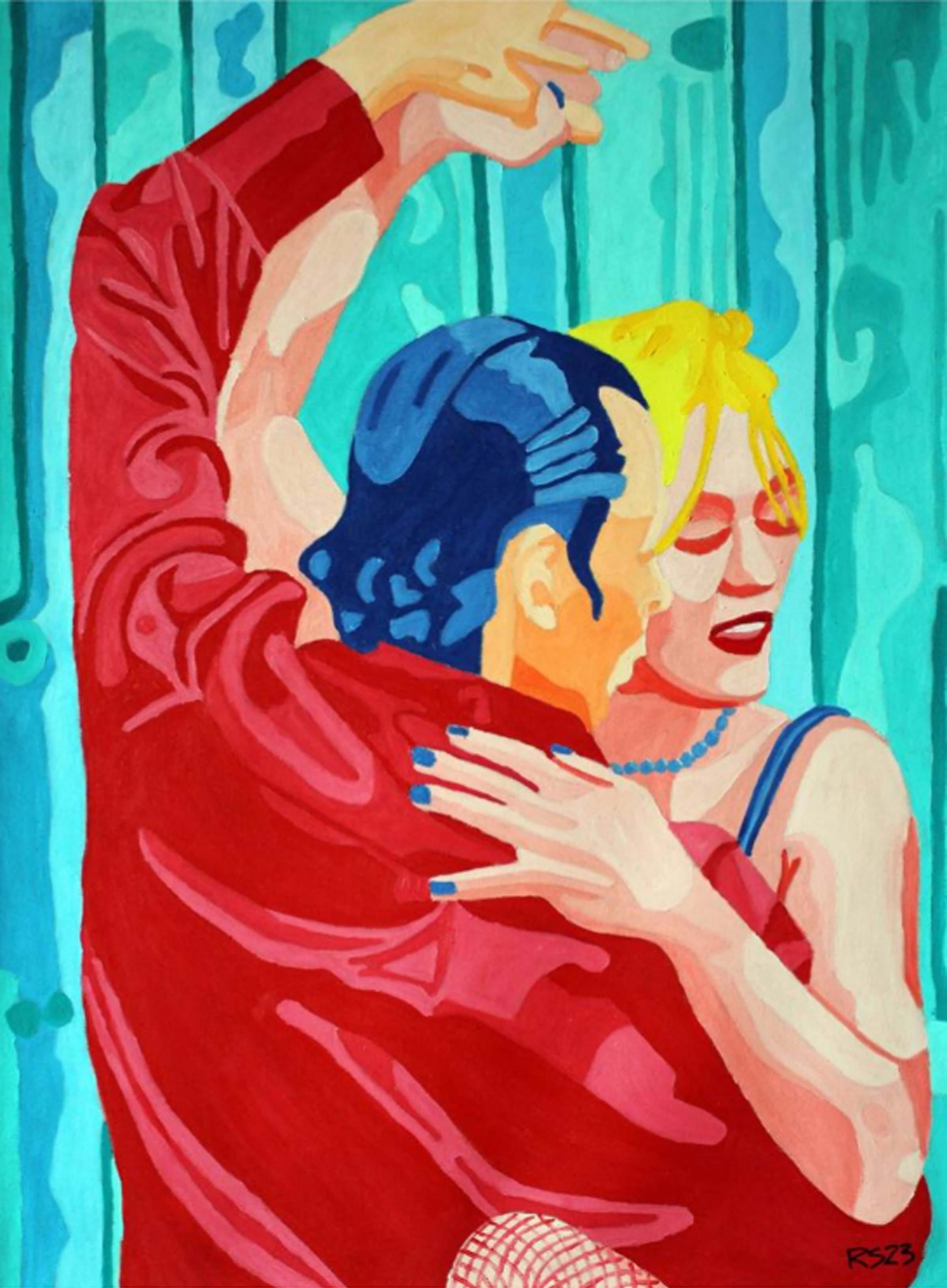 These playful and colorful figures have expressive body language and intense facial expressions accentuated by Randall’s use of various flattened, colorful shapes. Randall mostly sticks to bold neon and pastel colors rather than naturalistic tones with the exception of the portrayal of flesh. The color schematics along with the portrayal of dated hairstyles and clothing contained within the paintings are reminiscent of 1980’s New Wave and pop art aesthetics. These retro and fun features express a sense of jubilation and reflection of cool confidence. Randall’s paintings convey human emotions such as love, intimacy, sensuality, celebration, contemplation, playfulness, and assertiveness through wired body language and the portrayal of stylized facial features such as bulging eyes or figures flashing their teeth in triangular shapes of white.