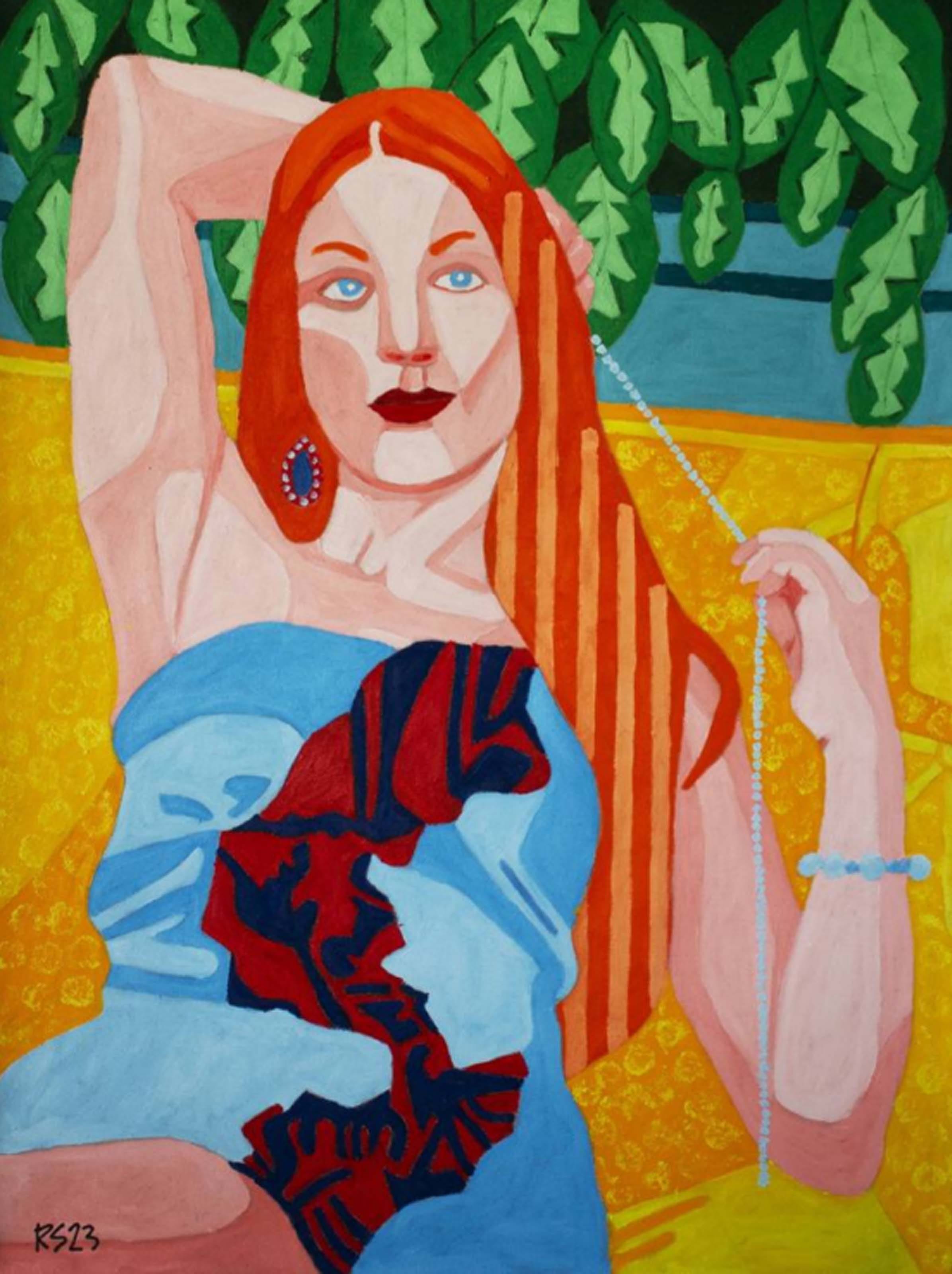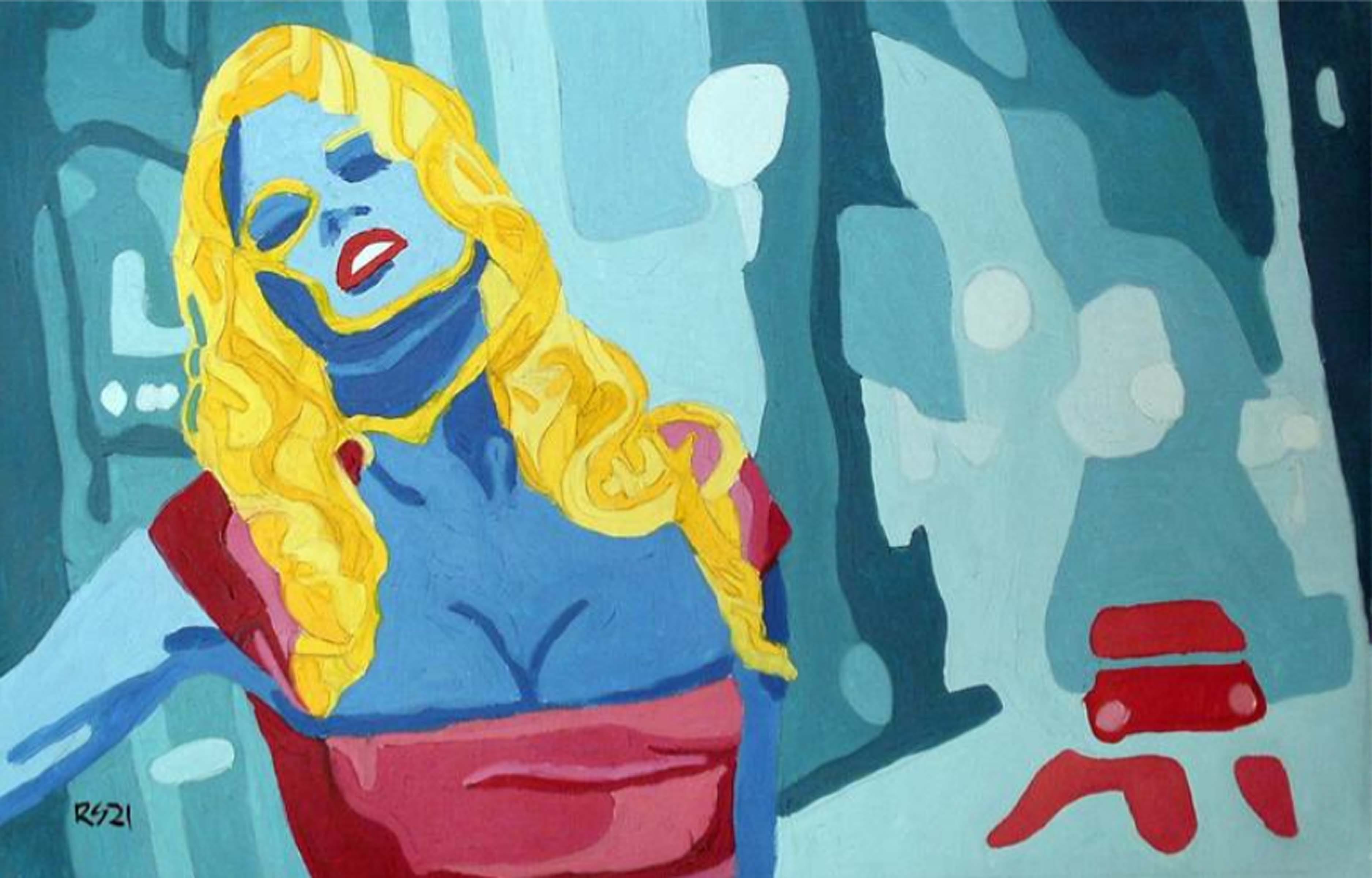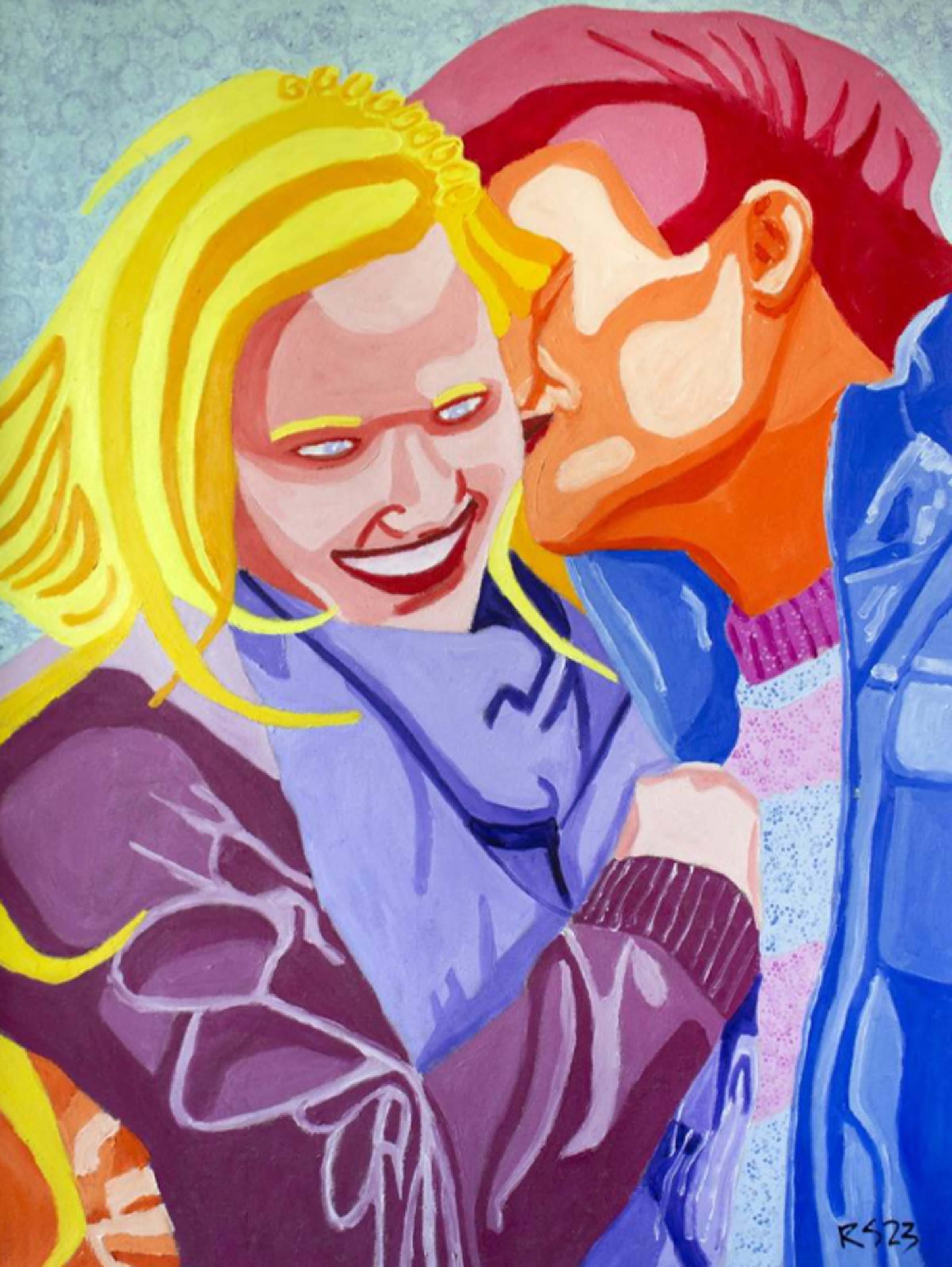 Couple and Kiss (pictured above) remains one of Randall’s strongest pieces. Unlike most of his paintings, the figures fill up almost the entire composition, mostly taken with the portrayal of heavy jacketed chests as if the couple were on a skiing trip. The hair of the figures are presented with bold yellow and maroon while the sweater becomes accentuated with a pastel-toned sweater on the male and scarf on the female. We may observe a clever circular composition not only in the arm of the female and leaning head of the male but also through the presentation of bold, bright colors on the jackets and hair of the figures followed by pastels in the middle with the sweater and scarf. The outfits and hairstyles on the figures clearly look dated as if they walked straight out of the 1980’s and into our view further reflecting retro, pop, and New Wave aesthetics. Randall portrays the woman expressing pleasure through bulging eyes and flashing triangular teeth while the man seems confident with his strong jawline and linear posture.