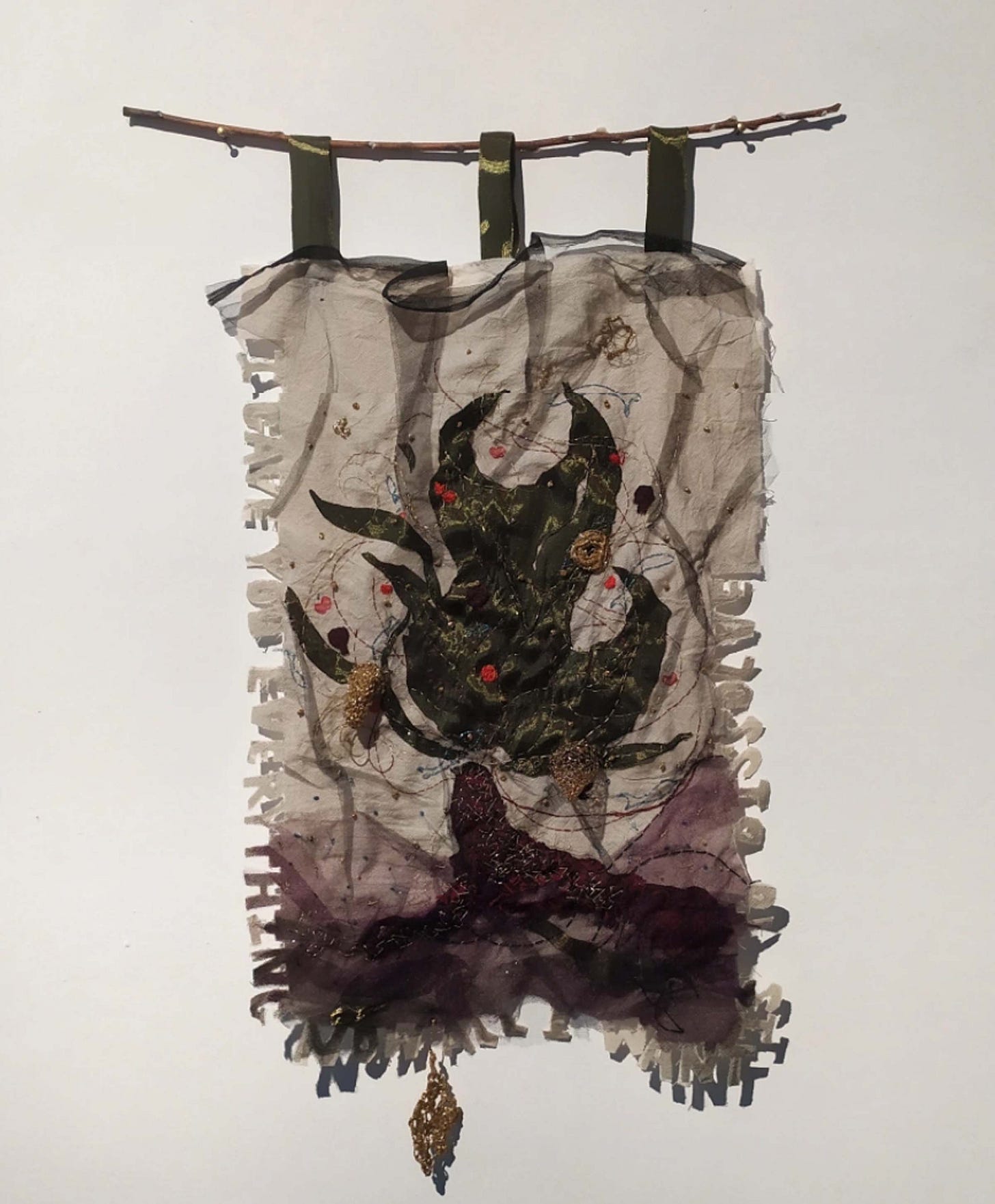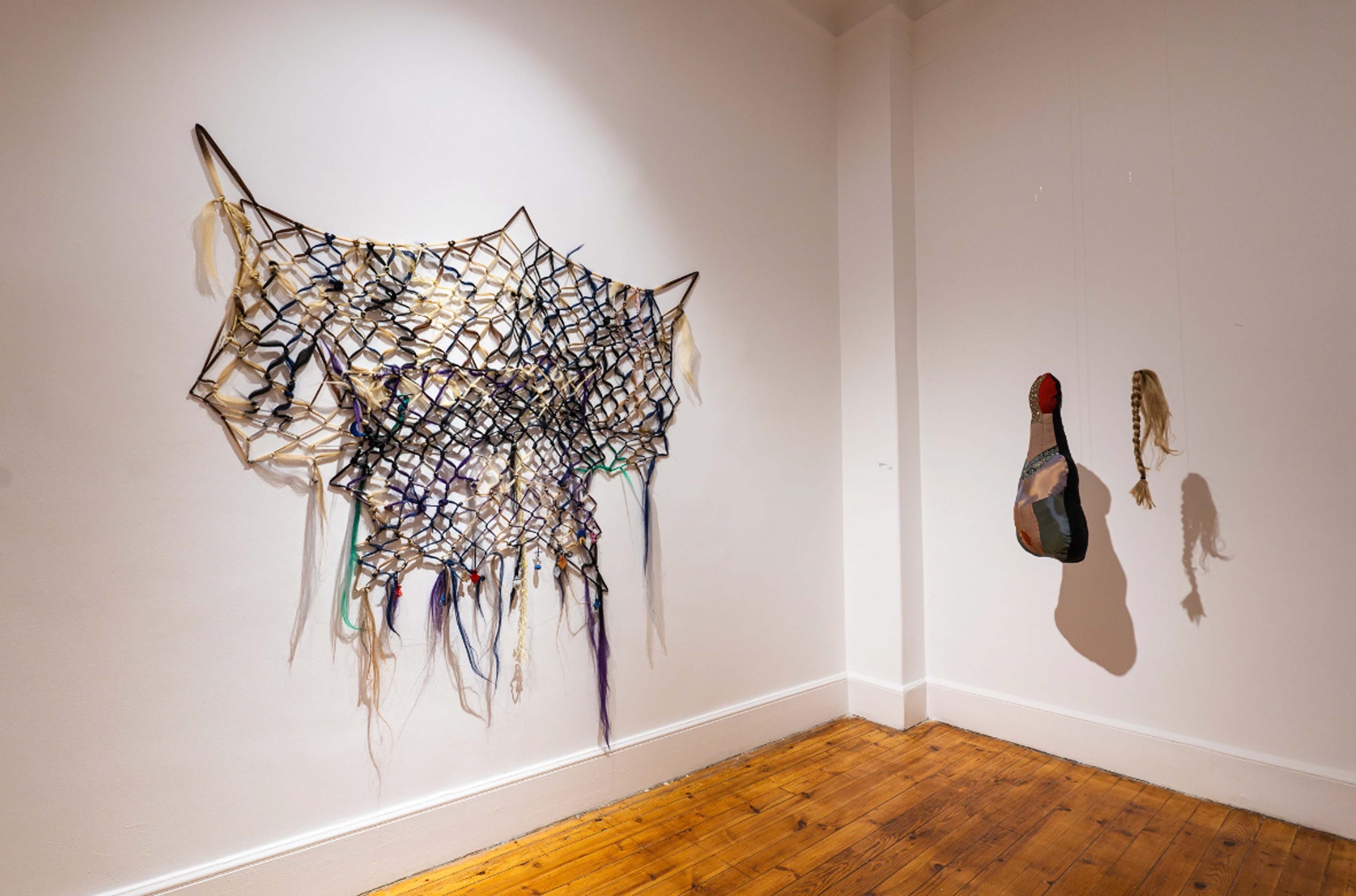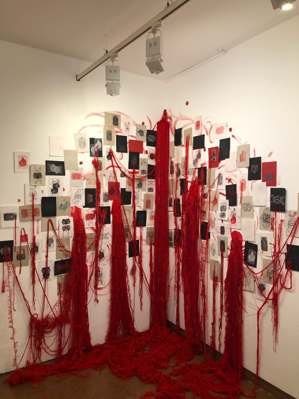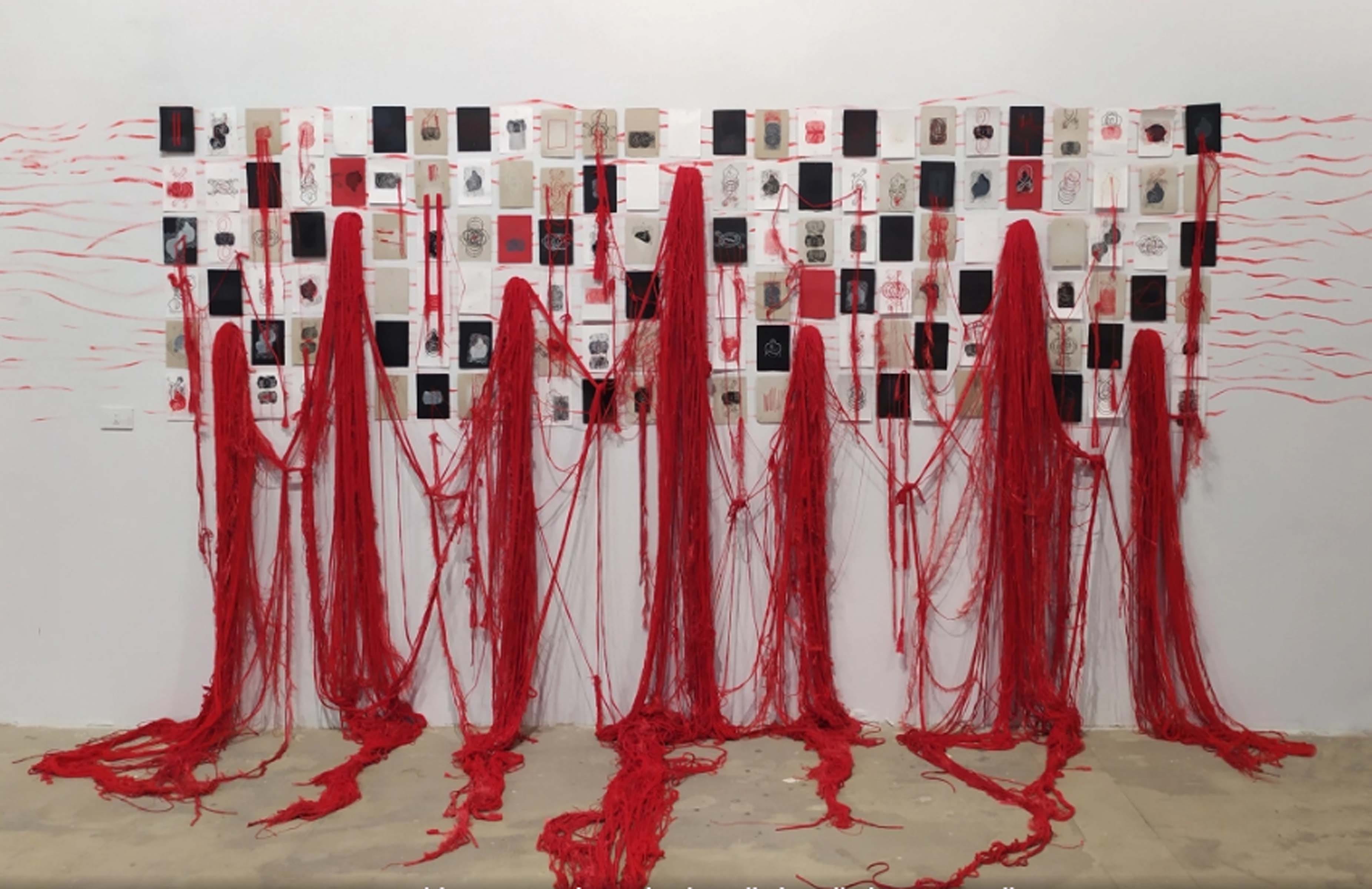 Rawan’s work from the Pine series (pictured above) demonstrates her ability to weave emotion and complexity into fiber art. In this installation, a network of red yarn cascades down the wall, entwining and connecting a grid of small, mixed-media artworks. Vivid red fibers create a striking visual contrast against the white wall, evoking a sense of raw energy. Her choice of color and material emphasizes themes of connection, entanglement, and the flow of life. The intricate connections between the yarn and the artwork suggest a delicate balance between chaos and order, with the threads perhaps symbolizing lifelines or veins pulsating with vitality. Rawan’s meticulous arrangement of elements invites viewers to explore the interplay of textures and forms, provoking thoughts on how individual experiences and stories are interwoven into a larger tapestry of existence.