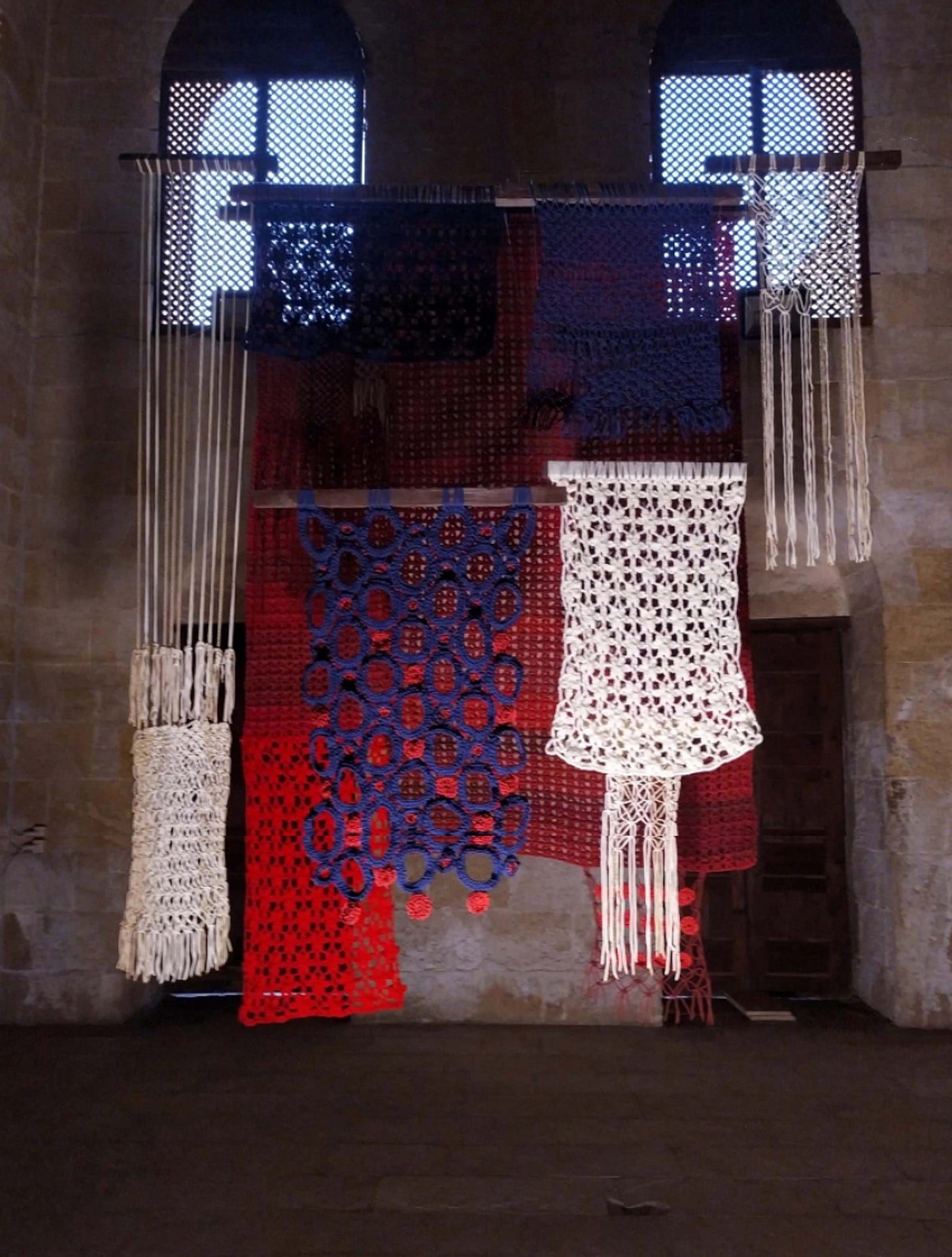 Her work from the Tight Knit series (pictured above) exemplifies mastery of fiber arts, captivating viewers with complexity and depth. Composed of woven and knitted fabrics, pieces hang in a layered formation, drawing our eyes to detailed textures and vibrant colors. The interplay of red, blue, and white fibers against a dimly lit backdrop enhances the visual impact, emphasizing the handmade quality. Each segment showcases different knitting and weaving techniques, reflecting Rawan’s deep understanding and skill in fiber arts. The intricate patterns and varied textures invite close inspection, revealing the meticulous labor involved. Hanging elements evoke a sense of movement as if the fabric is transforming, adding liveliness to the medium. By suspending the tapestry in an architectural setting, Abbas creates a dialogue between old and new, rigid and flexible, bridging gaps between traditional craftsmanship and contemporary expression. The piece demonstrates Abbas’s technical abilities and invites reflection on themes of connection and continuity.