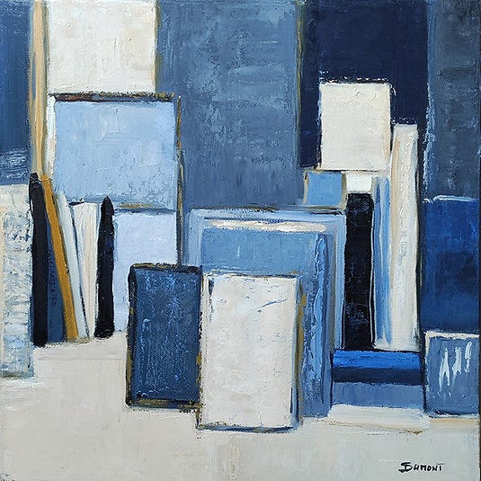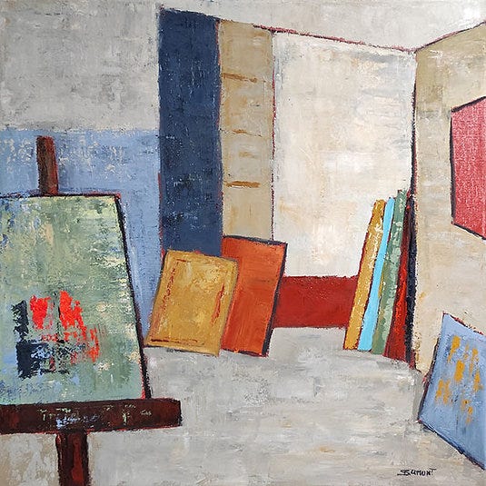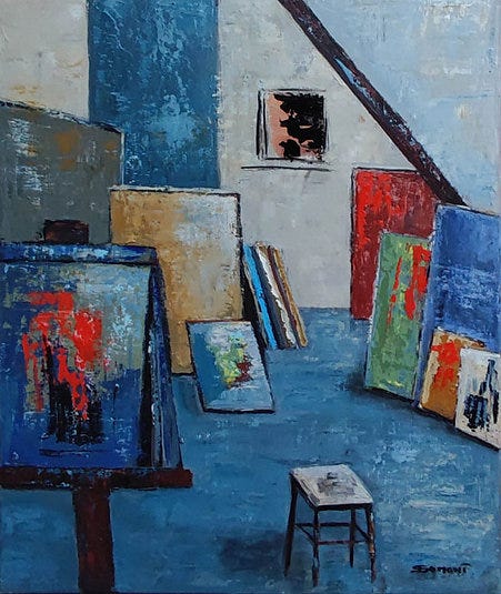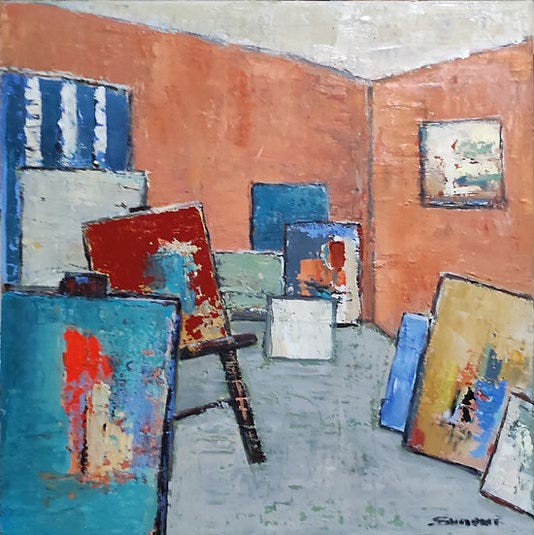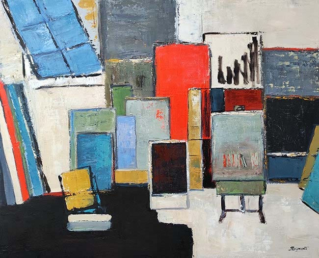 The entire portfolio of paintings range in subjects from landscapes, libraries, sea paintings, studios, abstract, nudes, horses, and trees. For the purposes of the article we will focus on Sophie’s libraries and studio paintings. These two particular collections of works instill a sense of solid structure and discipline of geometry. The subjects of libraries and studios are not interesting because of their inherent meaning but rather because their structure contains fascinating compositional components. Sophie can be described as a painter more interested in the how rather than the what, how she approaches her art remains more important than the conceptual meaning of her subject. In essence, we can describe the paintings as art for art’s sake, a study in form, structure, paint, and surface to be appreciated in their purest forms.