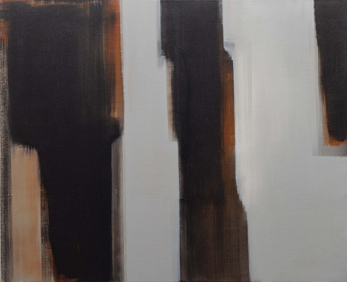 Usually monochromatic or containing dual neutral tones, the various works, no matter which medium, communicate a peculiarity and unfamiliar surface. Although the works may appear non-objective they are in fact conceptual pieces carefully composed to convey various emotional impulses. The works either sit on the plane of the surface in blocks of form or through rapid streaks and smears conveying minimalistic and color field painting design principles. Sometimes appearing like hints of forms such as a pair of legs or views of the ocean, Tomasz distorts his subjects to be unrecognizable or having the audience question whether the works are complete abstractions or deliberate distortions.
