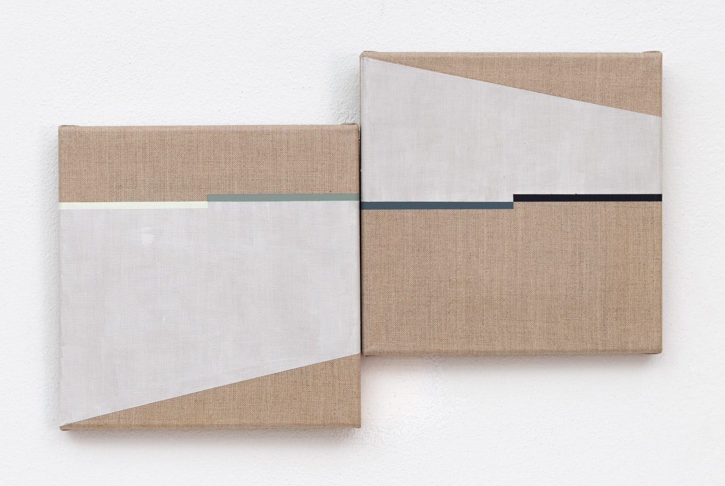 Vacant Space # 17 (pictured above) remains a small disjointed diptych which best communicates Tomasz minimalist concepts and design principles through purity of form and just hints of variation. Severely angular, the painting contains just 4 thin stripes of rectangles to indicate separation of form from the white elliptical triangle shapes against the raw canvas. Like dislodged mountains or an abstracted form of a Mercedes Benz, the painting’s peculiarity challenges the viewer’s notions between objectivity and abstract geometry.
