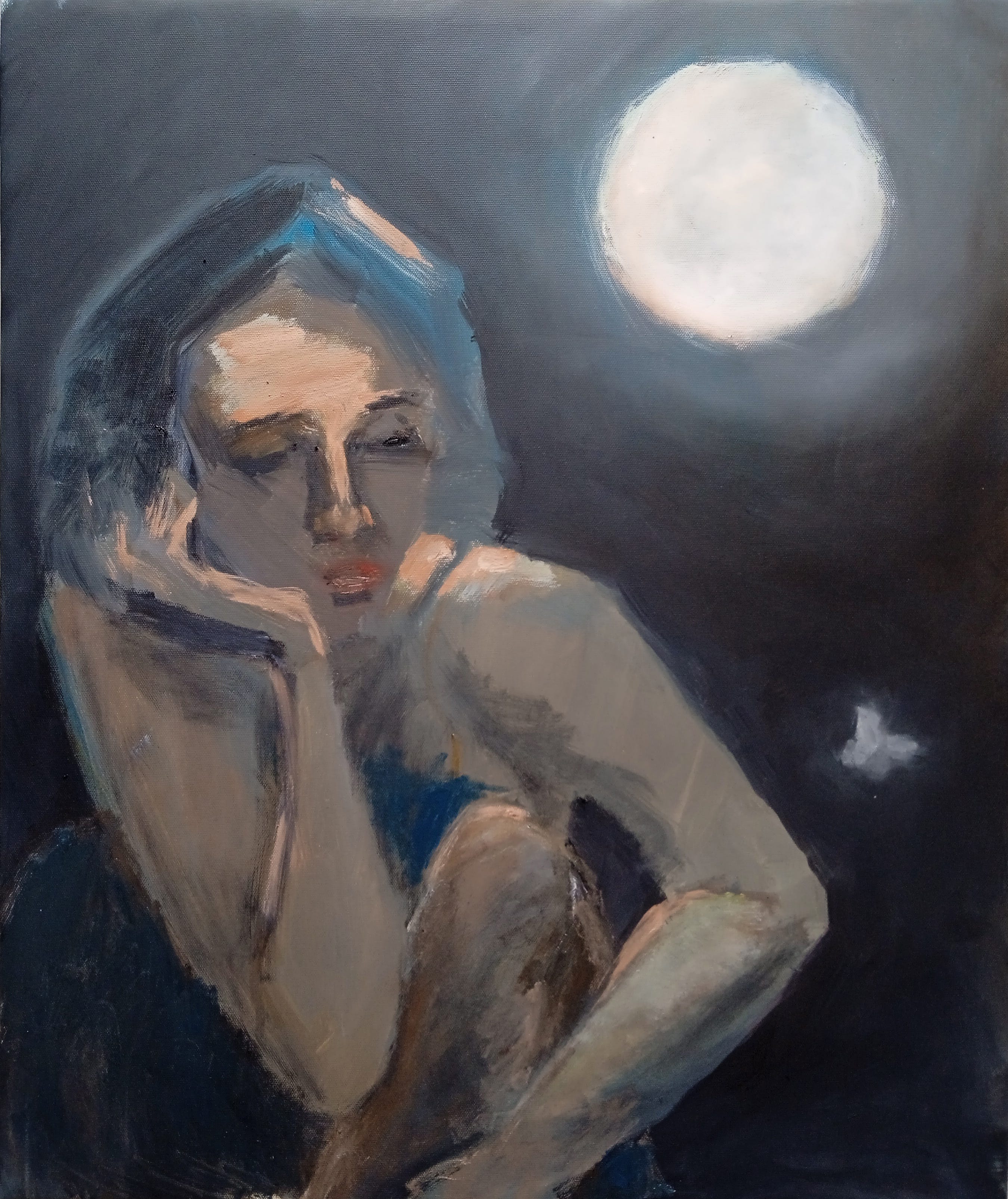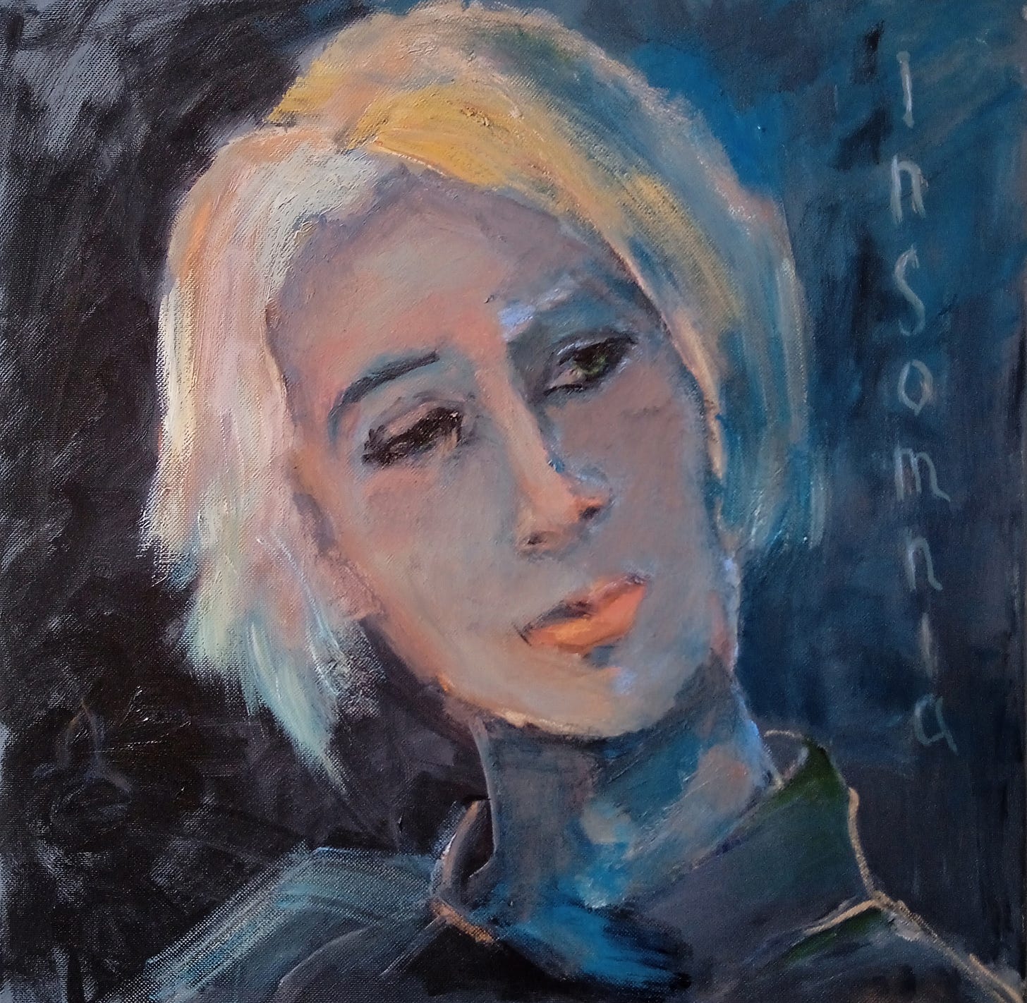 Insomnia (pictured above) and Insomnia 1 (pictured below) are self portraits of the artist engulfed in darkness portraying a darker side of herself. These two paintings are much more expressionistic than most of her paintings portraying figurative distortions and contain flattened shadows and form. The paintings still appear naturalistic however have soft touches of blue contrasting against dark backgrounds. Signaling a sense of isolation and loneliness in the darkness therefore portraying the condition of insomnia.