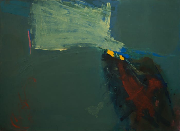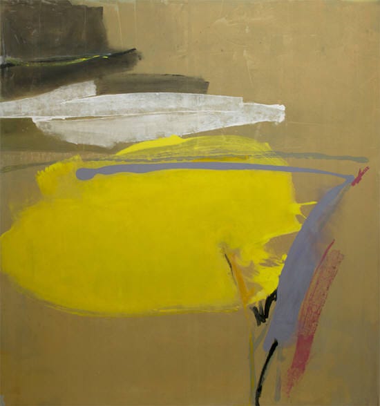 Finale (top of article) reflects a sophistication in assymetrical form, flatness, color, variation of brush and linework. While many abstract works may come off as flying forms of paint, we may appreciate the utter flatness of Finale, which some may argue is the way a painting should be. Paint and surface are reflections of two-dimensionality, the flatness of the painting denies the notion of illusion grounding the viewer in reality and mindfulness. We may meditate on the state of paint, the poetry of surface, and the intellectuality of fluid line quality.
