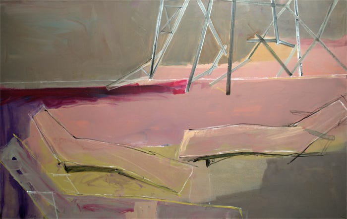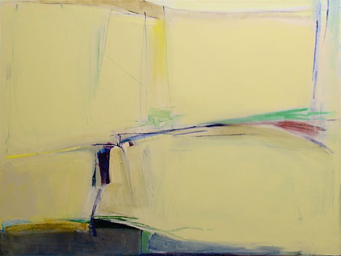 Semper ad Meliora (pictured above) implies an improvement in the meaning being ‘always towards better things’ in Latin. The sheer splendor of the ocean of Naples yellow across vast quantities of the surface gently caresses minimal scratchy linearity and a handful of blocked brushstrokes. The composition almost reflects a window-like shape with a seesaw-appearing form in the foreground. With the balance of the seesaw, we may observe a shift of weight with paint towards the left side affecting the equilibrium of the composition. Wendy depicts the left portion of the seesaw-like form with pristine lemon yellow which harmoniously melts towards the similar Naples yellow background while the right side has contrasting red and green brush strokes. A push and pull, a yin and yang. Such a strategy seems unlikely to be improvised and certainly intentional.