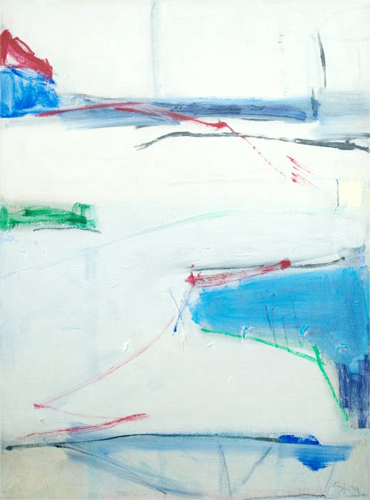 Wendy Skog offers pristine abstractions which reflect the nature of paint as a vehicle of substance rather than illusion. She allows us to enjoy the moment, and encourages us to reserve judgment in associations, even though we almost have to in order to analyze the art. Through intuition, experience, and a contemporary spirit, Wendy Skog provides us with paintings which provide a complete and universal understanding of the philosophical teachings of Aristotle and Clement Greenberg. Denying the illusion can potentially be more powerful than recreating the spectrum of a mirage.
