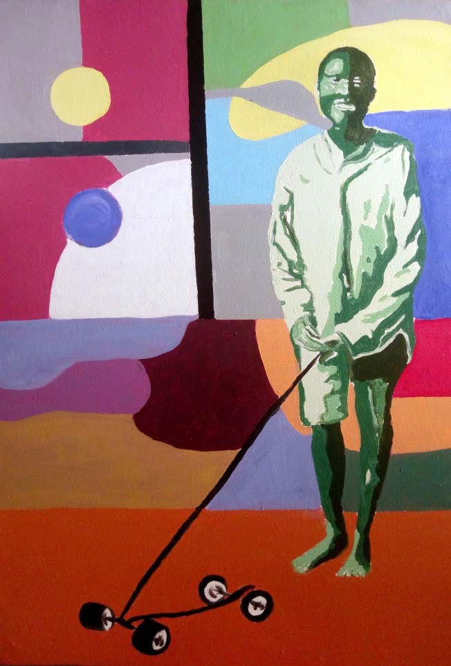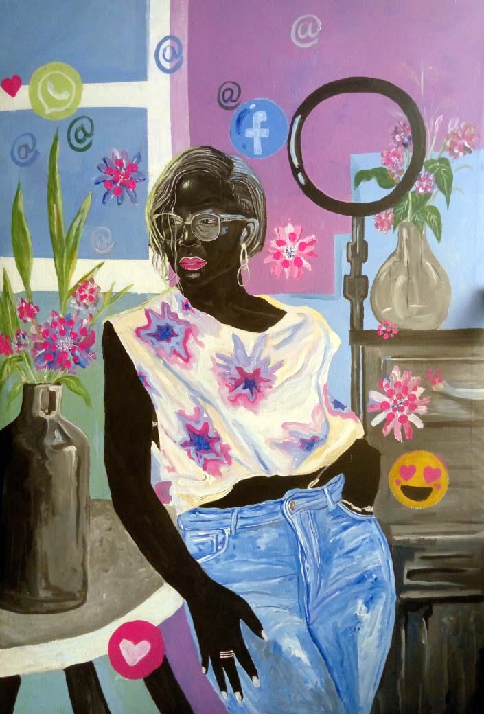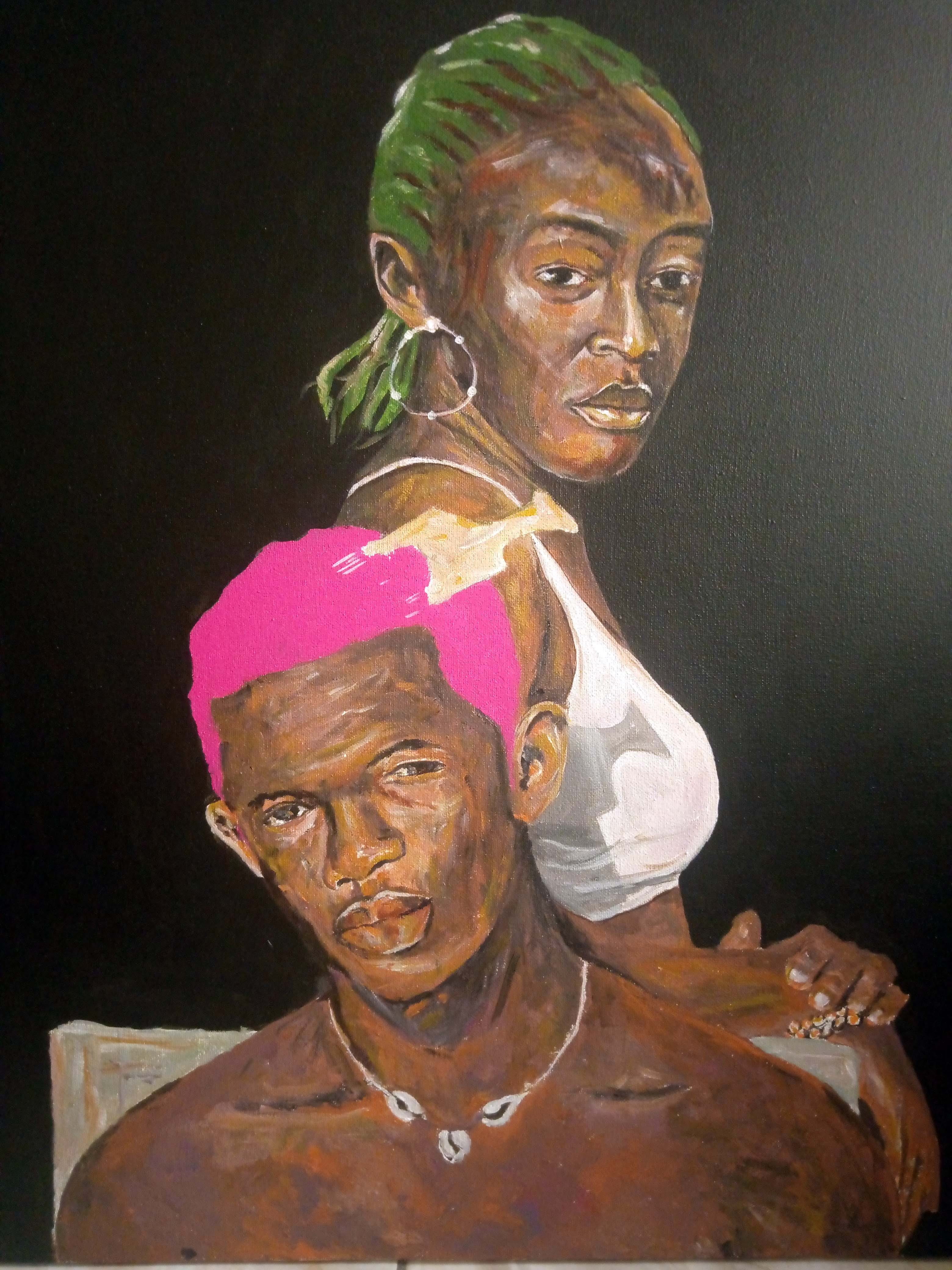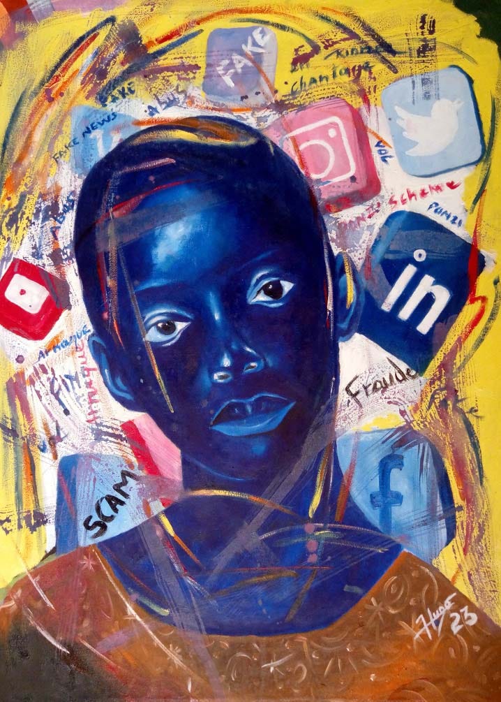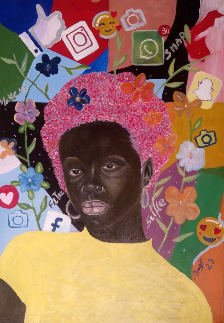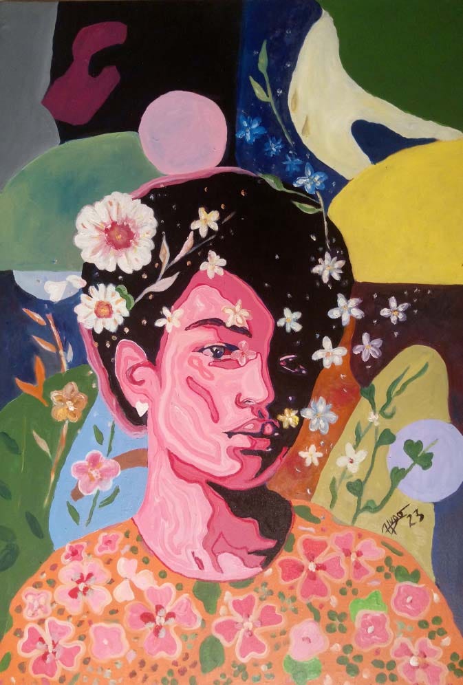 Yemming Charles Hugues is an emerging artist who focuses primarily on contemporary figure and portrait painting. His exhibition resume starts in 2021 and he has exhibited in several shows in African and South American countries including Cameroon, Nigeria, Brazil, and Argentina. Yemming received a prize of distinction regarding best pictorial work in the Connecting Borders exhibit in Cameroon. His paintings convey contemporary symbolism along with backgrounds of abstracted forms interacting with his representational portrayals of figures.