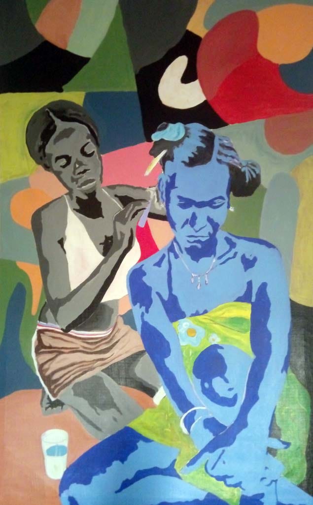 Peindre signifie penser avec son pinceau (pictured above) portrays a hair stylist (or perhaps a friend) fashioning the hair of a subject in the foreground portrayed in cerulean blue. The women wear beach-like attire indicating a summer season or perhaps an indication the figures are on their way to shore. The color on the stylist appears nowhere on the composition while the figure in the foreground has the lemon yellow on her skirt repeated in the background and blue tone reflected in the drinking water to the left of her. A fascinating approach to depicting warmth followed by a balance of strategically placed cool tones for balance.