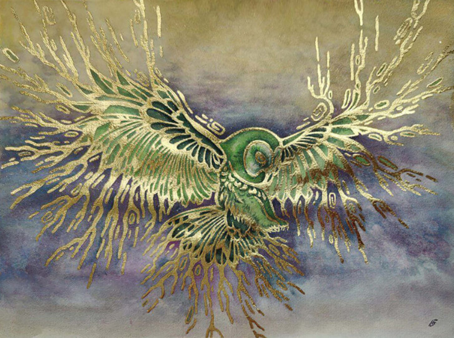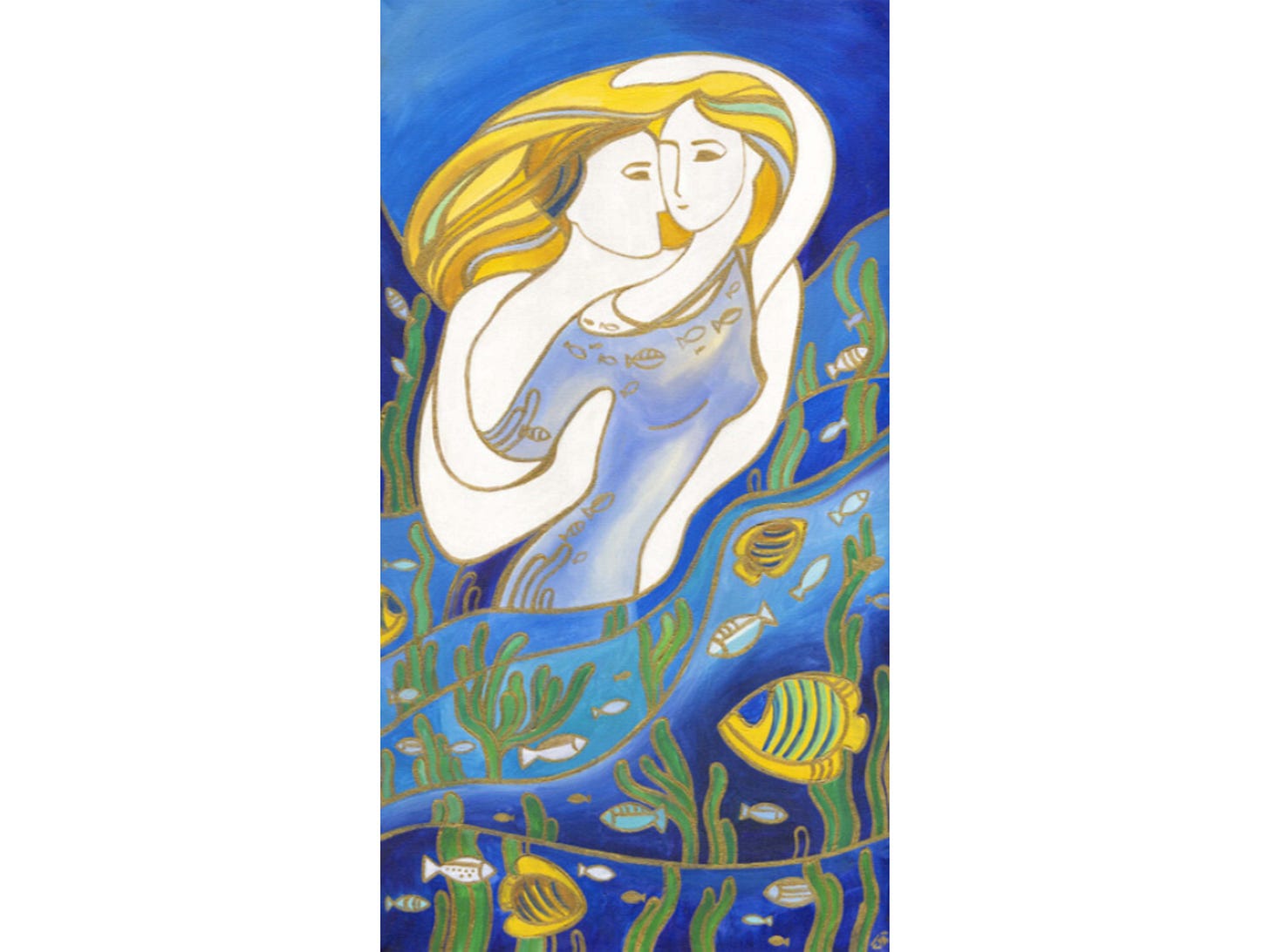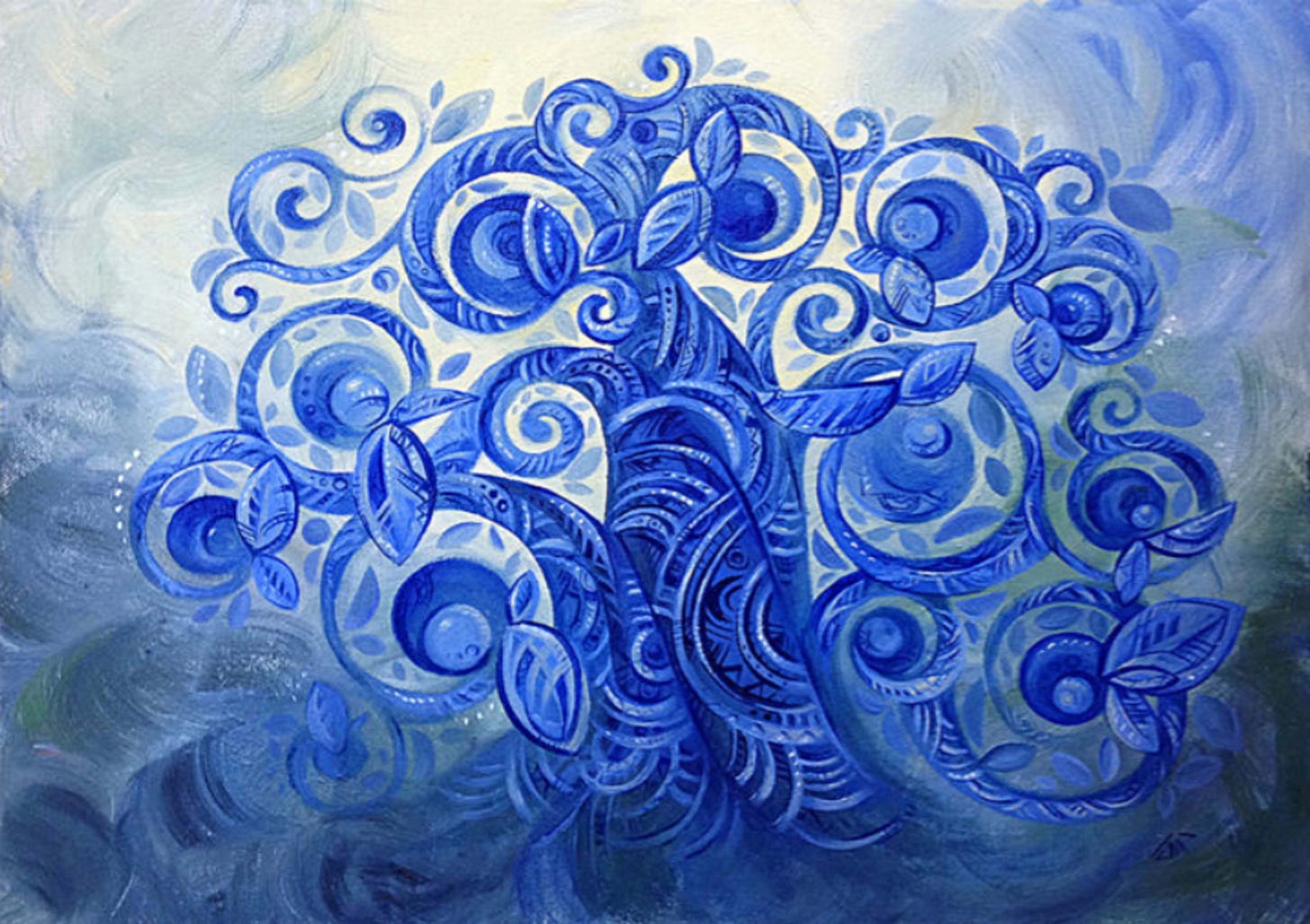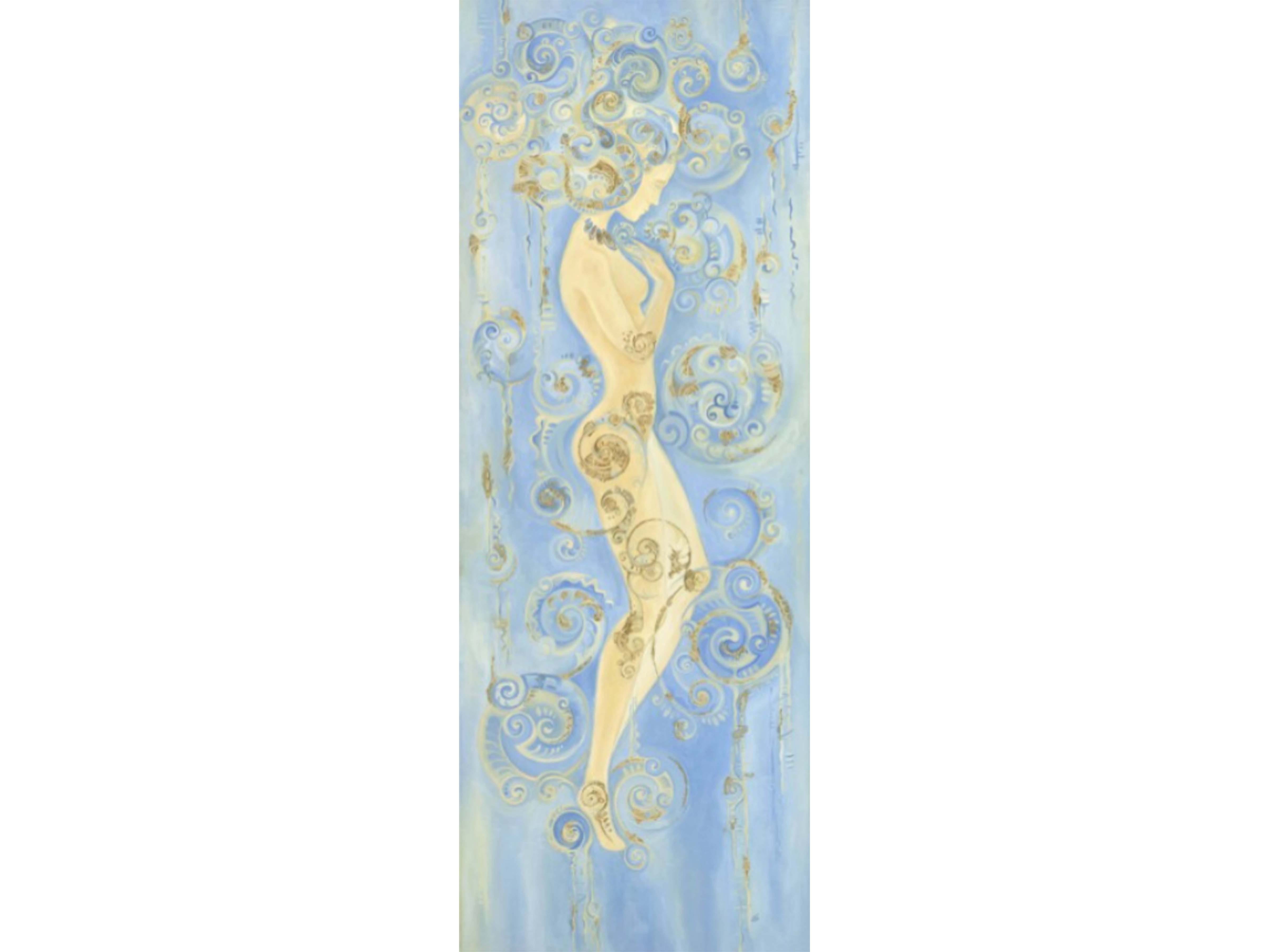 The paintings are reminiscent of the art nouveau art movement during the era of the first World War with ornamental linear qualities and colorful design but with a contemporary color palette, postmodern subjects, and Yulia’s unique style. Some of the paintings deal with the information age with backgrounds which resemble circuit boards while others appear more traditional, seemingly inspired by Slavic folk art. There even remains a few elements of pop art with bold colorful forms heavily defining a background or figure. The mash up of various influences creates a body of work which reflects an ambitious approach to create new notions of design elements in contemporary painting. Seemingly elegant and full of life, the paintings usually reflect feminine beauty and a relationship of figures with designed surroundings, containing backgrounds usually fused in consistent patterns with the forms of the figure.