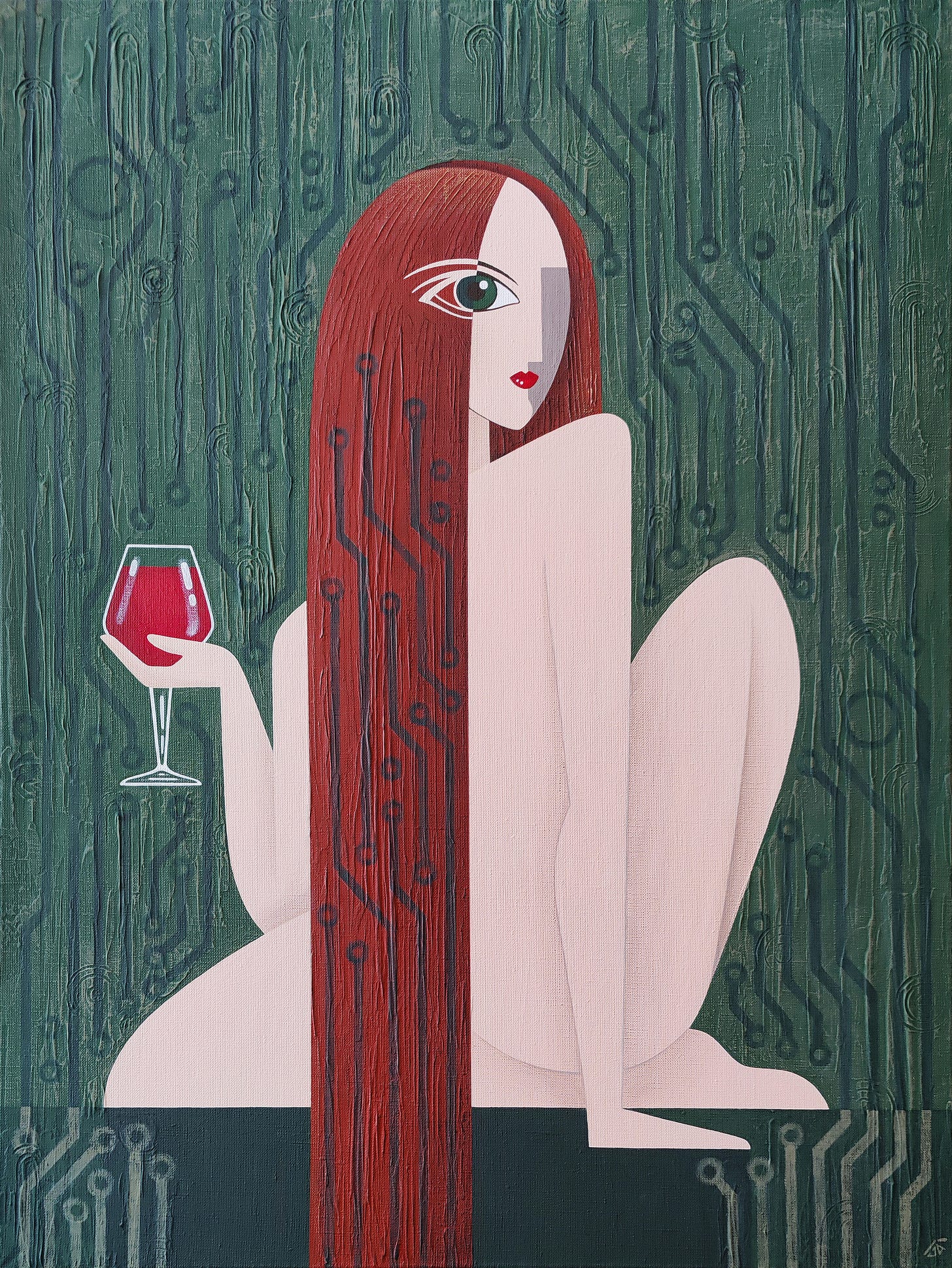 Found Zen (pictured above) and Pleasant Fatigue of the Past Day, Grey Background (pictured below) are paintings in Yulia’s body of work which deal with stylized female figures containing circuit board-like backgrounds in a series titled The Physicality of the Information World. These works portray “information warfare” and ”‘information fatigue” according to Yulia. These digitized paintings appear to show various moods of women from meditative to weariness to disturbance. The figure’s emotional state remains not so much in their stylized faces but in their composed body language from performing yoga to sipping glasses of wine sitting relaxed or stressed out on the floor. The women’s faces are represented by one large eye, a solid color shadow, small red lips, and streaks of circuit boards in their hair. Extending to almost the size of their bodies, the women’s hairs act as anchors creating a central vertical focal point for the composition. These series of works reflect contemplation of design relationships with figurative elements.