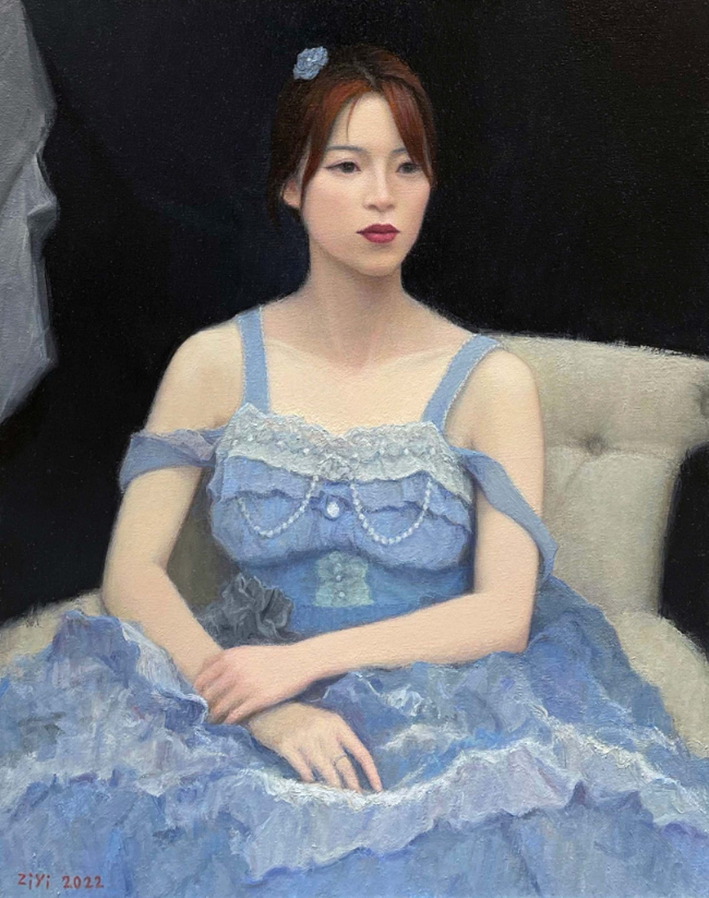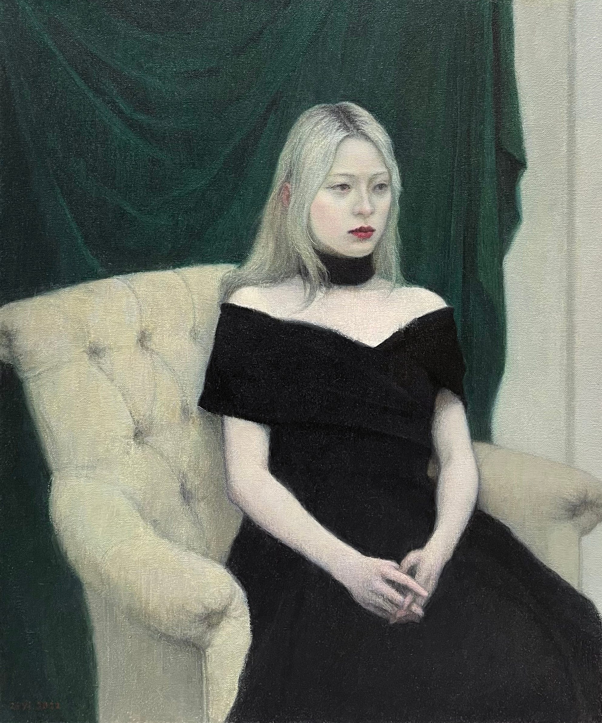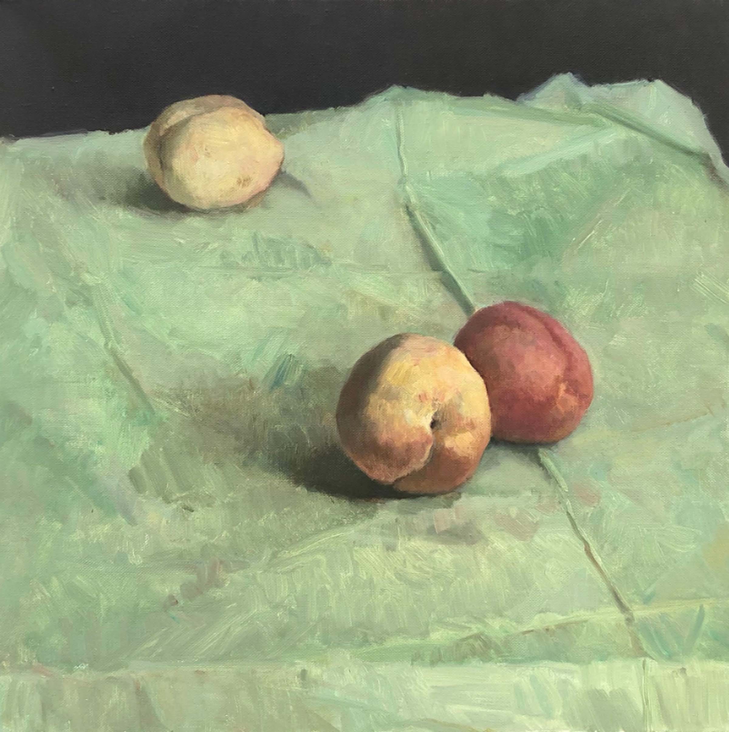 The psychology in Ziyi’s figurative paintings consist of calm subjects dressed in formal contemporary attire with a mix of geometry or a plain monotone background. With relaxed postures and facial expressions, Ziyi expresses a clean, pristine surface with slightly off-centered composition and large infusions of neutral tones. The colors are quieted down as every hue seems to be simmered with laces of grays, whites, and earthy flavors. Still lifes such as Peaches on Green Cloth (pictured below) reflect an unusual brightness of color within Ziyi’s palette. The peaches become vastly separated in odd numbers showing an appreciation of distance, without crowding the composition. Our eye remains guided through a triangular circulation of the peaches along with the subtle corner angle of the table reaching towards the edge of the canvas.