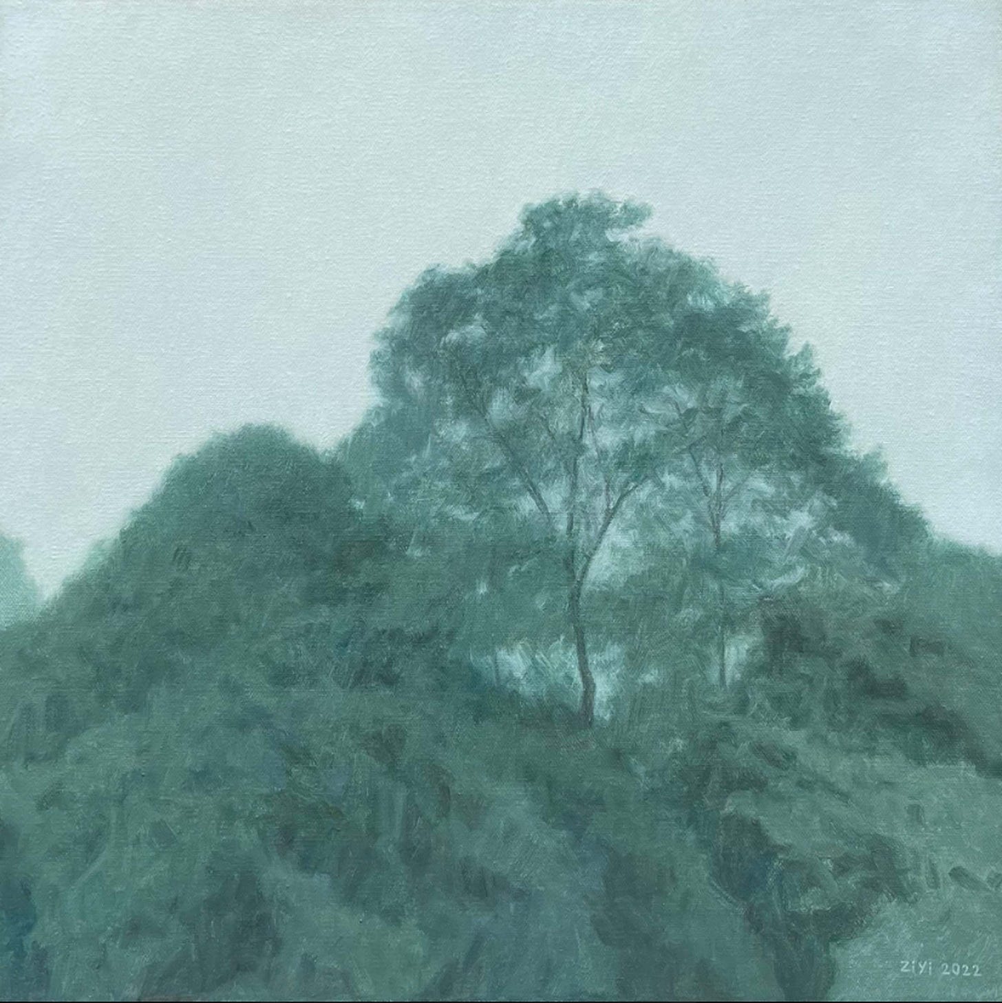 Hollow Mountain No.16 (top of article) captures Ziyi’s delicate eye most precisely with variations of viridian green mixed with multiple applications of yellow and white. The pine trees subtly pop up through the extreme angle of the overhead painting until directing the viewer’s eye towards the lone epic pine tree, standing to the right towering over the rest of the landscape. Monumental yet poetic, the lone tree stands as a symbol of strength and contrast against a vast landscape of paleness.